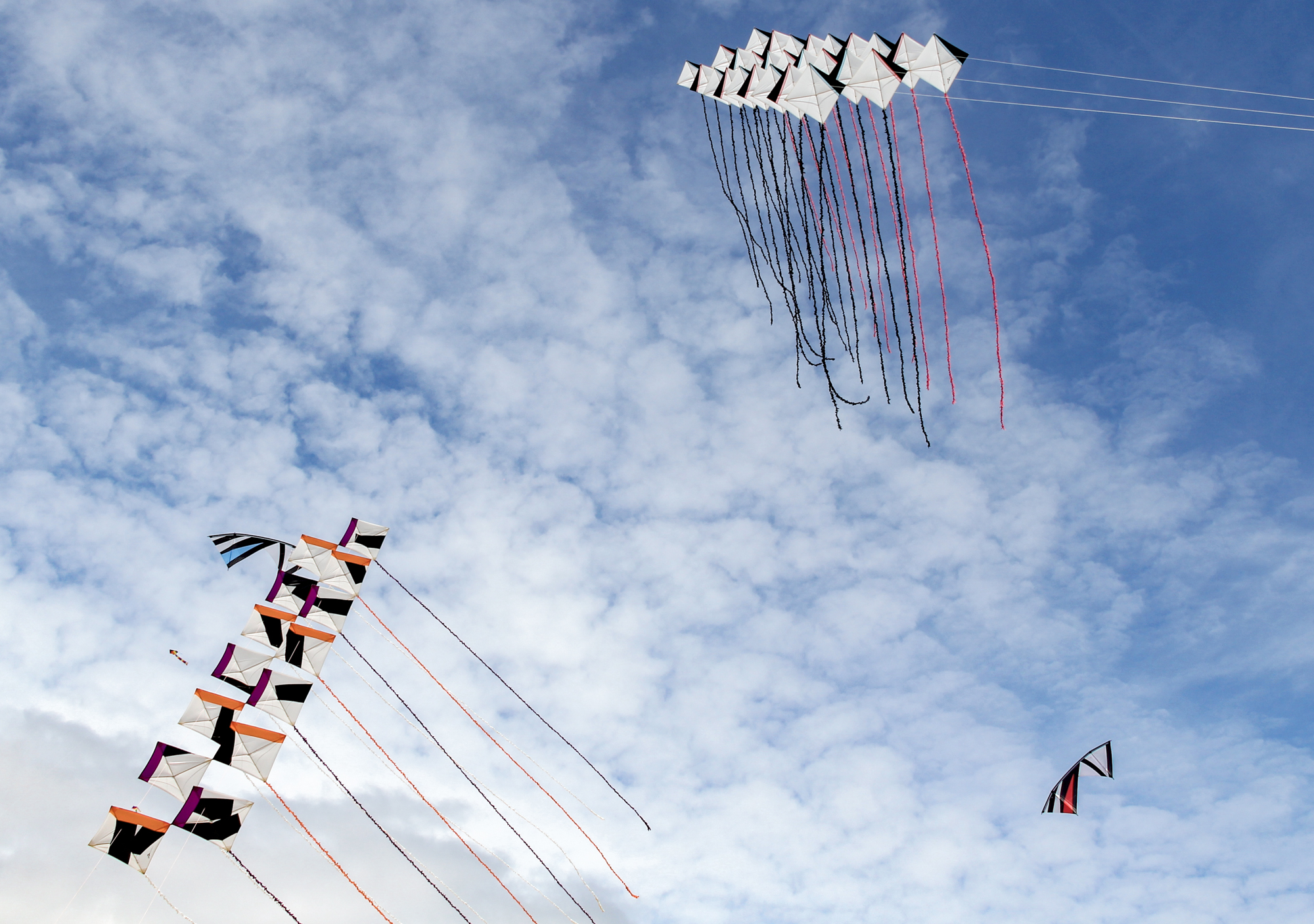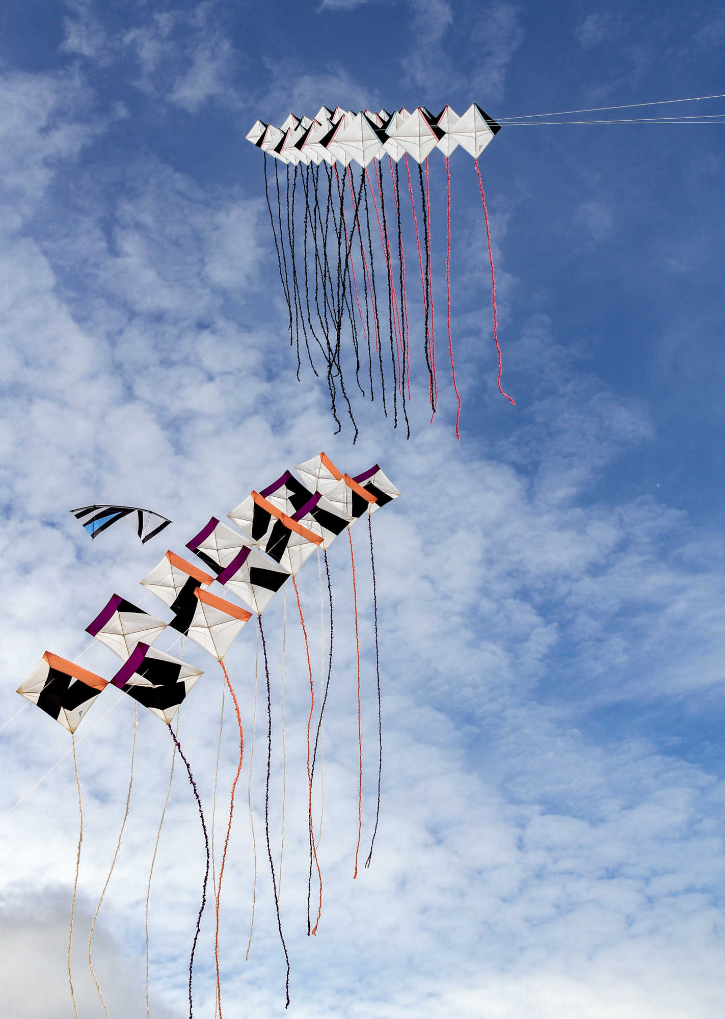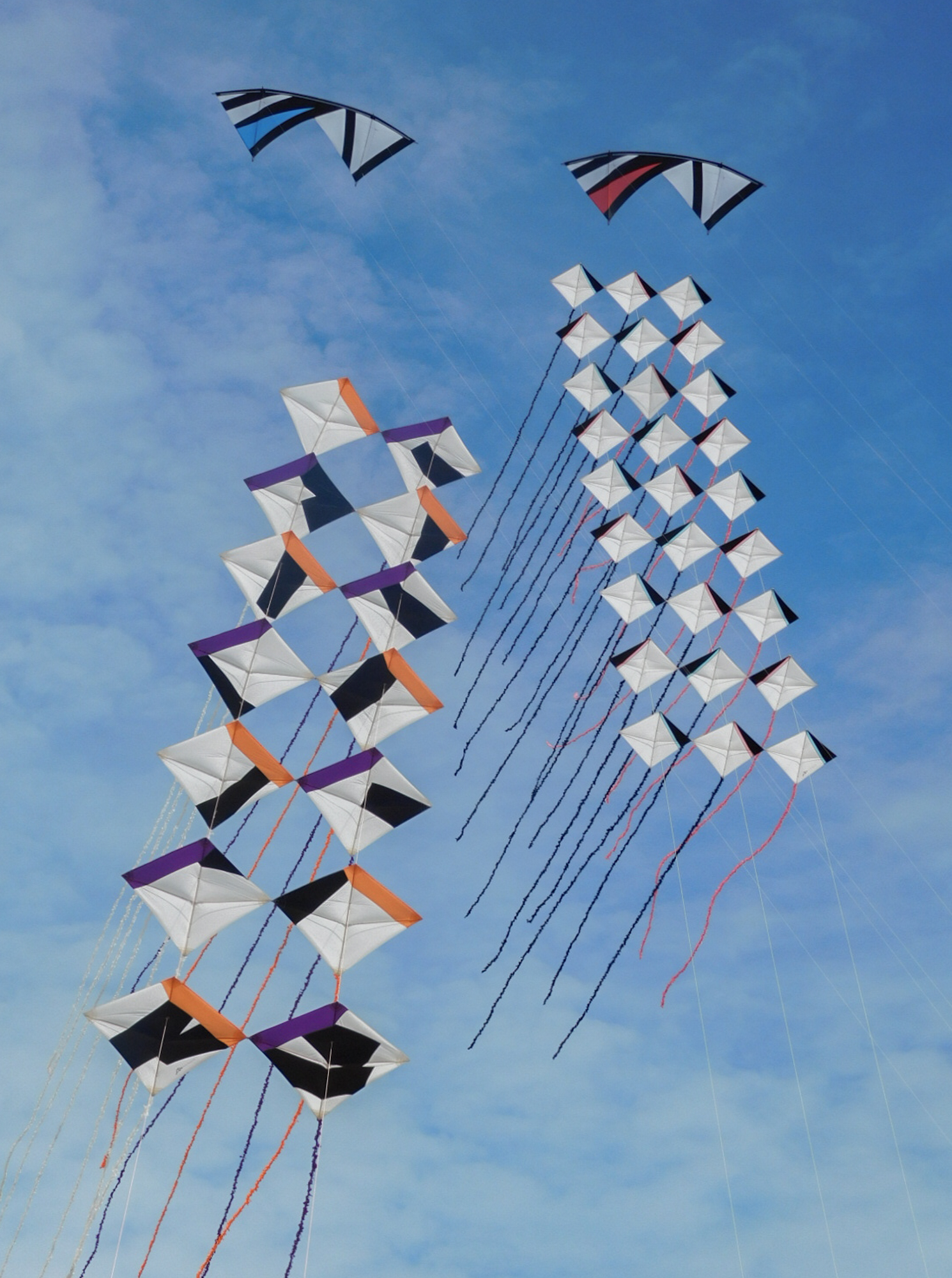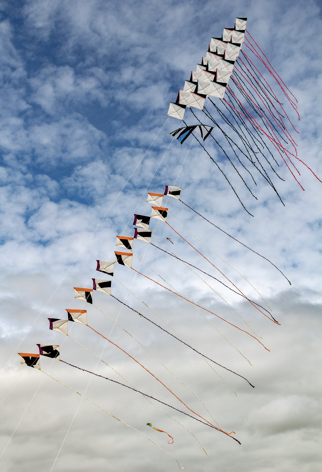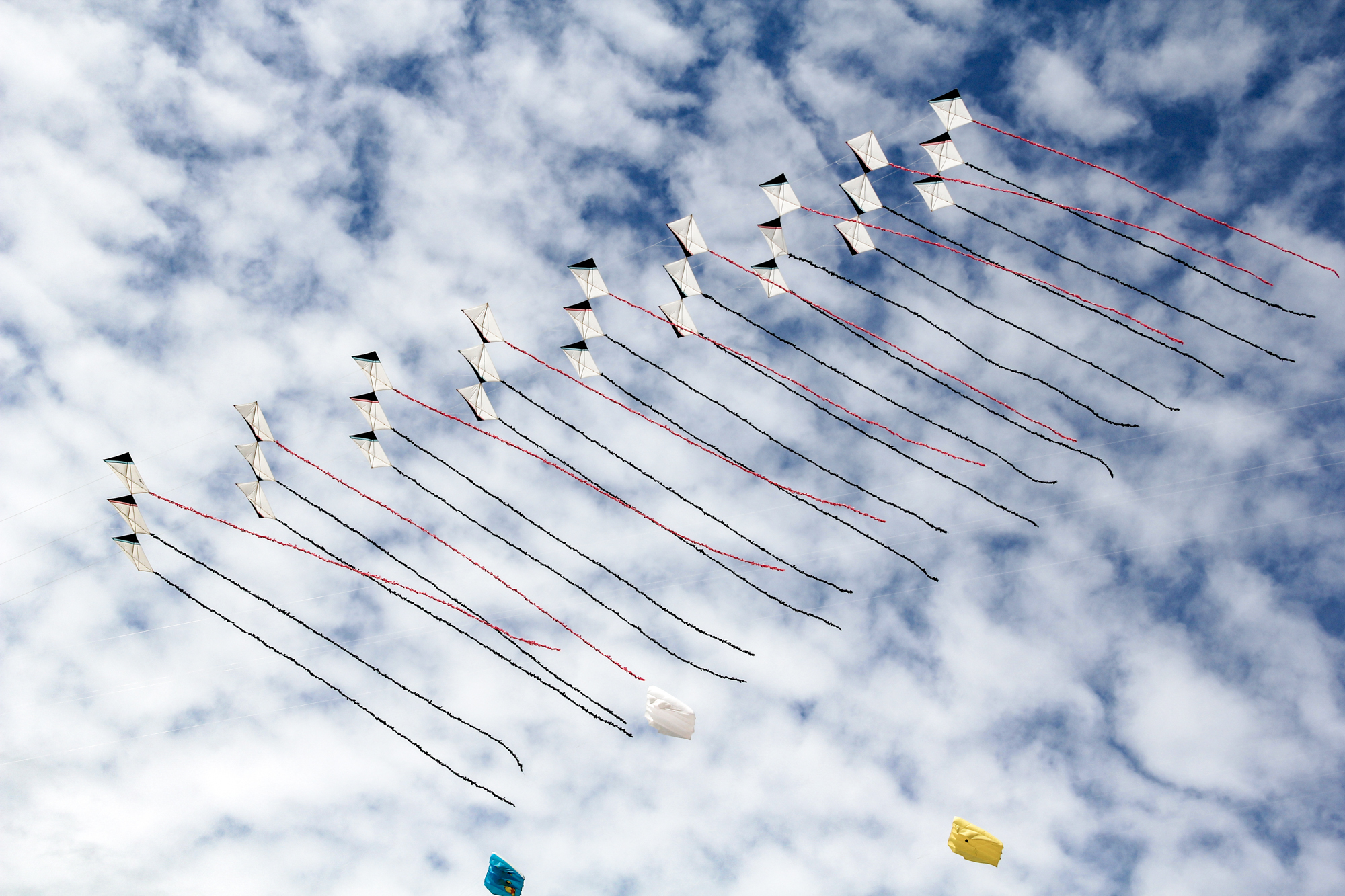 The smaller Parafoil was launched first followed by the stack of Rokkakus which were stabilised with a black lifter kite. The larger parafoil was then launched and the two Revolution kites then took up position.