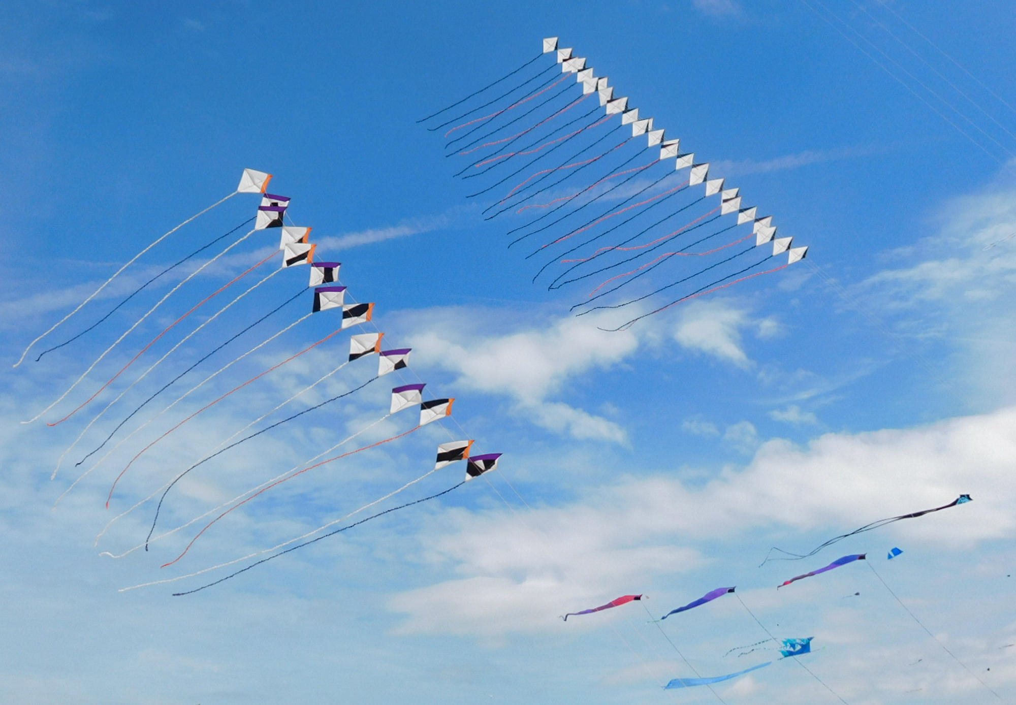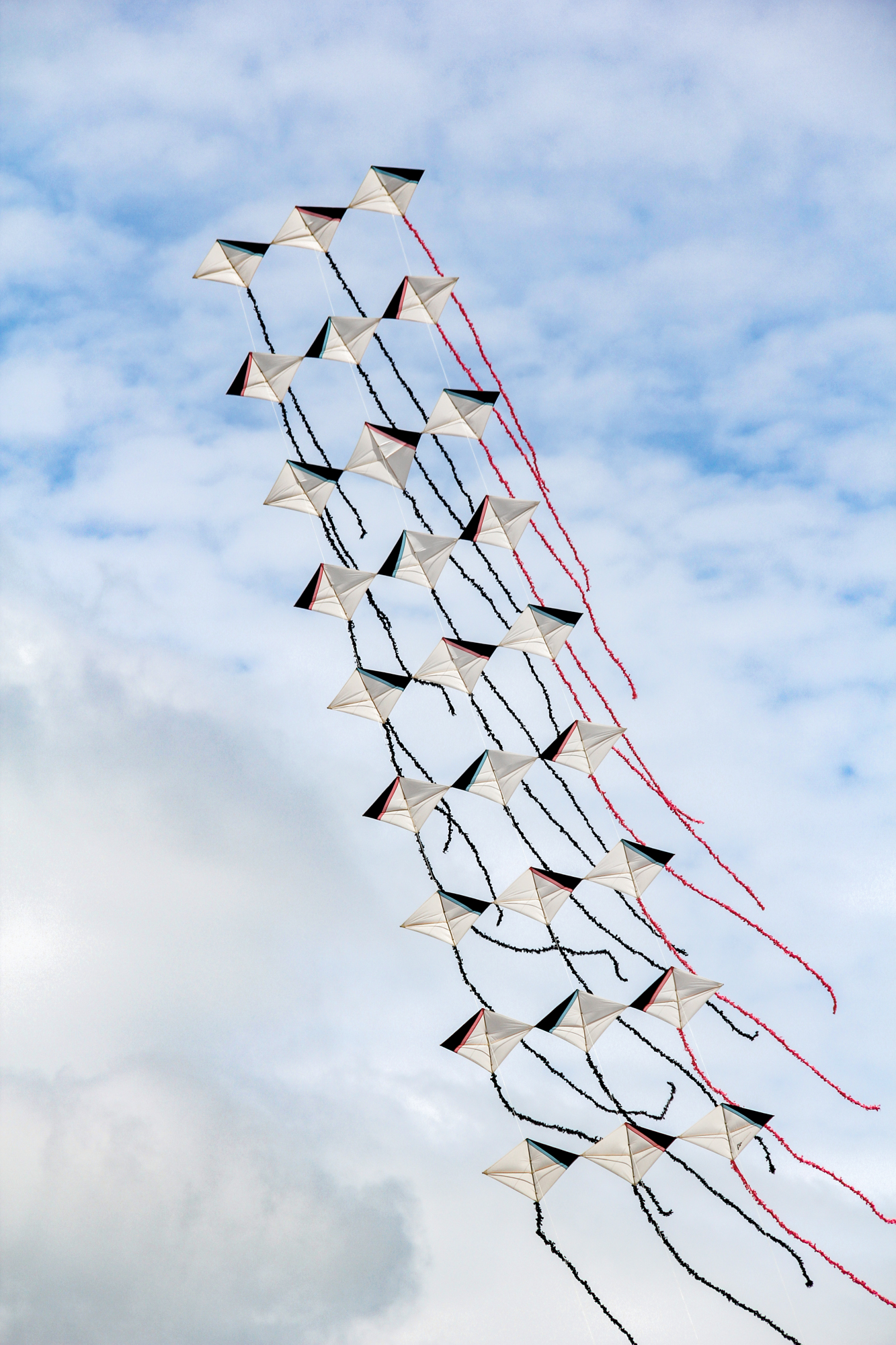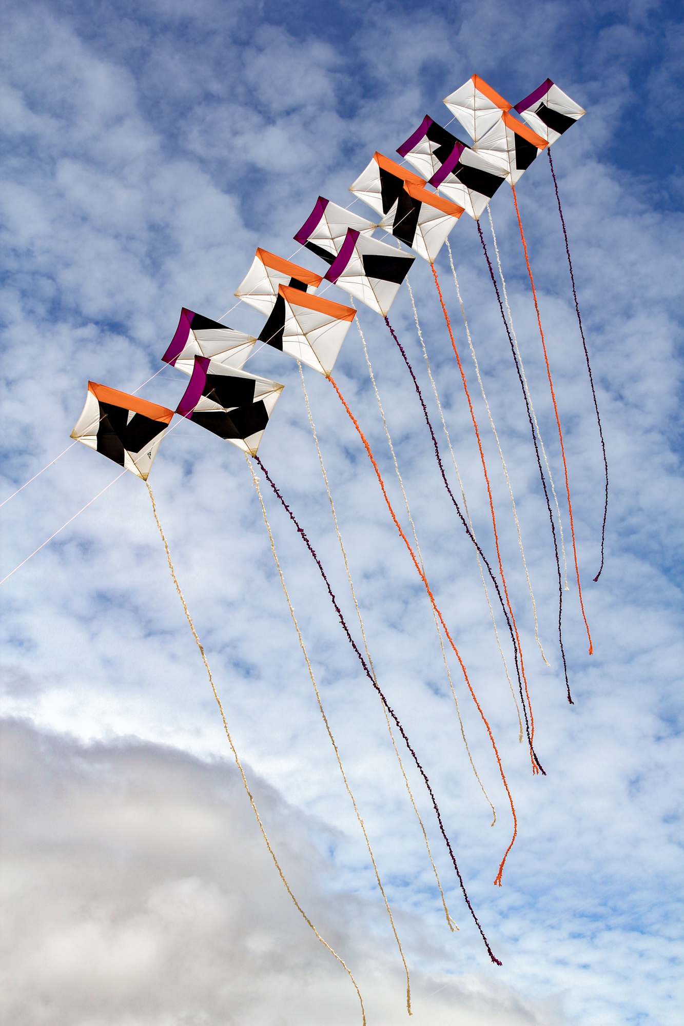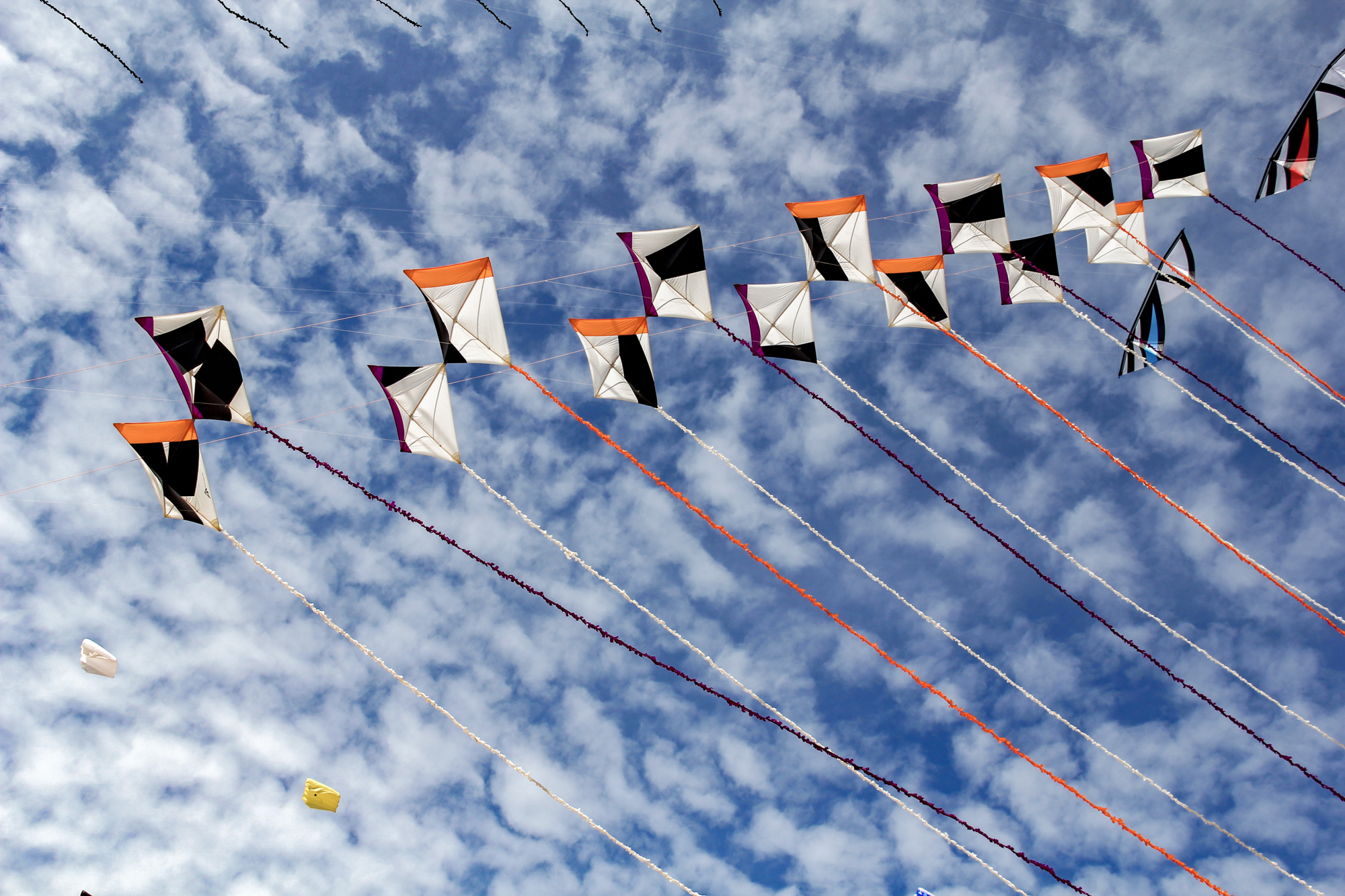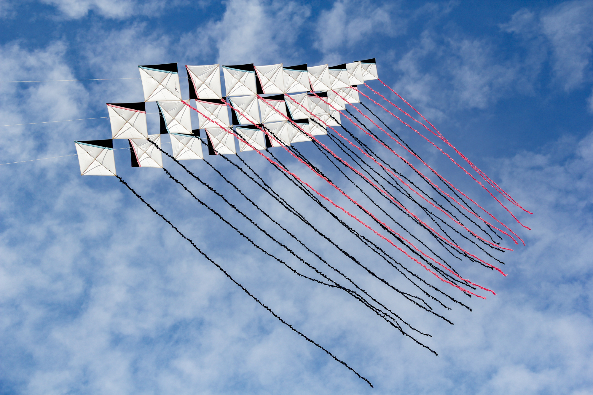 The smaller Parafoil was launched first followed by the stack of Rokkakus which were stabilised with a black lifter kite. The larger parafoil was then launched and the two Revolution kites then took up position.
