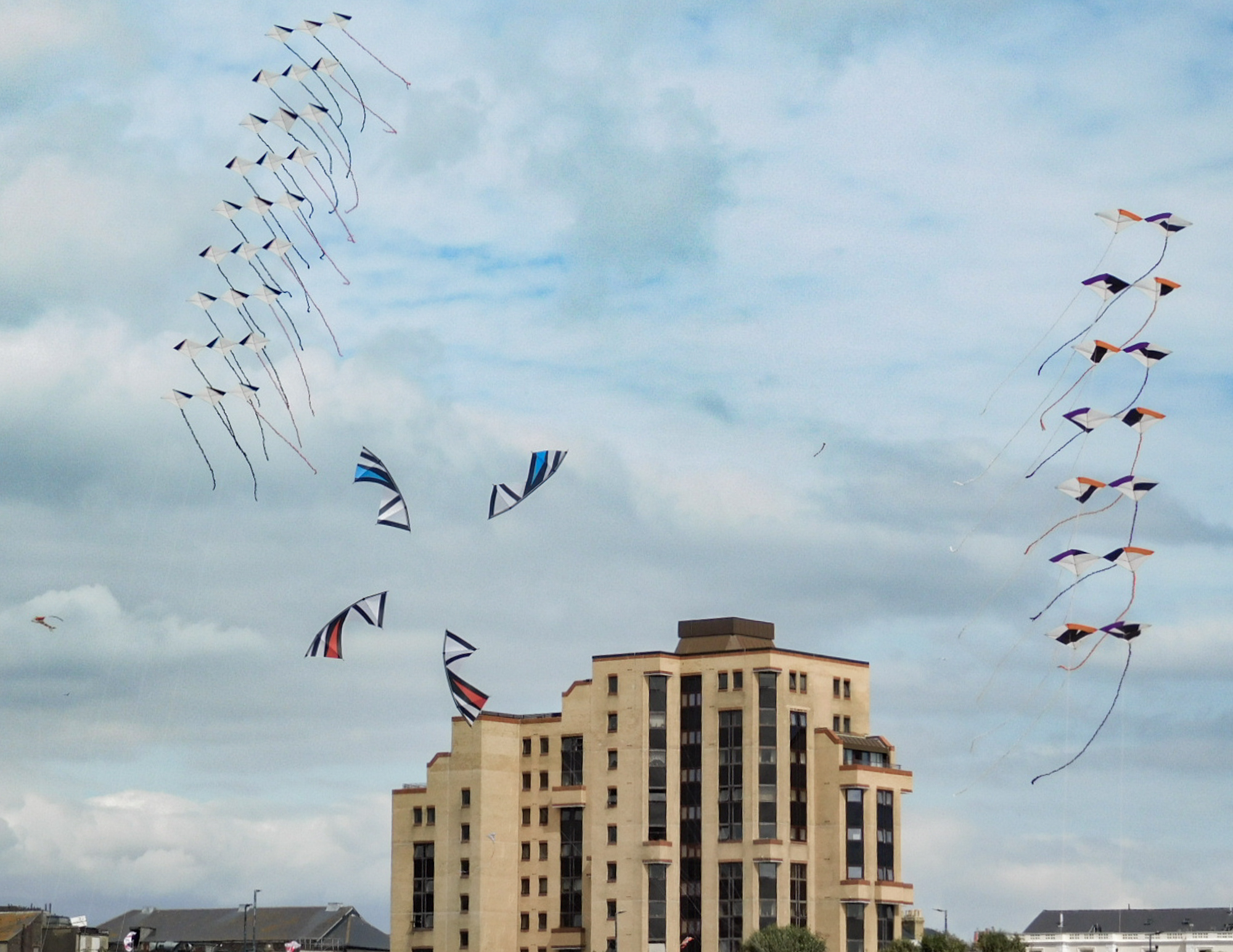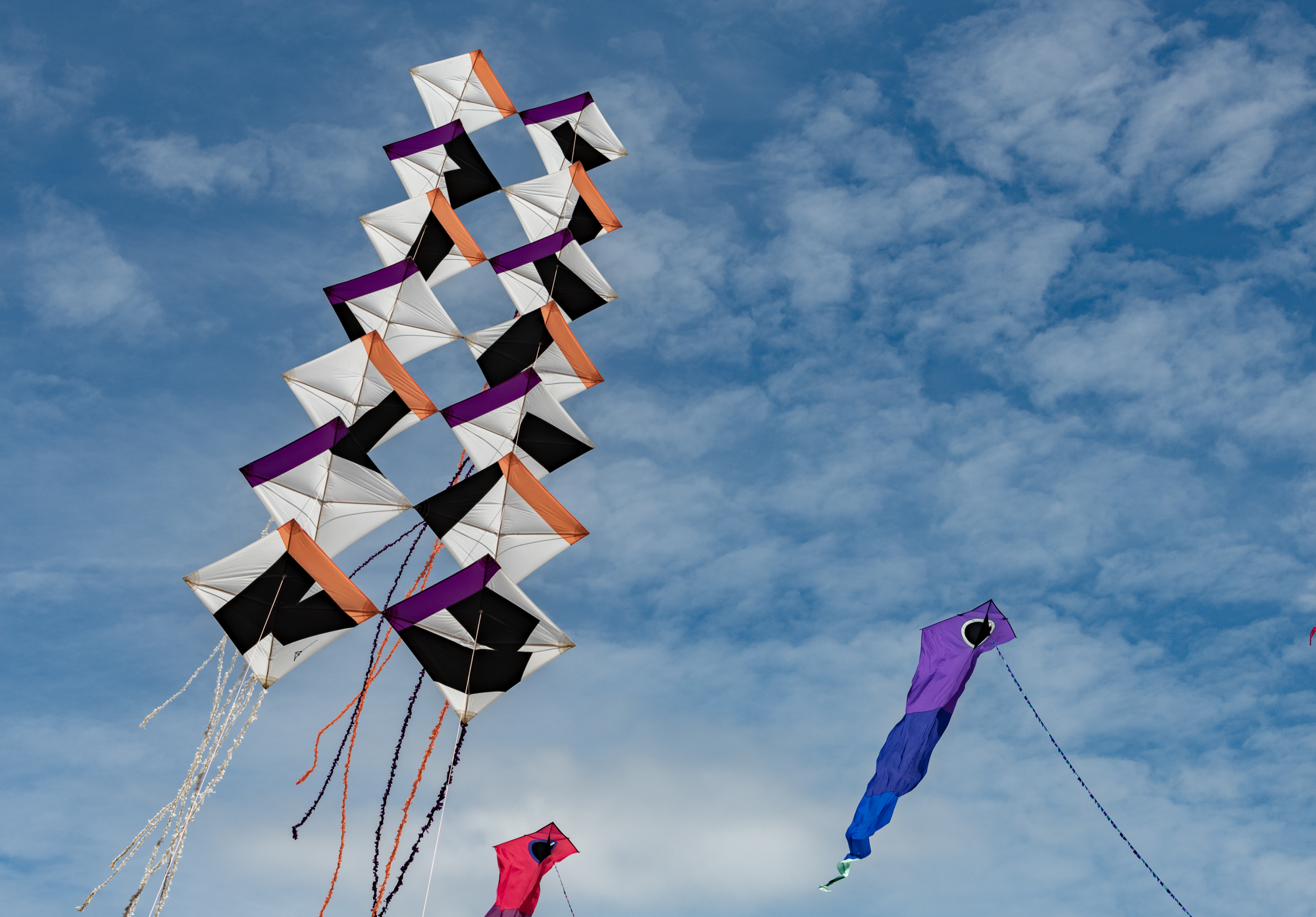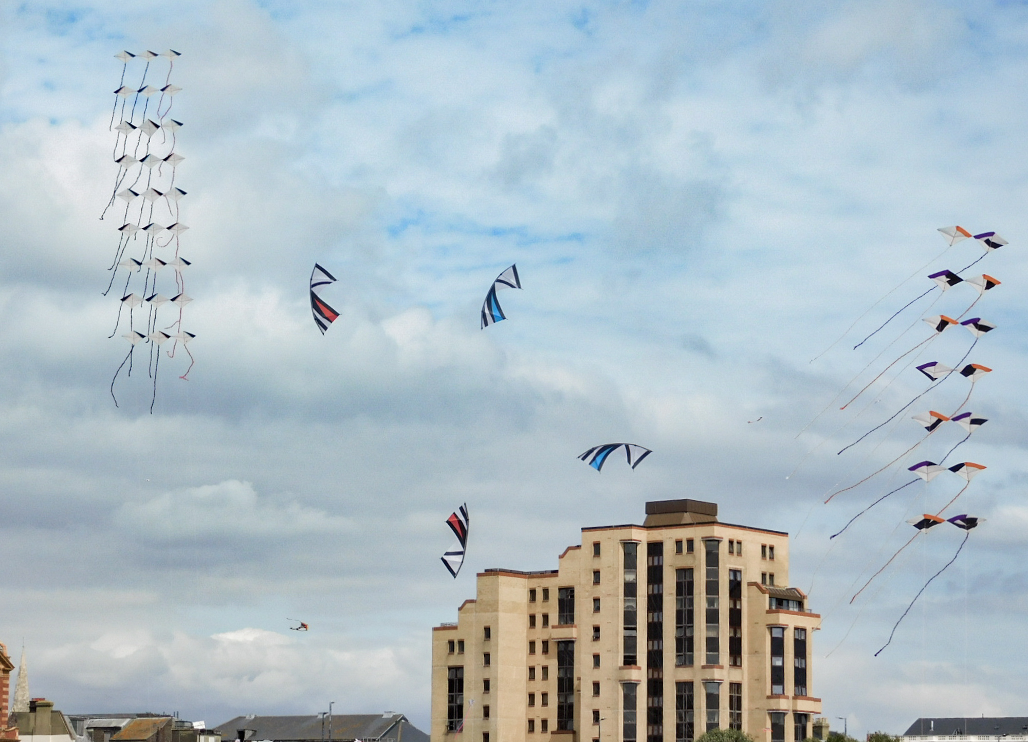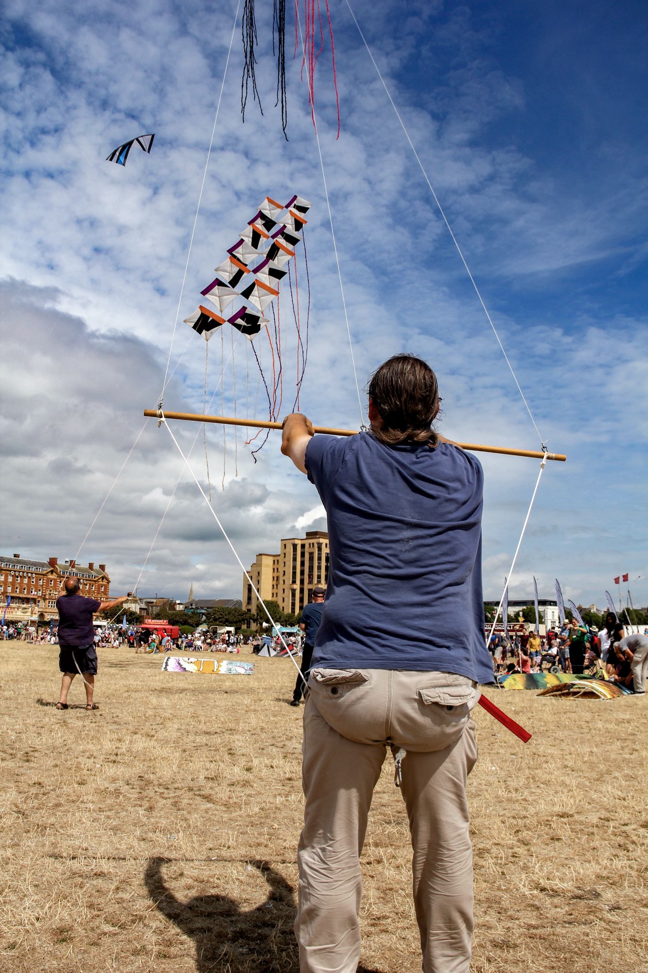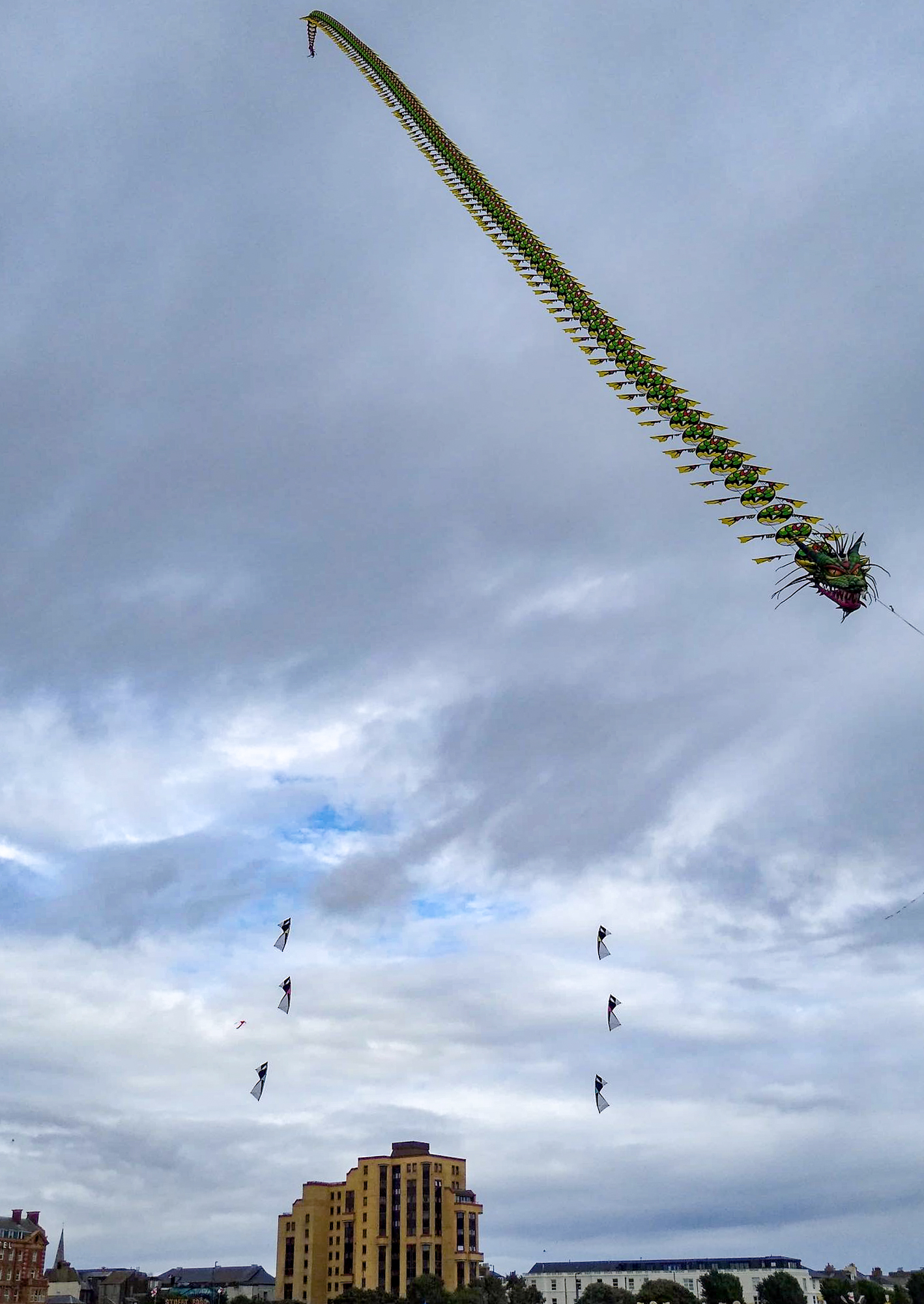 The smaller Parafoil was launched first followed by the stack of Rokkakus which were stabilised with a black lifter kite. The larger parafoil was then launched and the two Revolution kites then took up position.