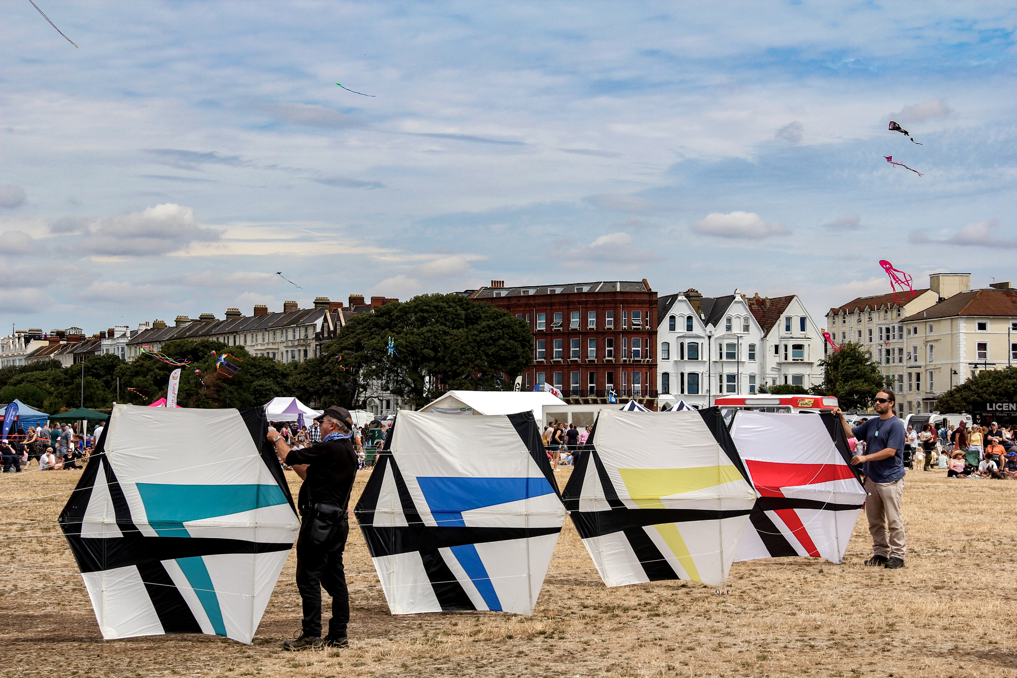 For the second session (30th July 2022) the two stacks were walked into the main arena and eventually four Revolution kites took positions in close proximity to them.
