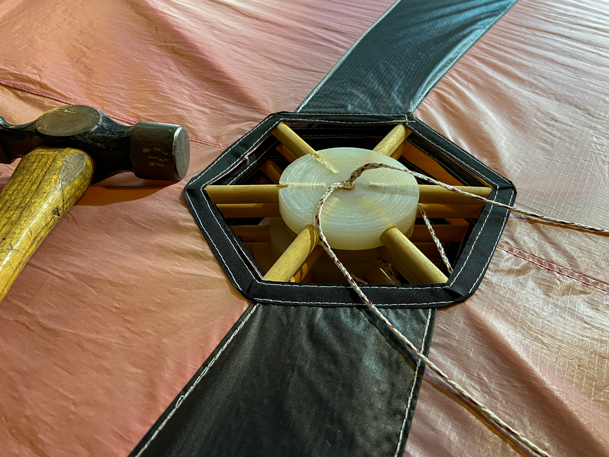 Silver gaffer tape marks final repair points for flying line attachment and punctured spar pocket.