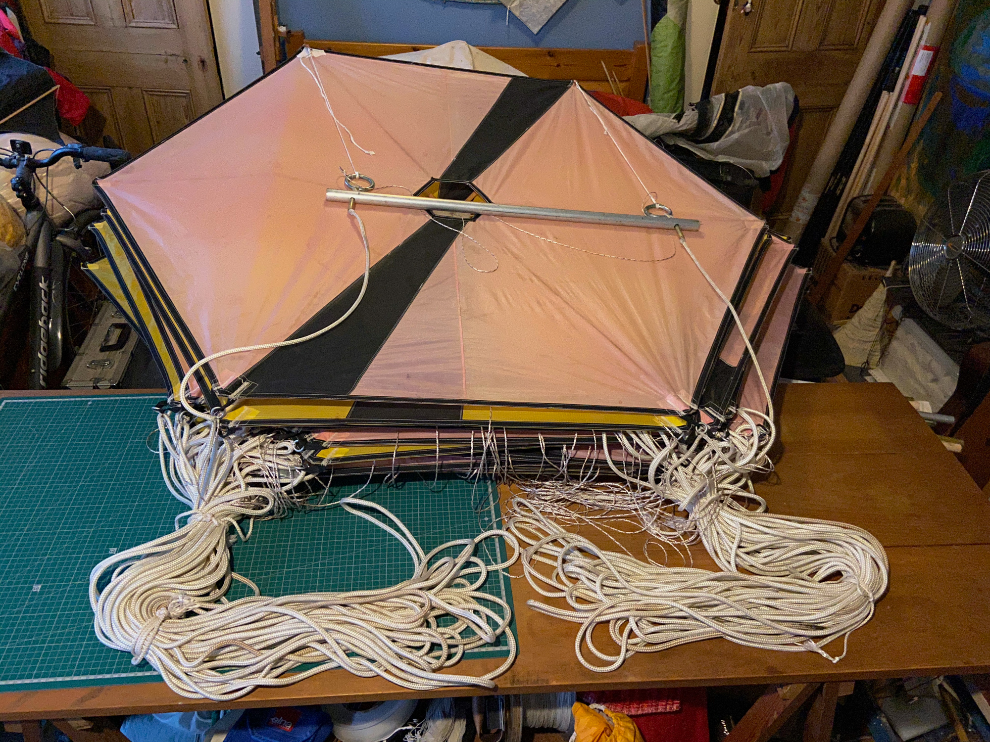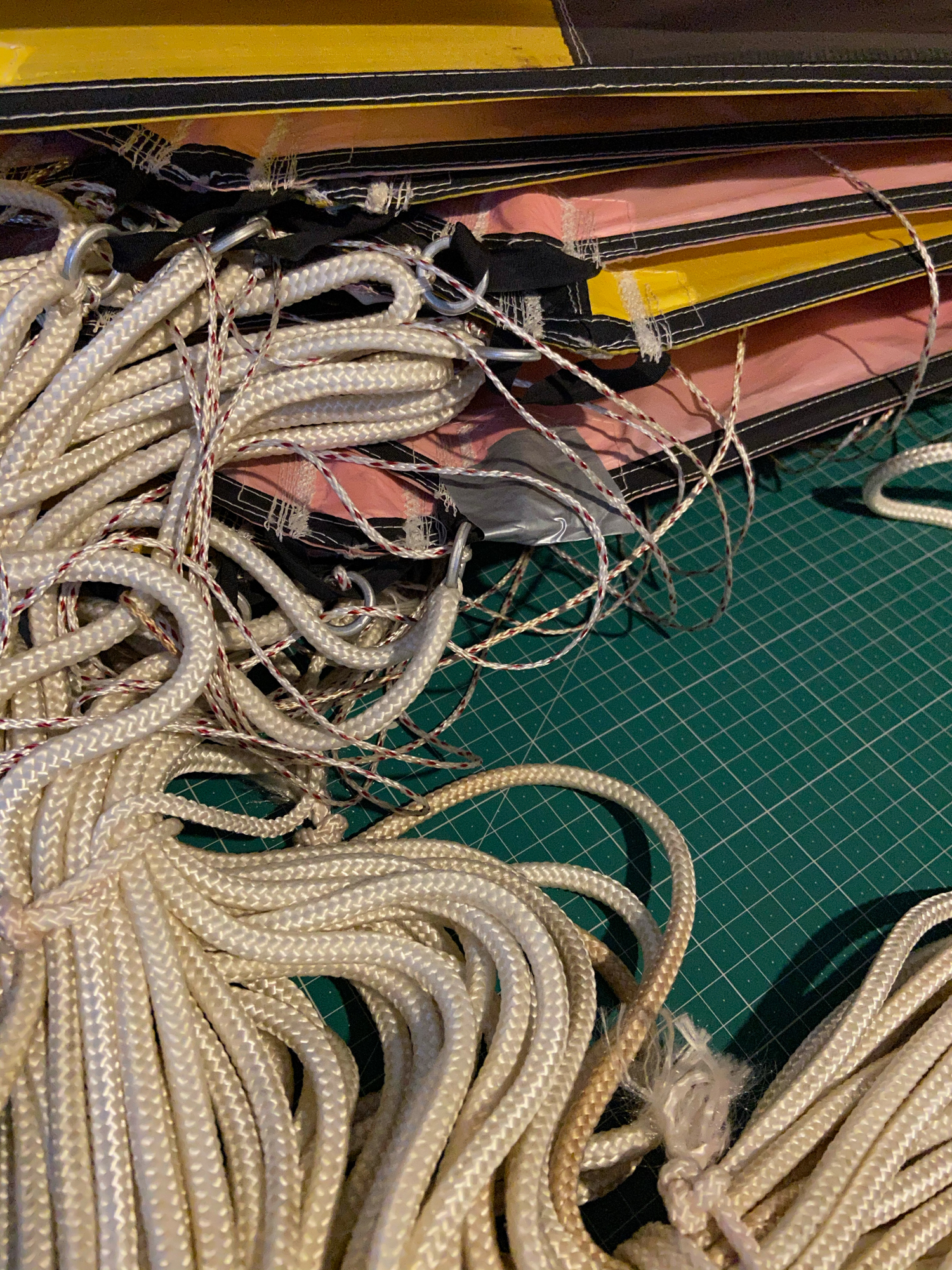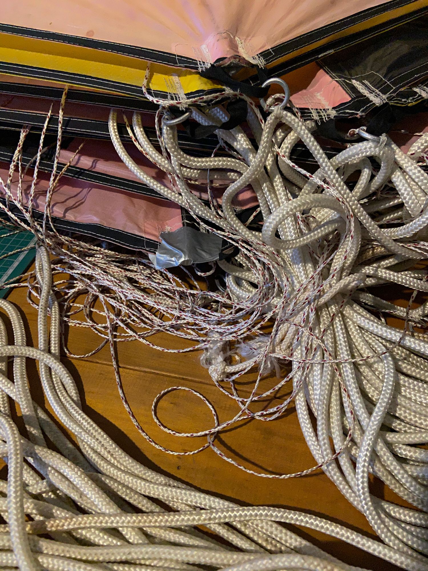 The main lines had been tied on the field and the bridle lines were looped in. In order to find the un-attached bridle loops everything had to be untied, not least, the apparent knots.