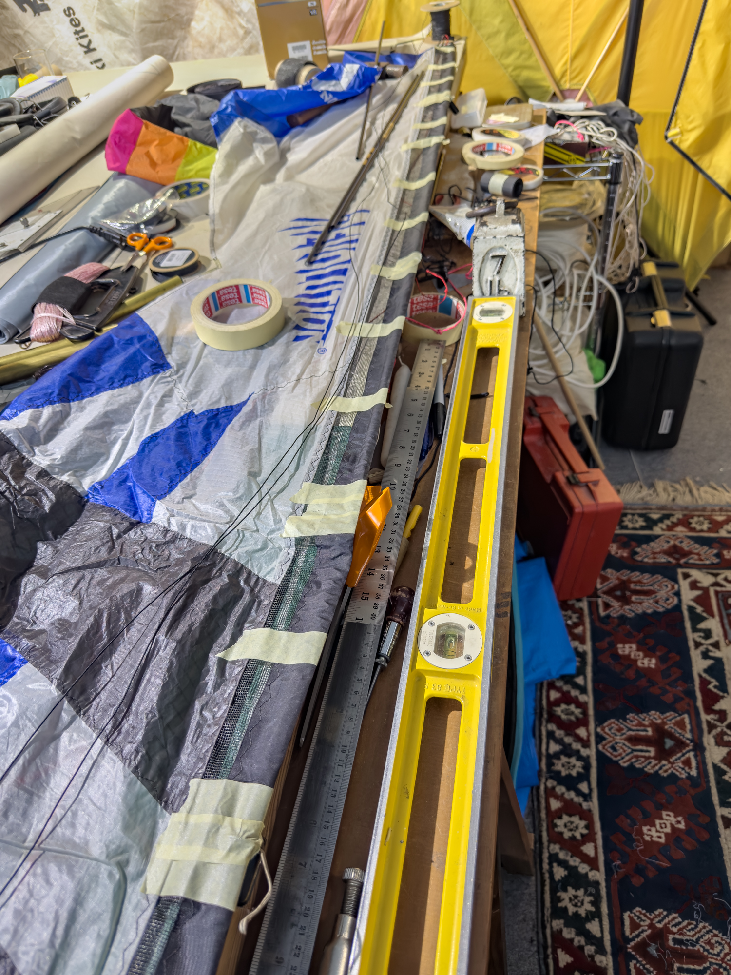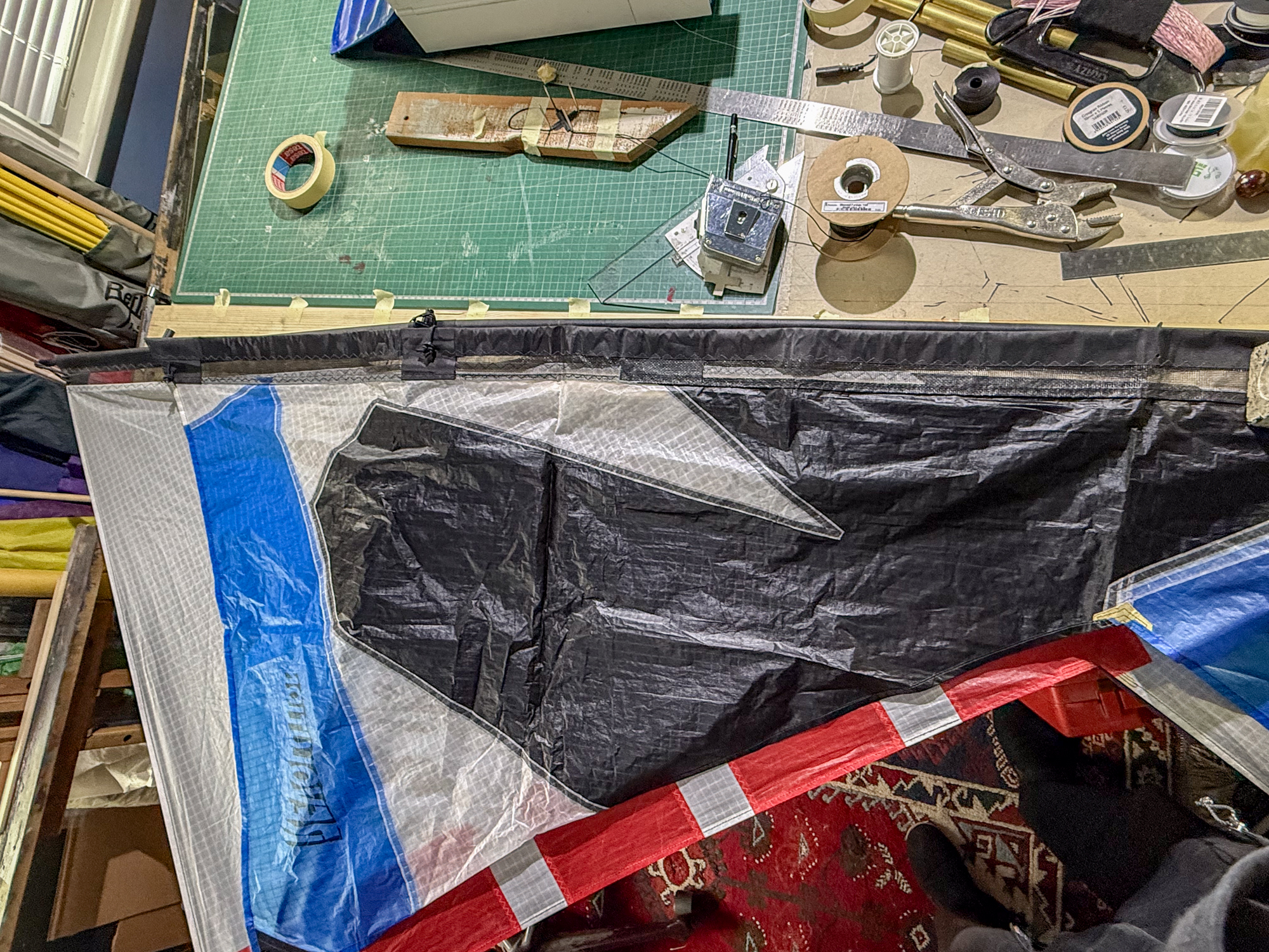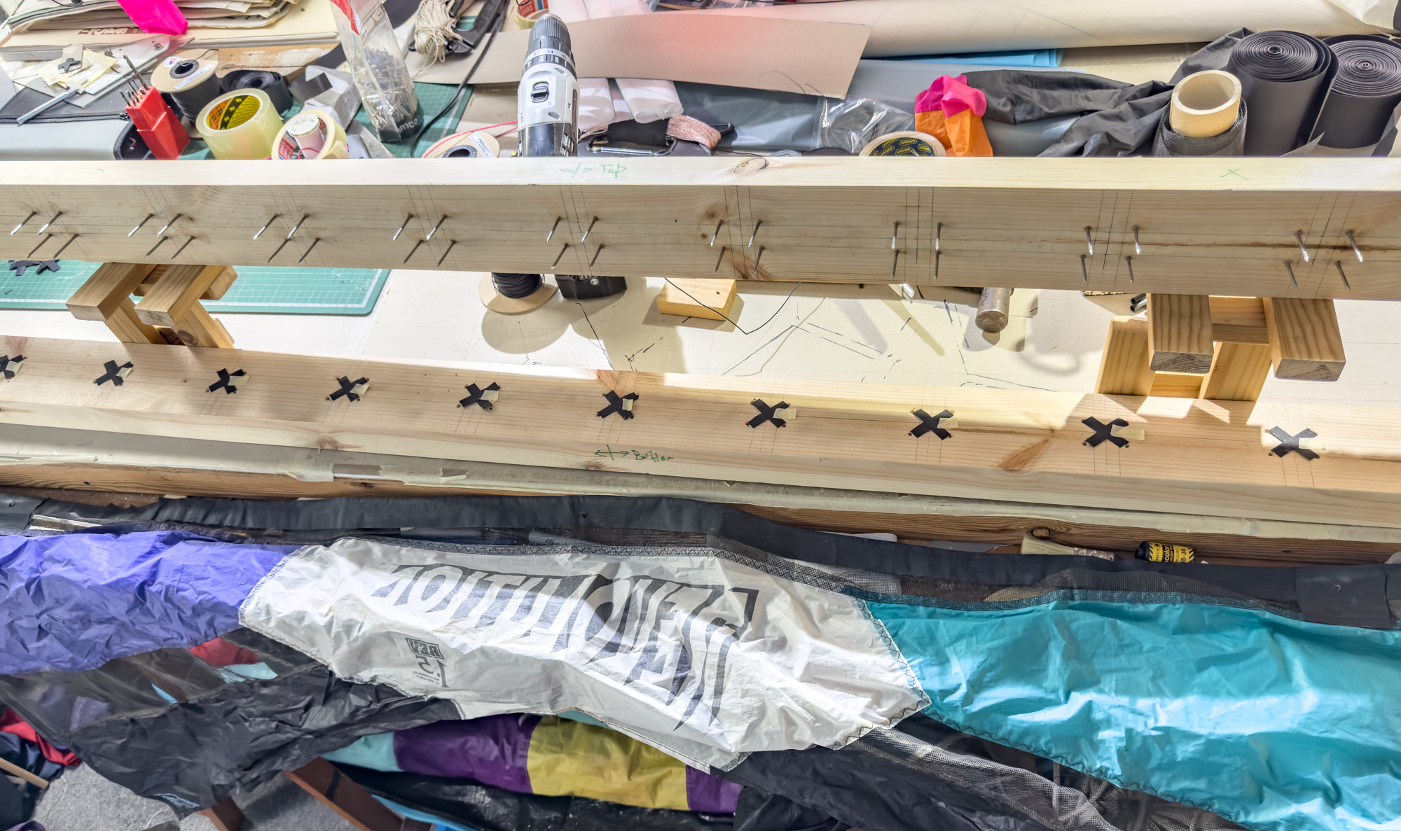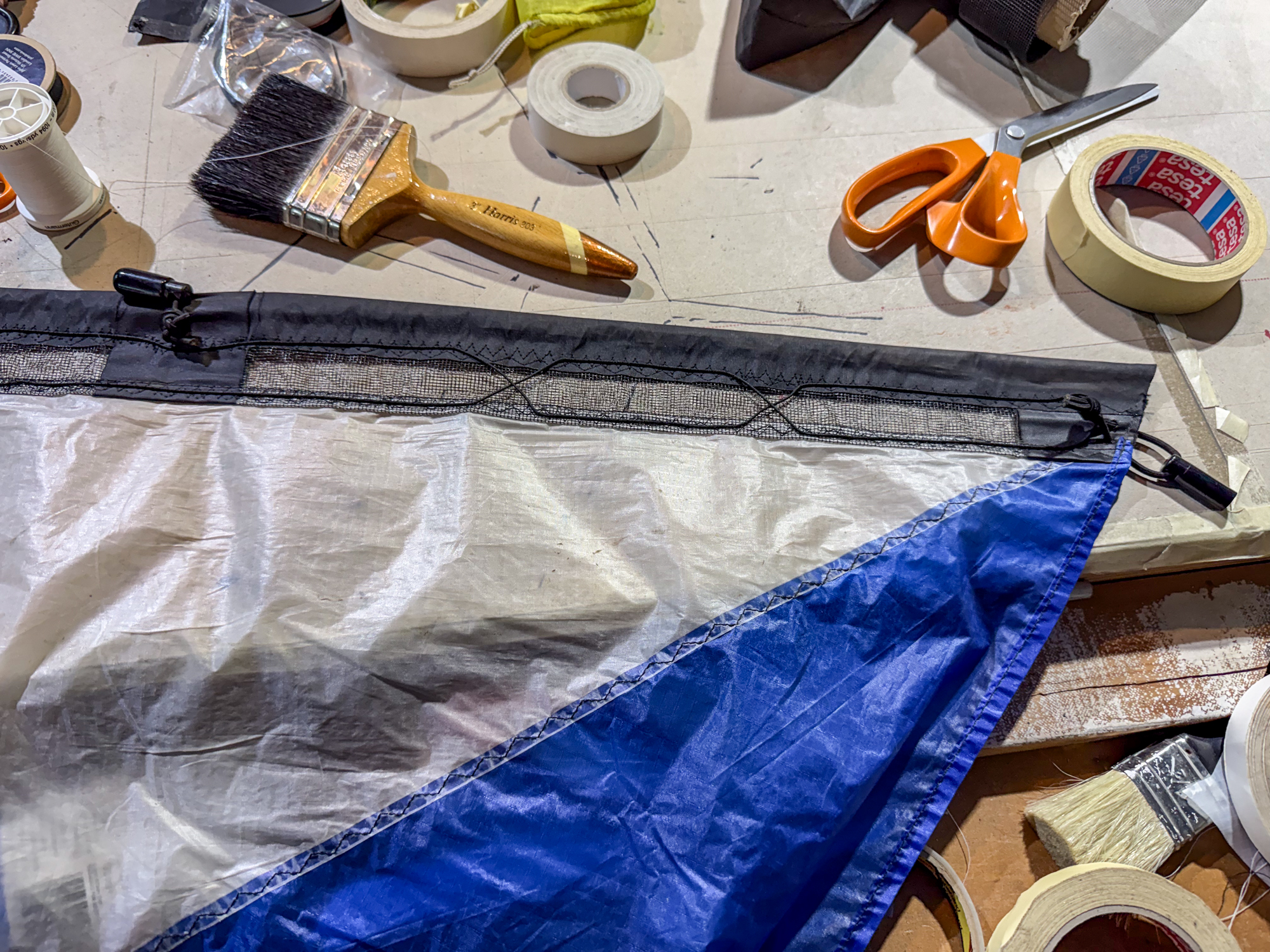 The possibility of retaining the 'X' but adding a dacron element was prototyped and it was recognised that the grain of the dacron should be in line with the legs of the 'X'.