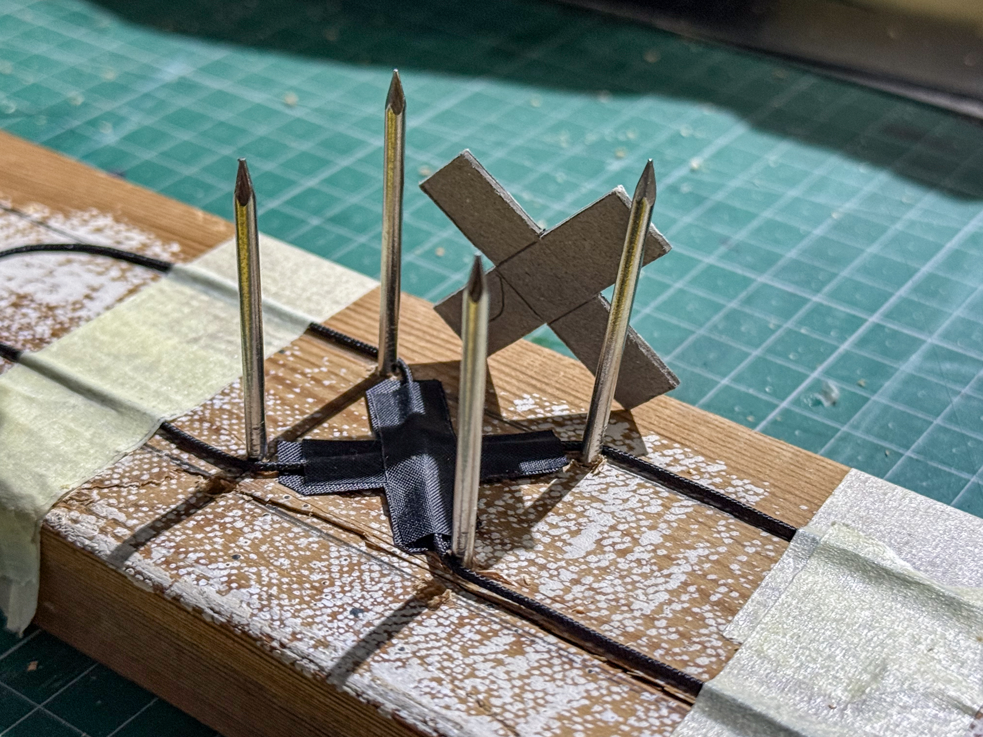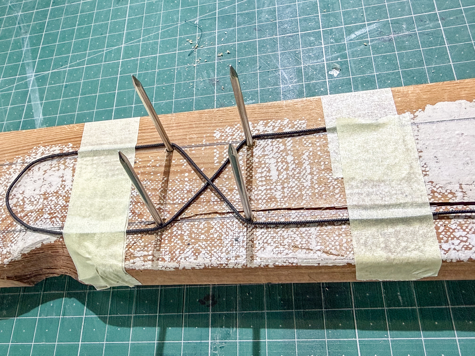 The nail heads will probably be glued in place once the lower part of the jig is aligned on the nail points.