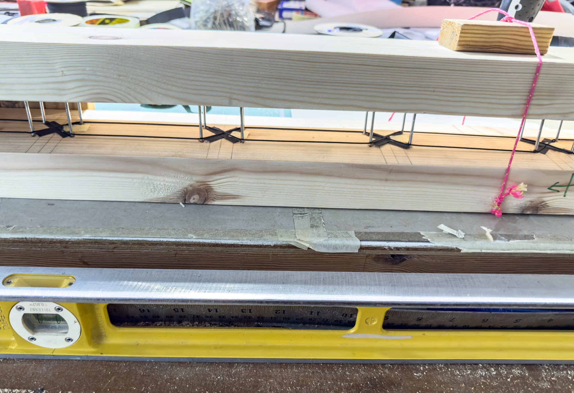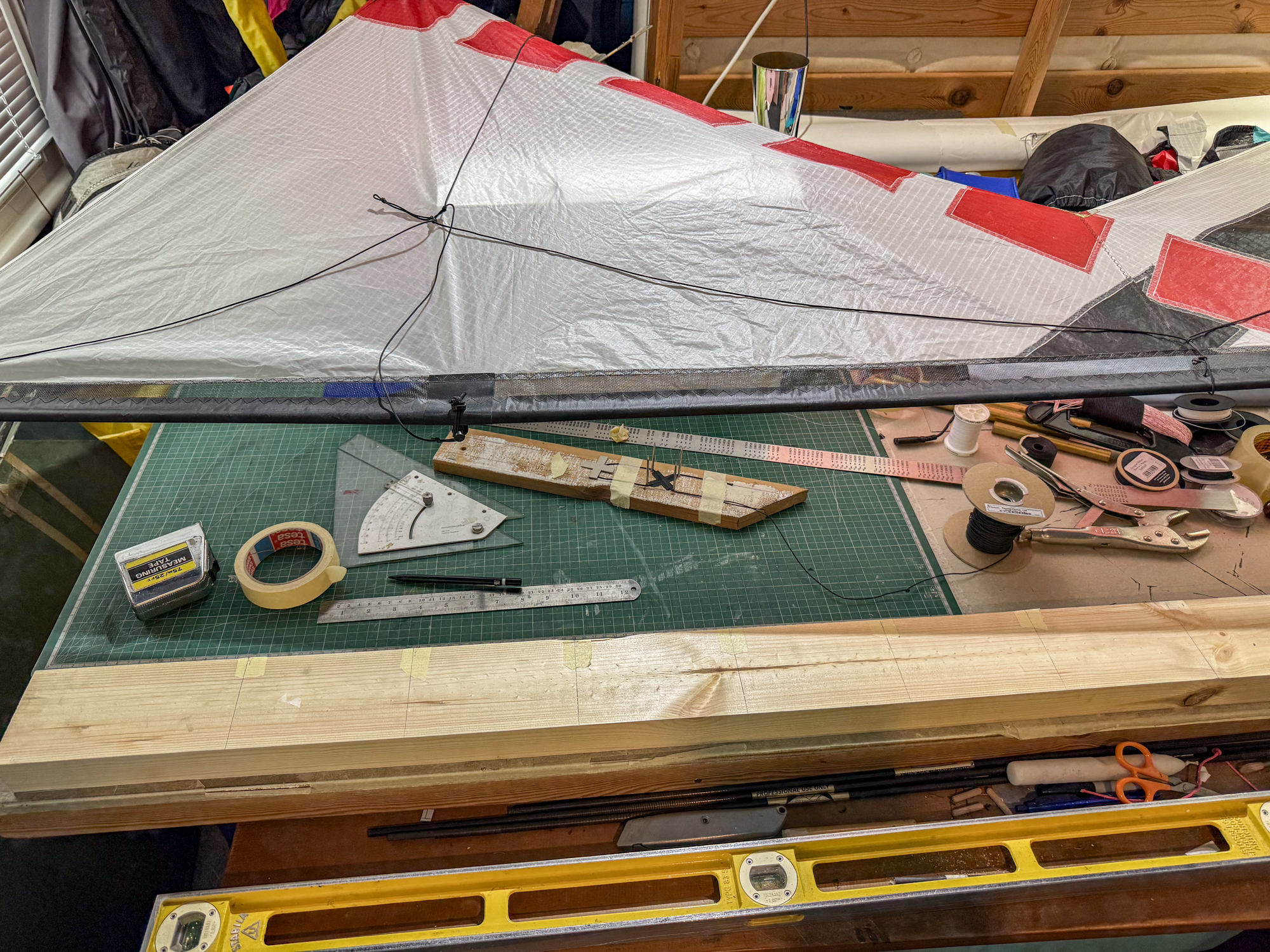 Tension was applied to the laced line and then re-set as sufficient spare line had not been allowed initially. It will have to be re-set again as the X at the vertical spar top has not been omitted.