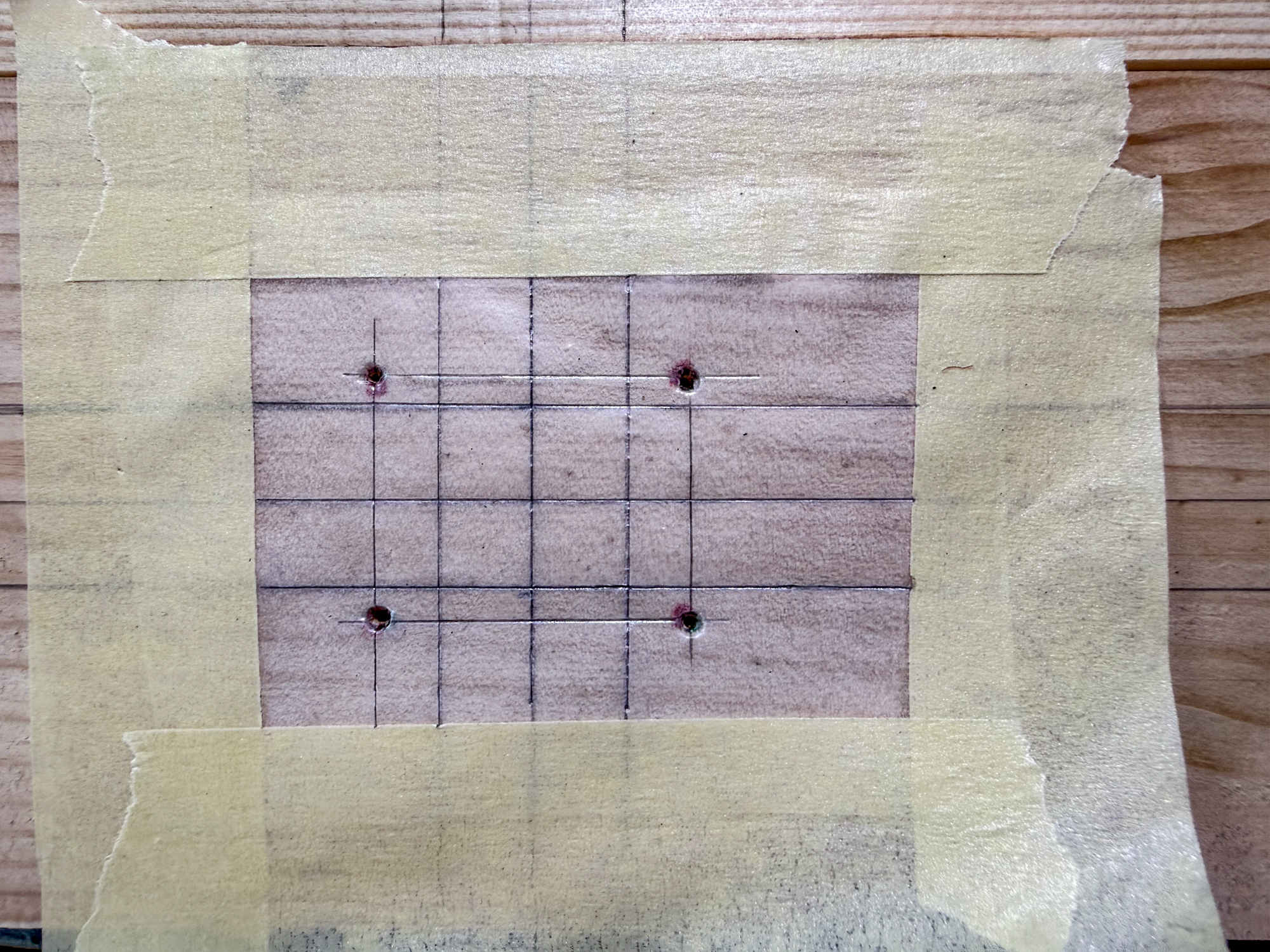 First marking up after adjusting the interval and then further guidelines added prior to marking the pin locations for drilling. A glassene template will be made to align the drilling centre points.