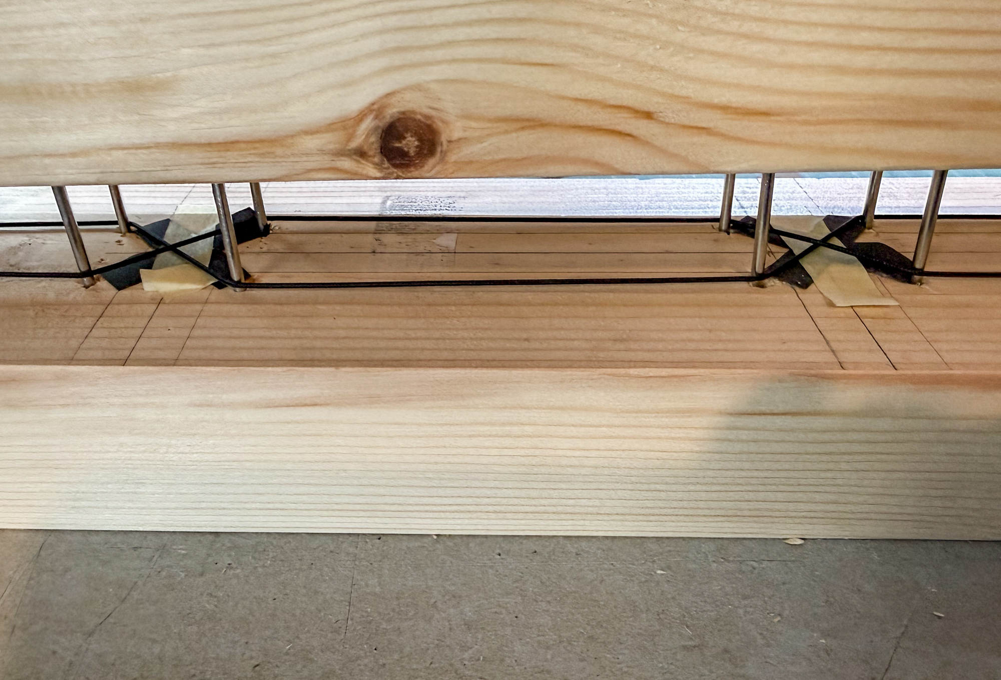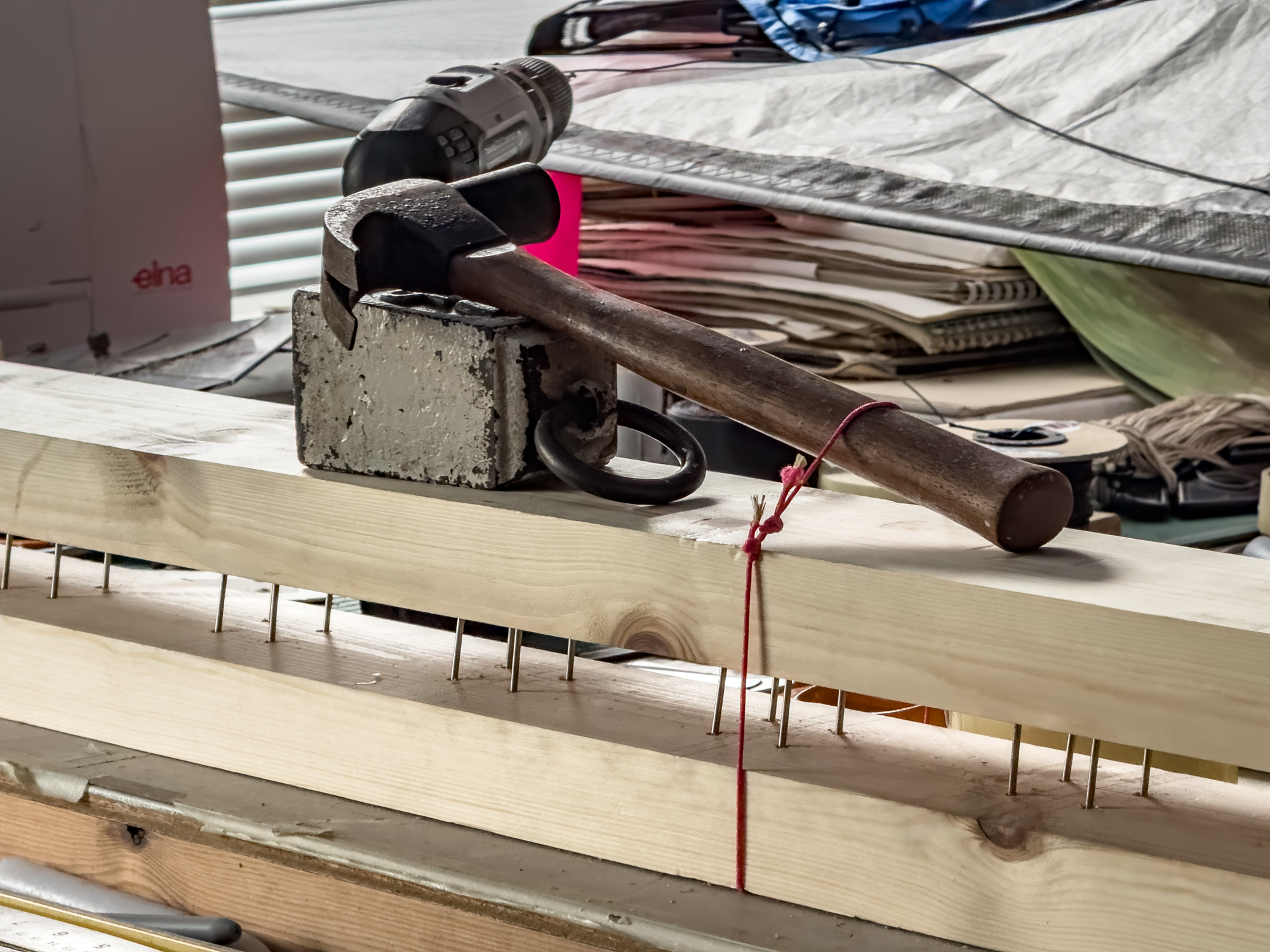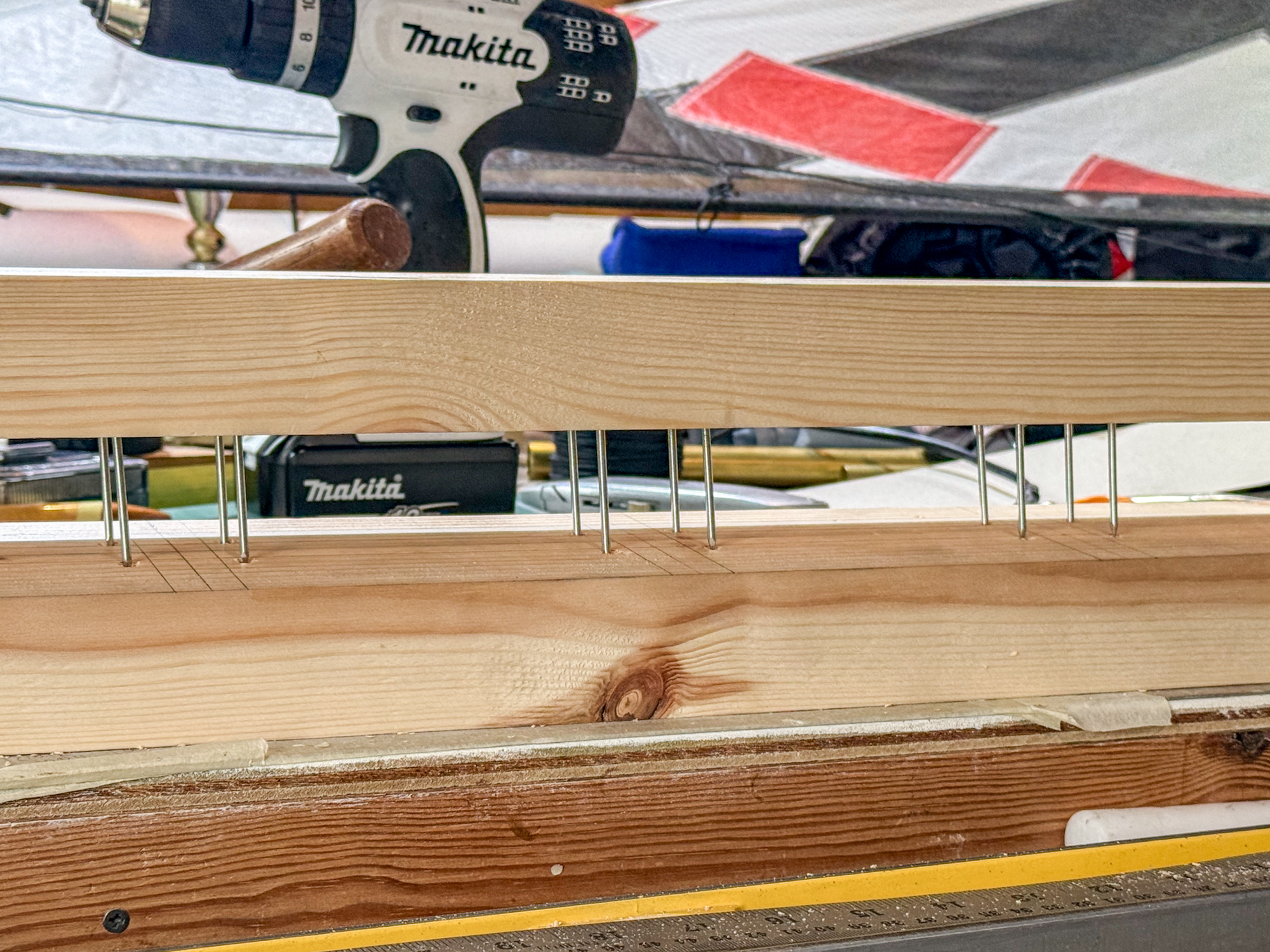 The lost head nails have been reverse hammered into what would be the top half of jig. The bottom half will be drilled to accommodate the nail points to keep the whole structure stable.