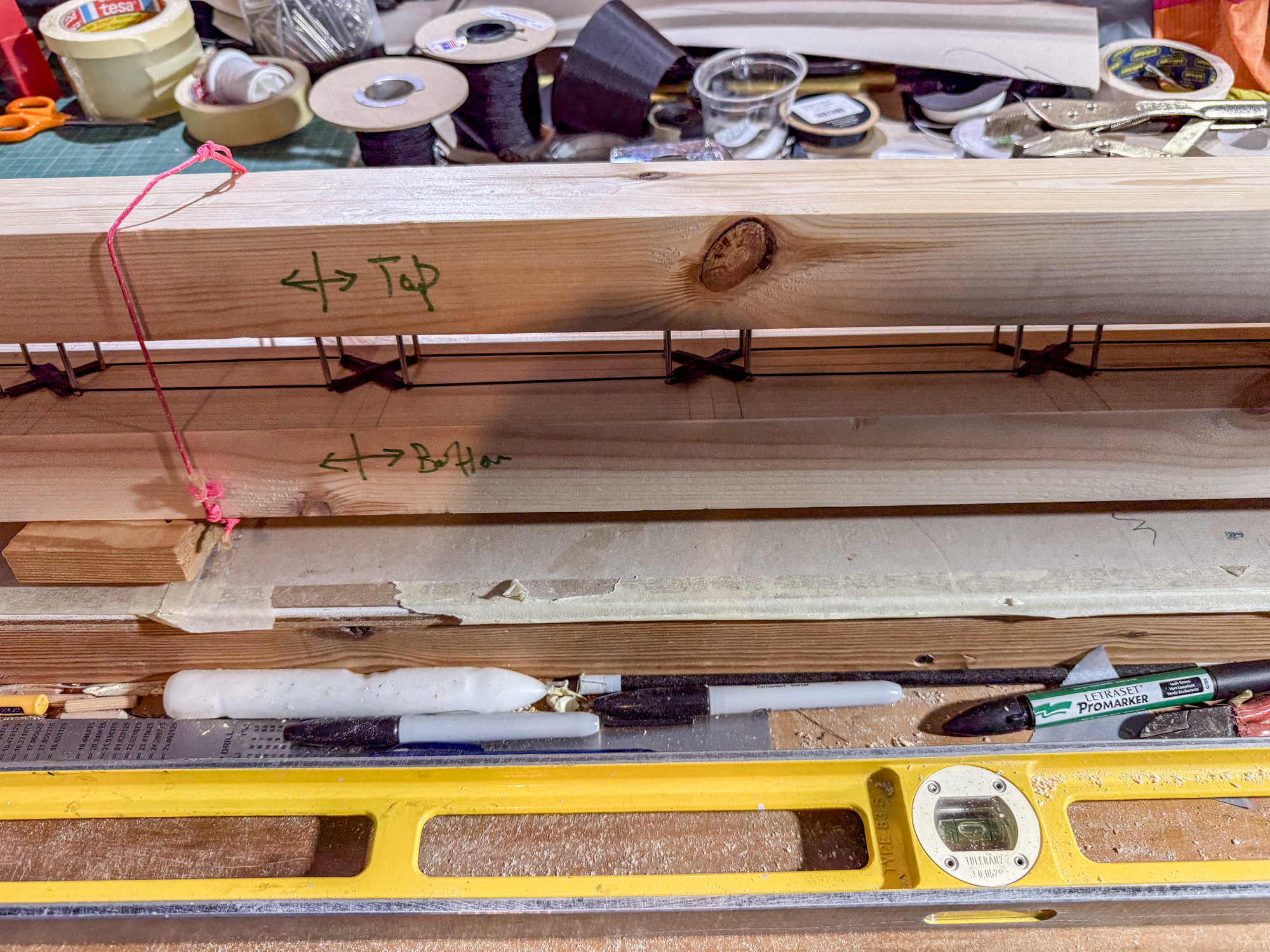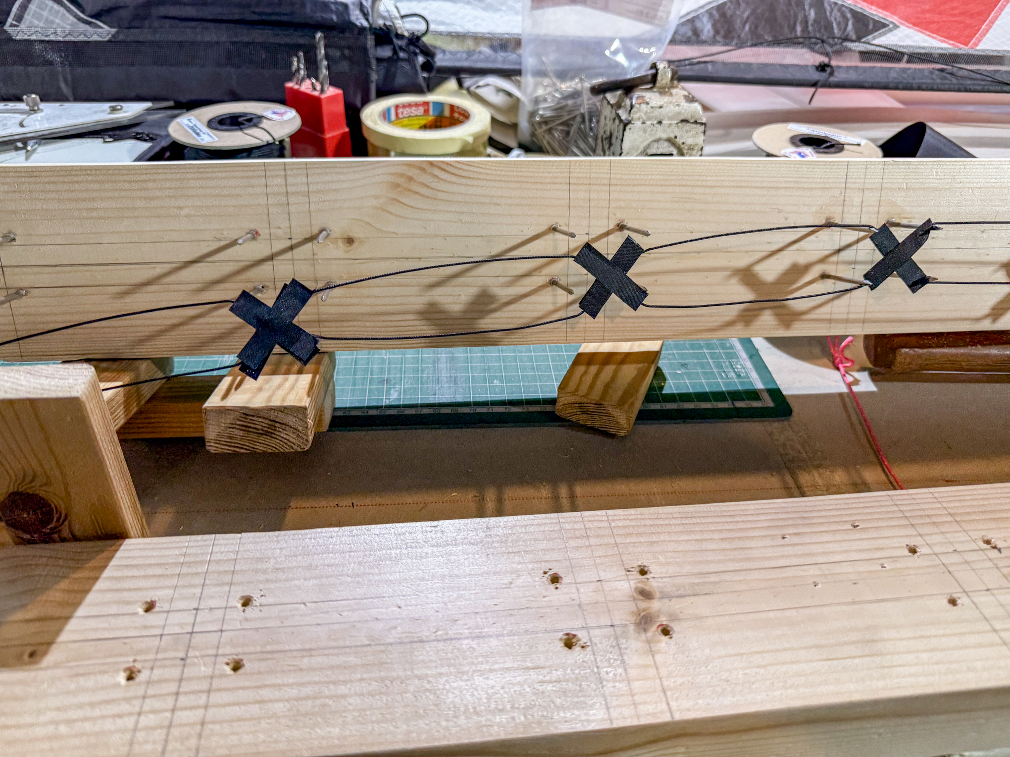 Once the sewing was done and loose ends trimmed the line was re-applied to the jig. The pressure on the lines was much higher than I had expected. The weights were left in place but I do not expect that there will be any stretch in the line, as such.