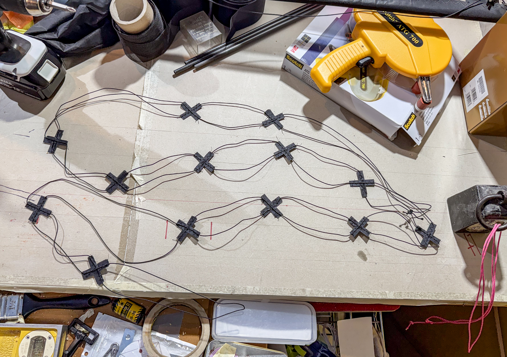 The configuration of the 'X's will have to be considered as will the safe process for making the 'X' and line assembly. Blunting the nails may be a sensible option but covering them in some way is also under consideration.