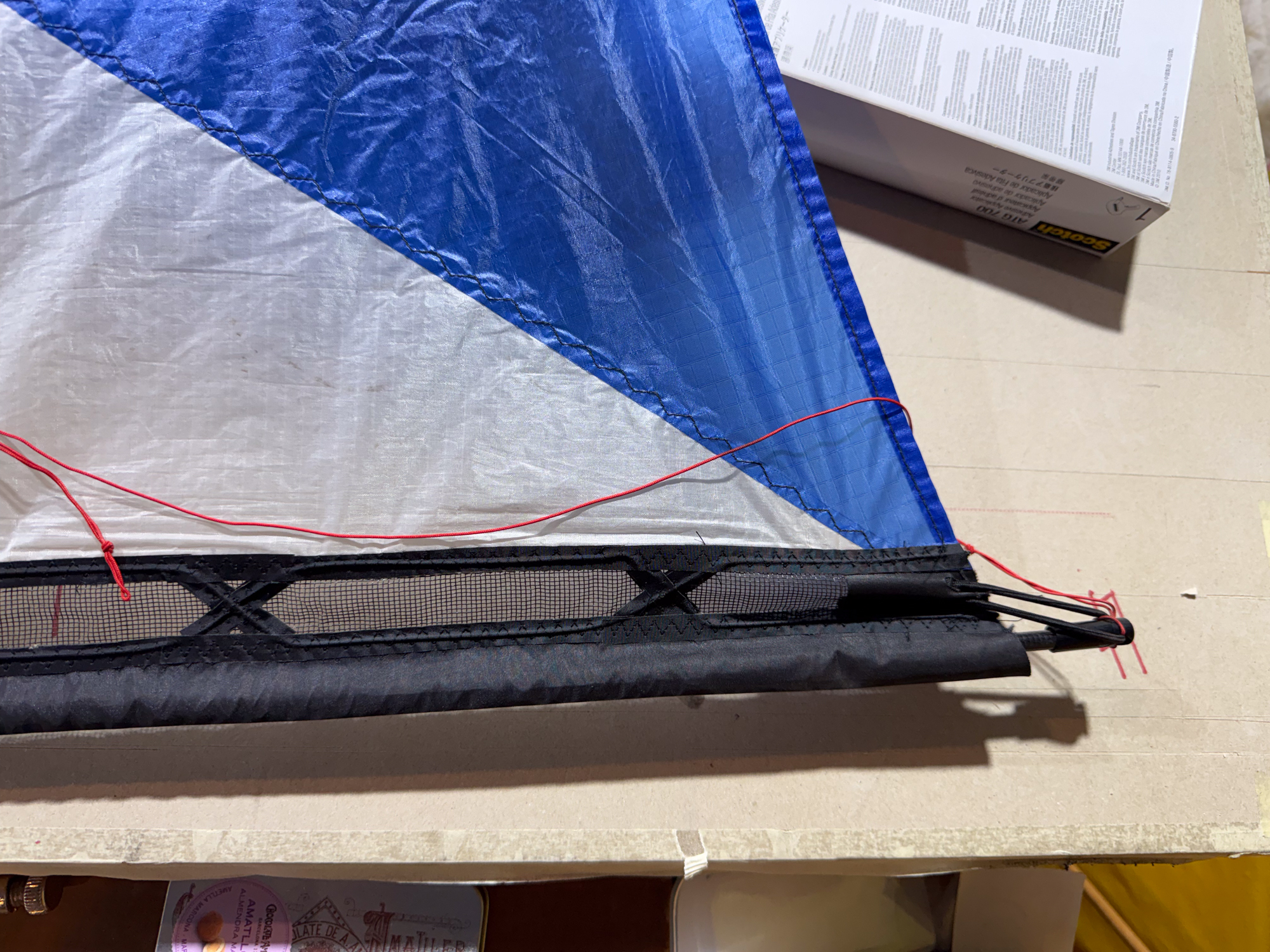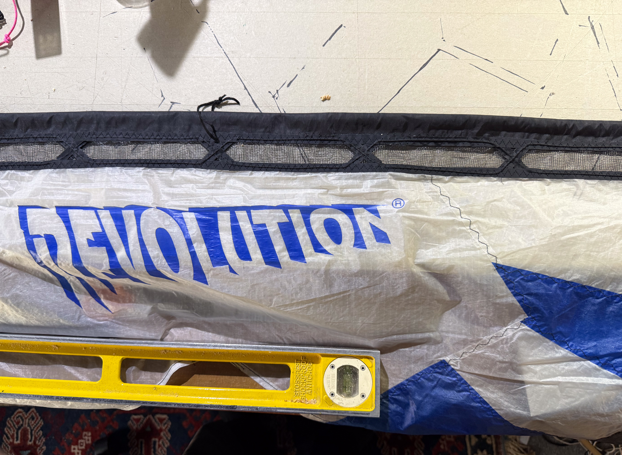 The bridle lines were re-set and it was noticed that the horizontal pressure on this sail was causing compression of the mesh in the last cell either end.