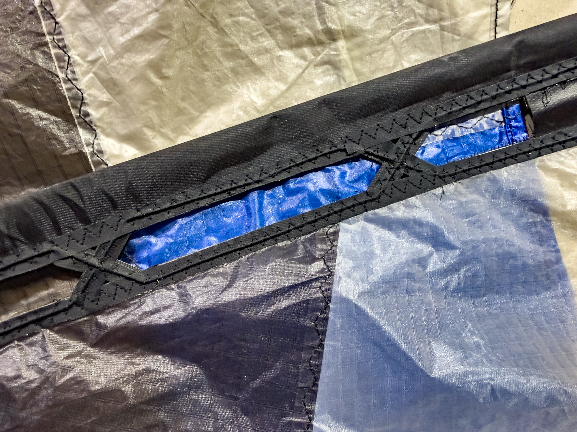 The end result is reasonably neat but the width of the dacron X elements may be increased just slightly so that there is no lightspace within the X shape and that the tips are fully engaged with the main final sewing line.
