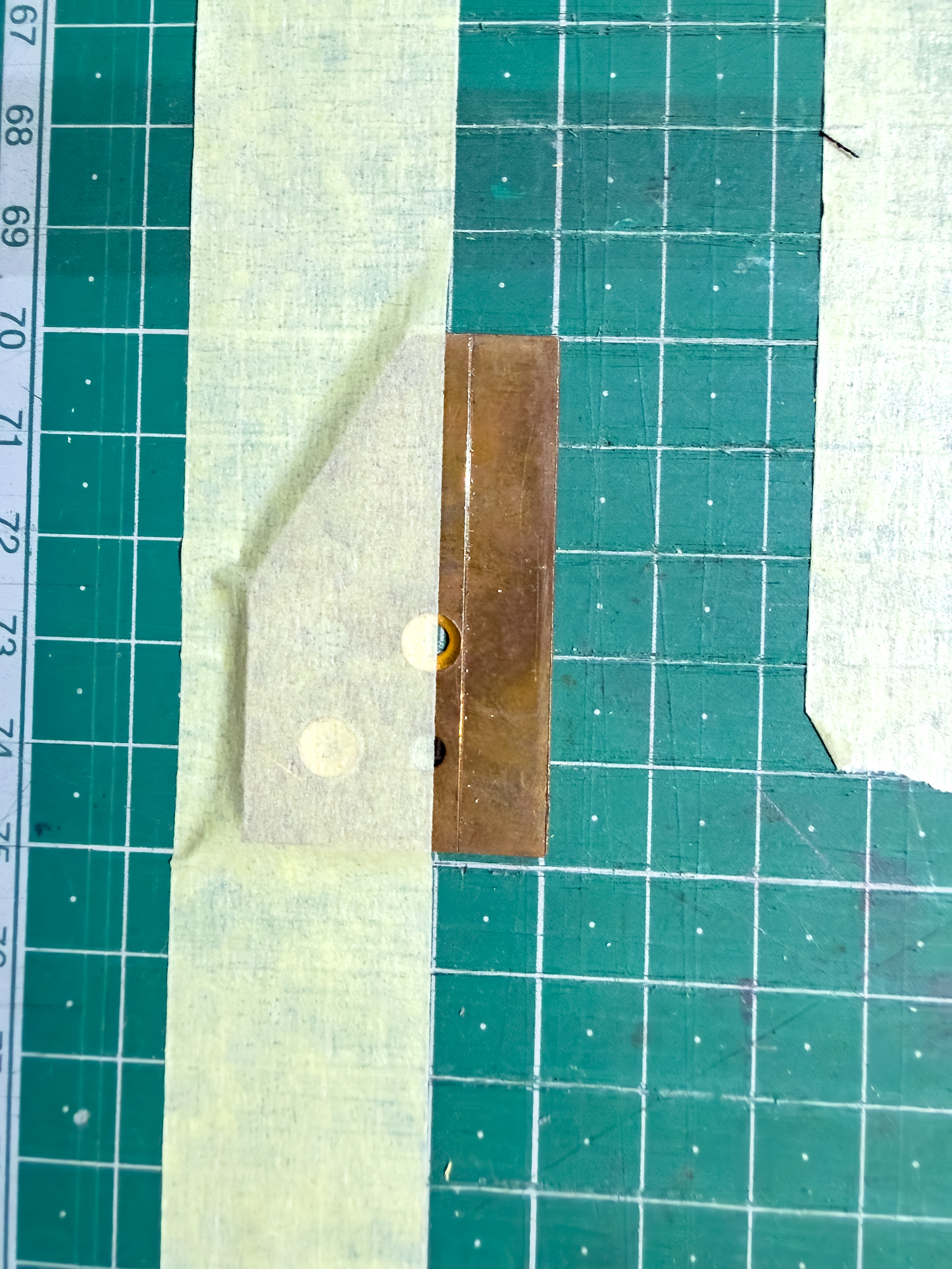 Just when a small brass plate, ready drilled is needed one turns up! A careful scribing of a shiny line 8mm from the edge becomes the guide for the cutting edge.
