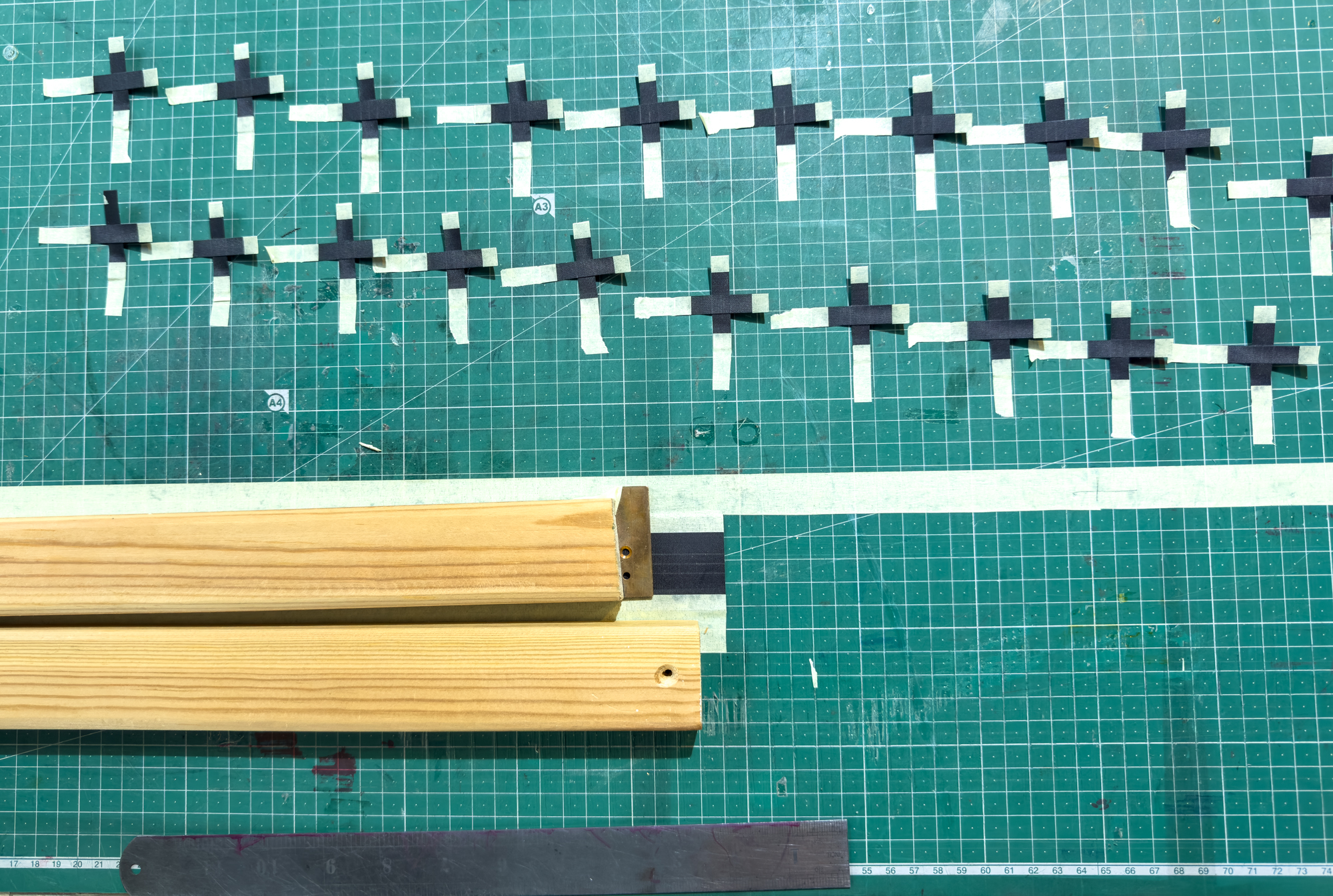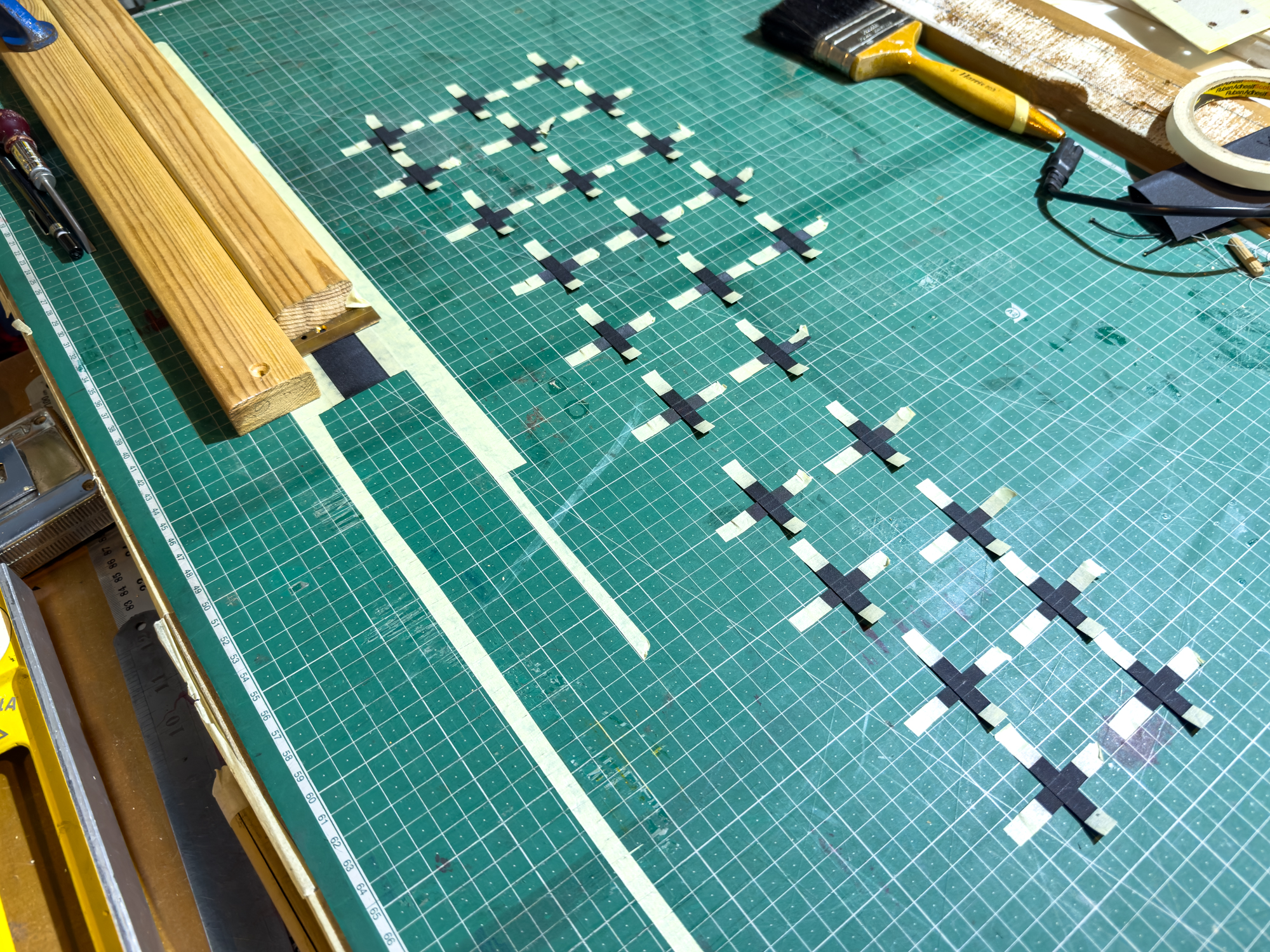 The slimmer elements should give a more clearly articulated 'X'. I will probably use adhesive to place them in the jig before laying the lines.