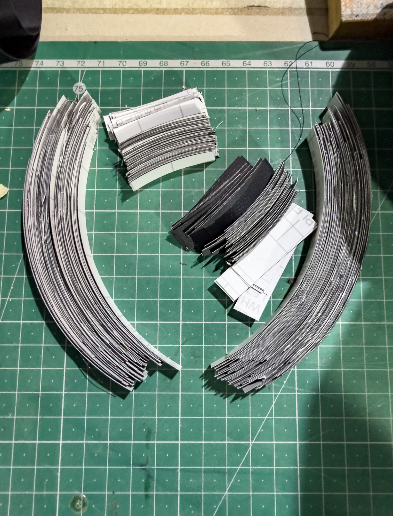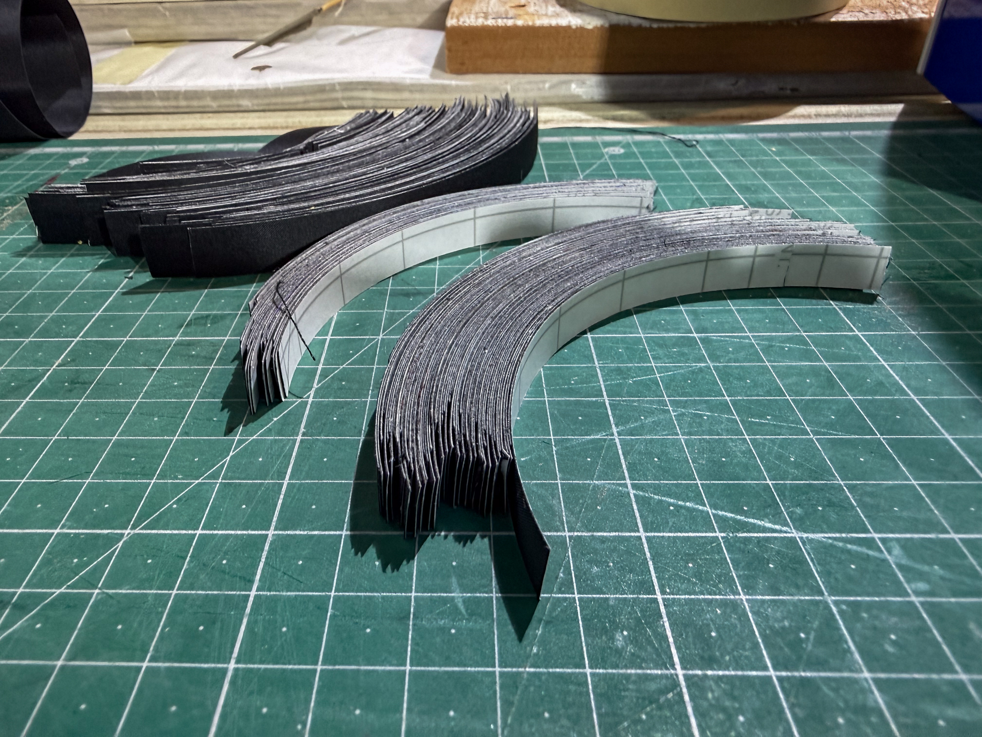 I set the fifth sail applied the adhesive strip and then found that the covering strips prepared previously were 12mm wide rather than 10mm. There was no way to proceed but to cut new 11.5cm strips and proceed from there. I did salvage some of the 4cm strips by cutting them down with scissors but that was far from ideal.