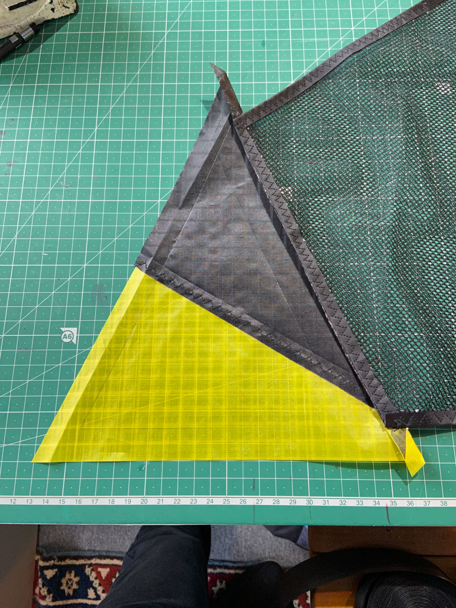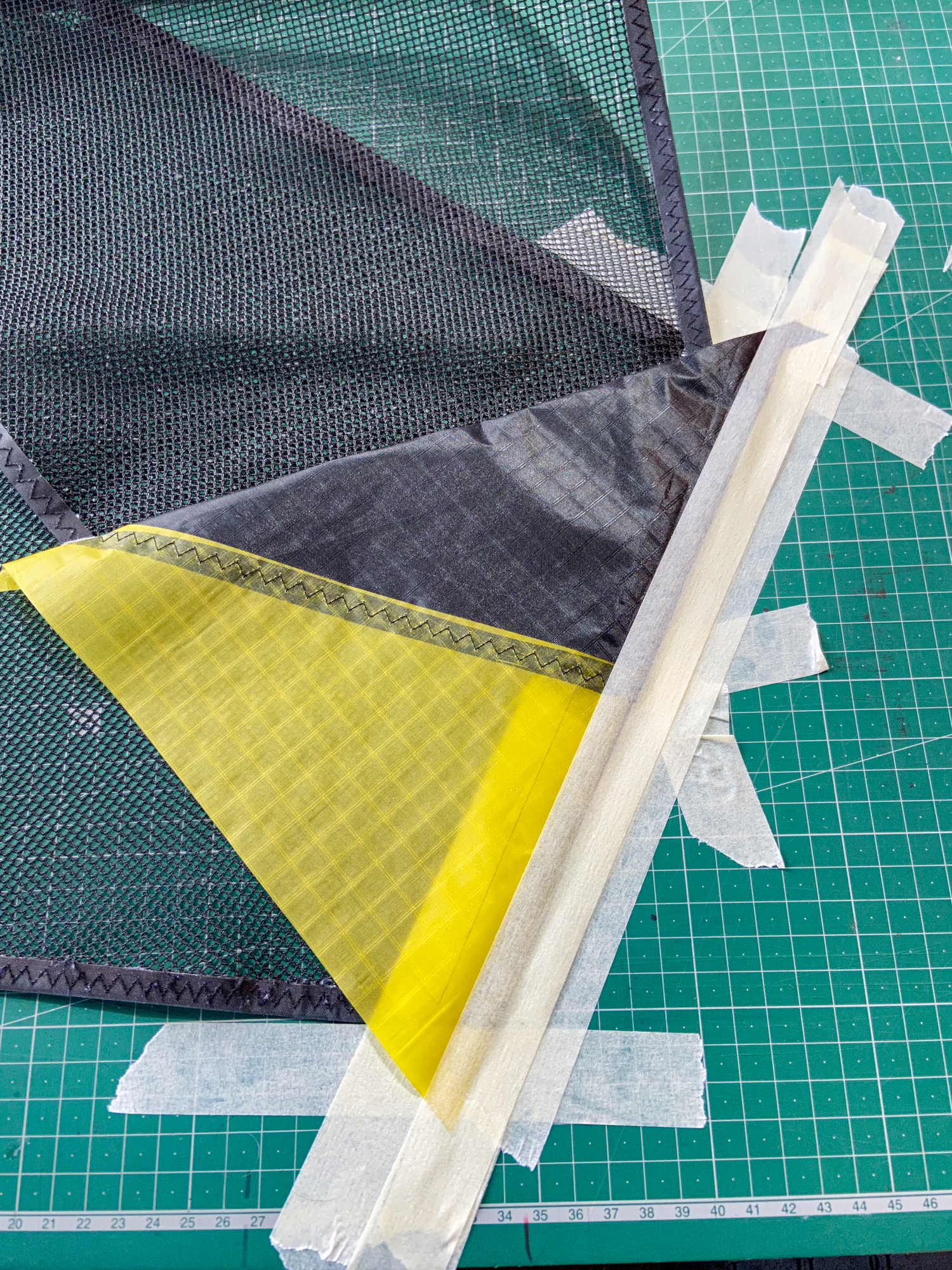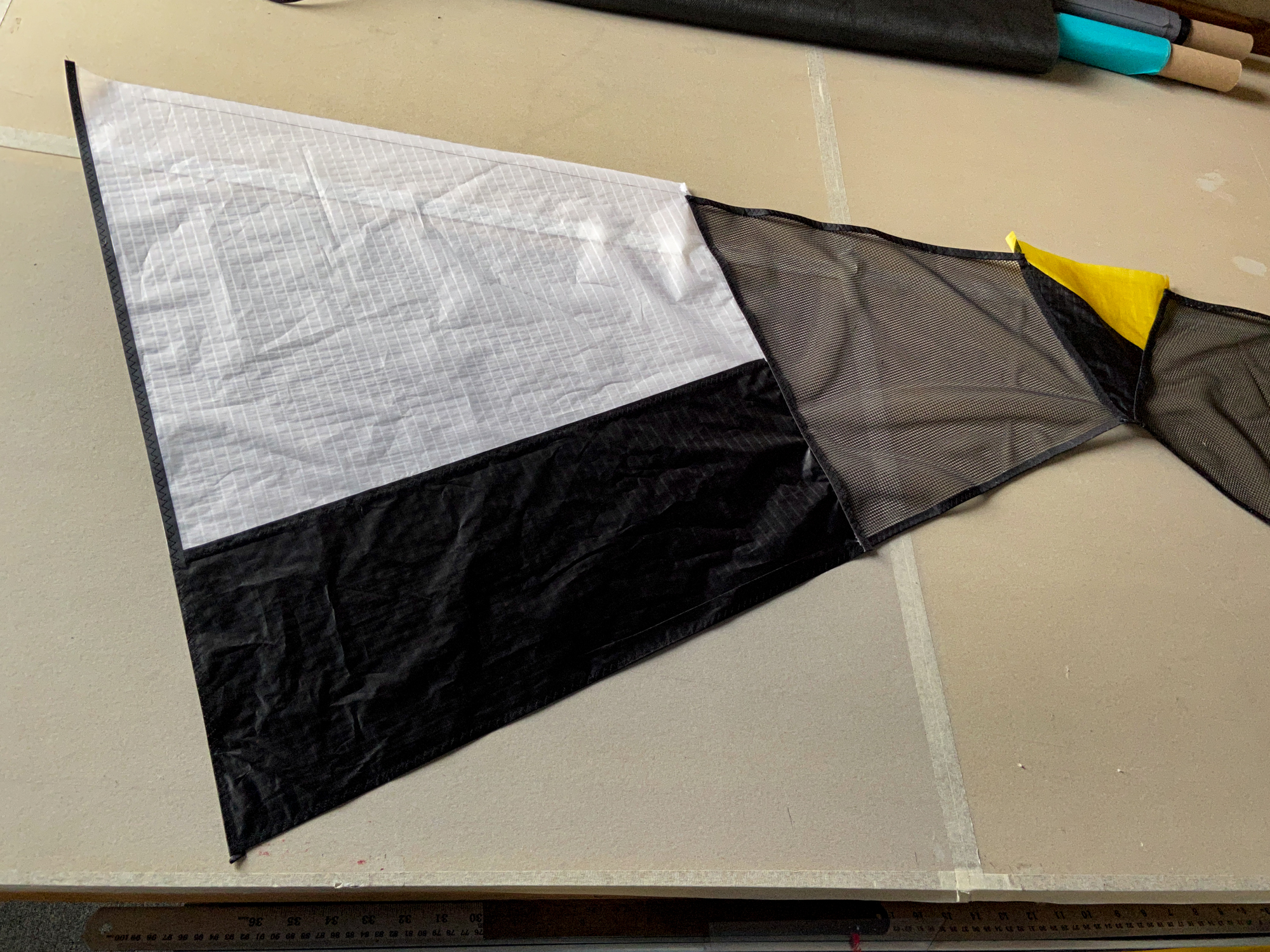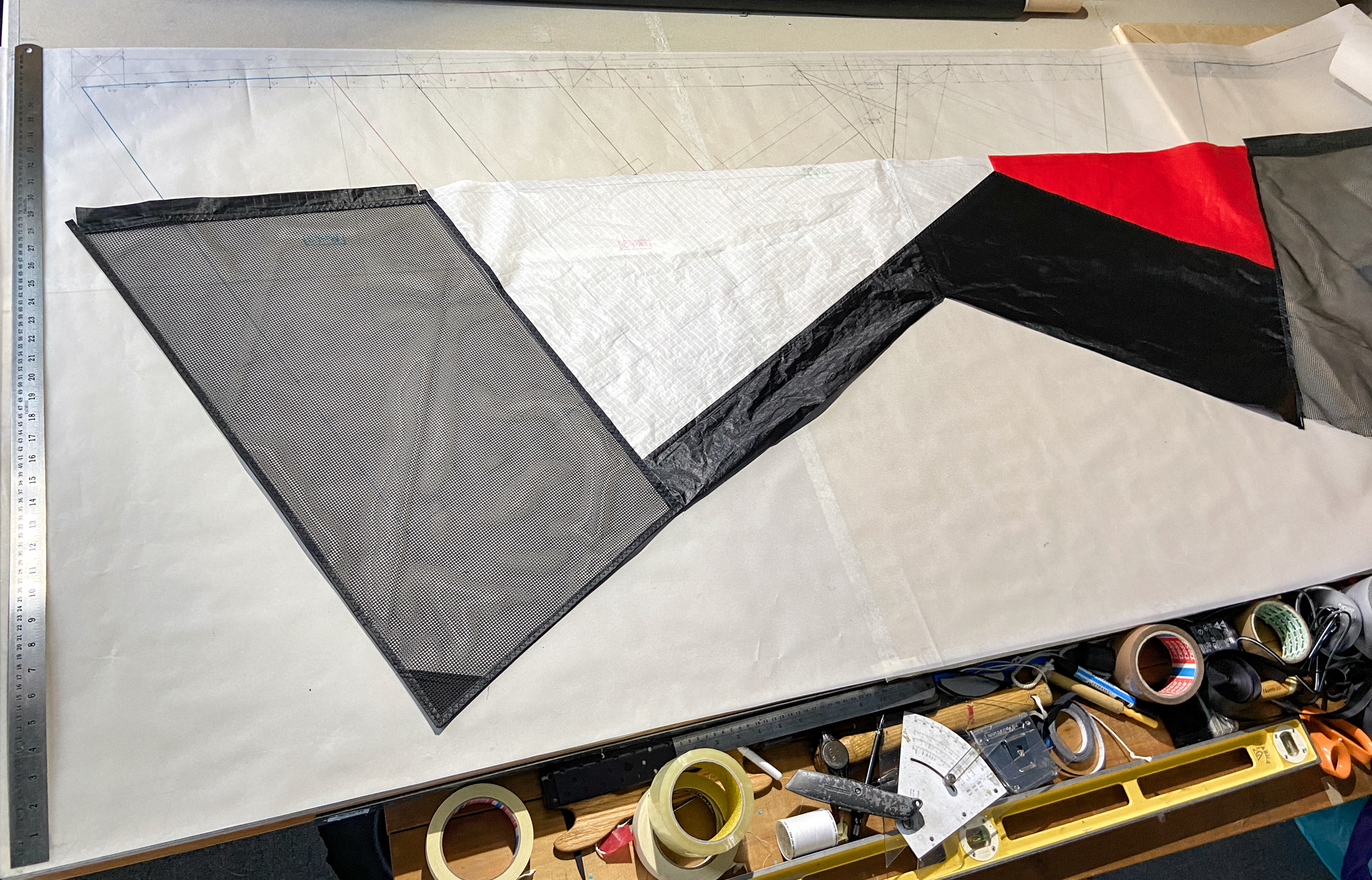 The mesh element was seen as disposable element that would be replaced by a grey sail component in the event that the sail does not work. The elements were cut carefully and hemmed with dacron producing a complete component.