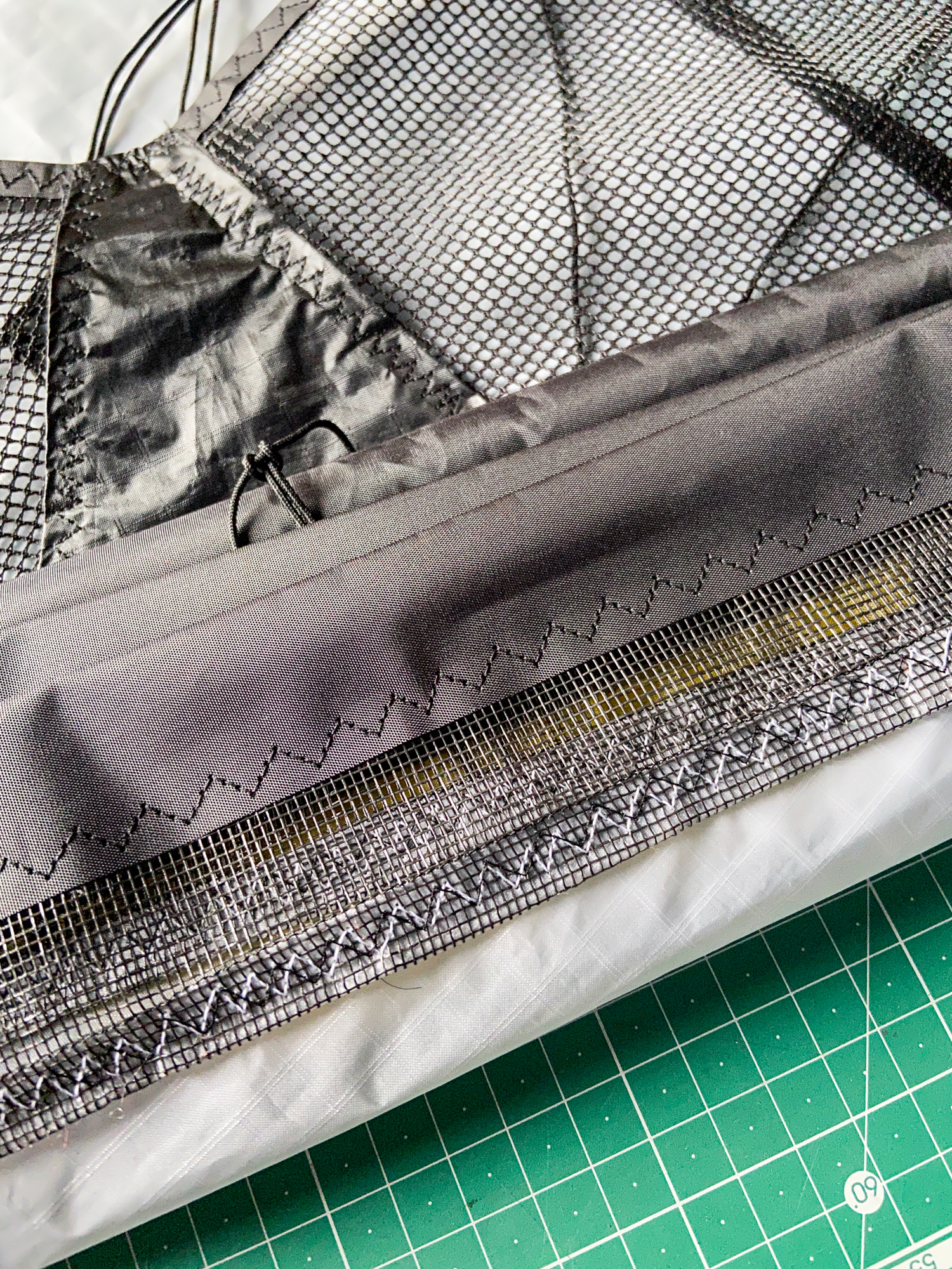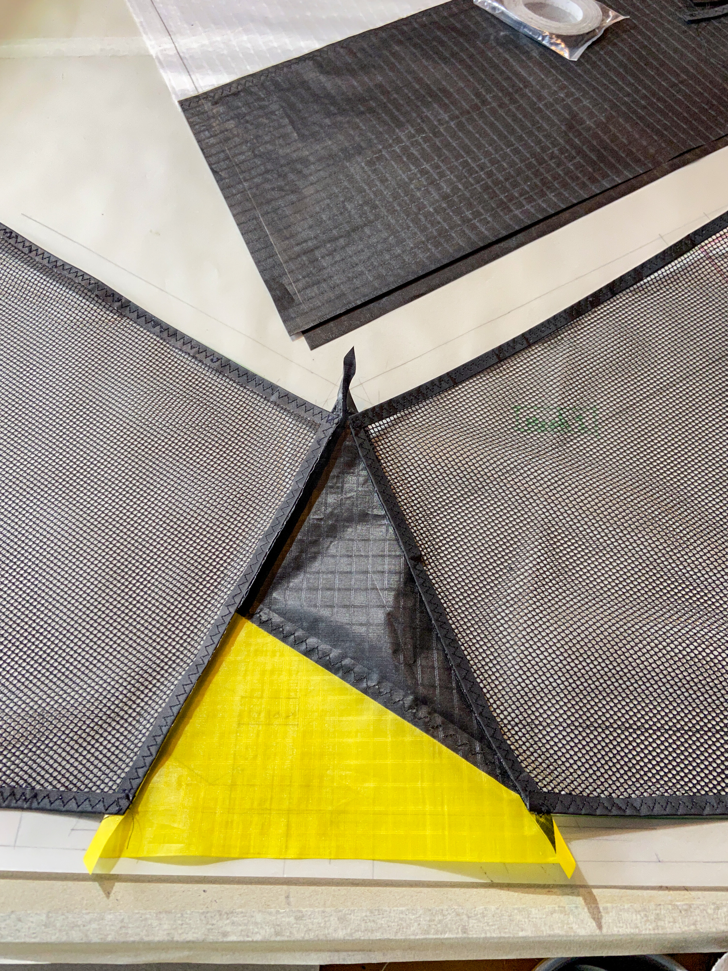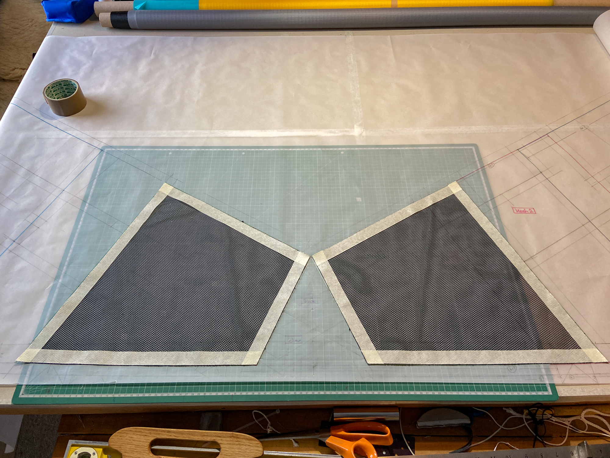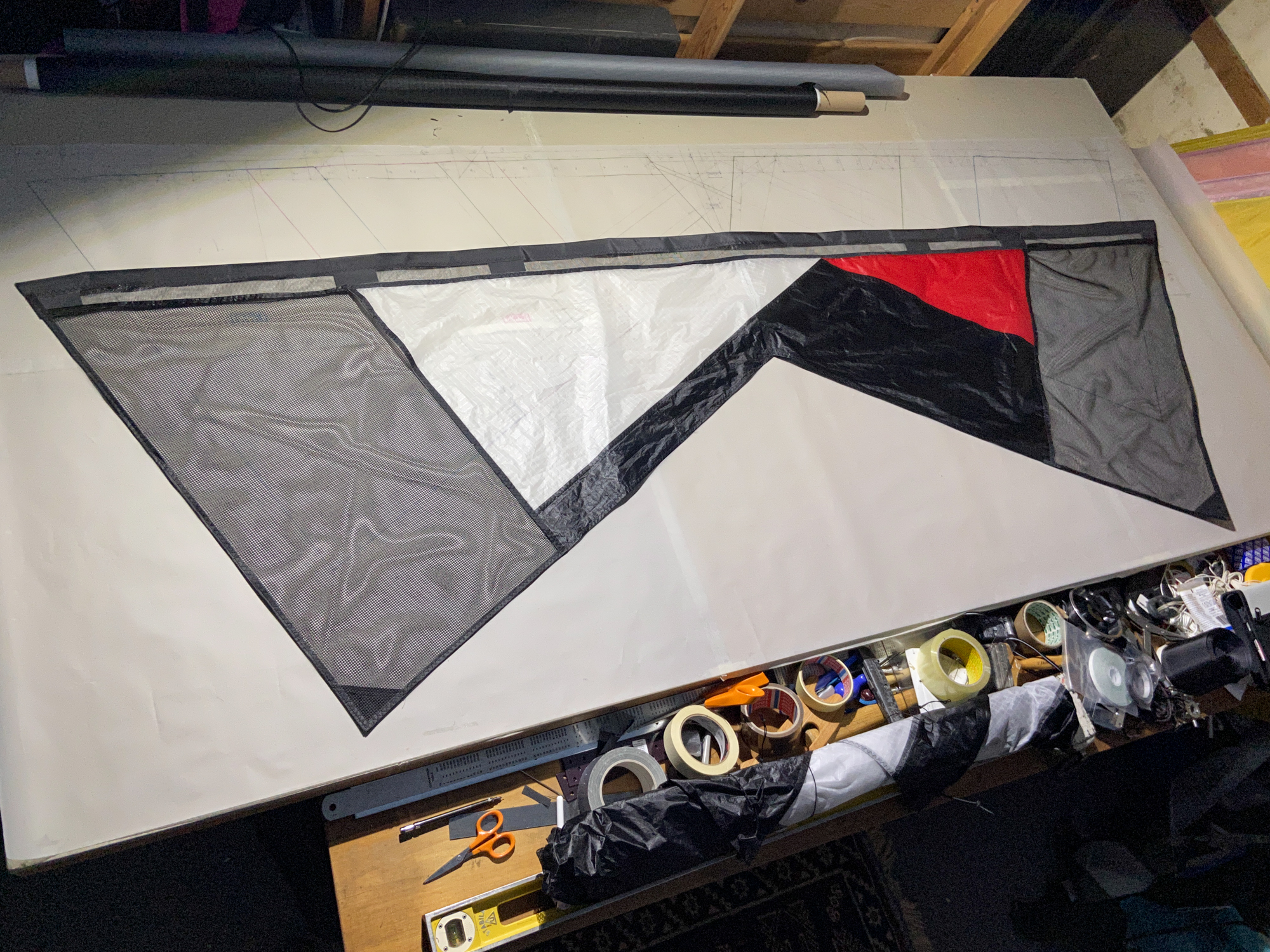 The mesh element was seen as disposable element that would be replaced by a grey sail component in the event that the sail does not work. The elements were cut carefully and hemmed with dacron producing a complete component.