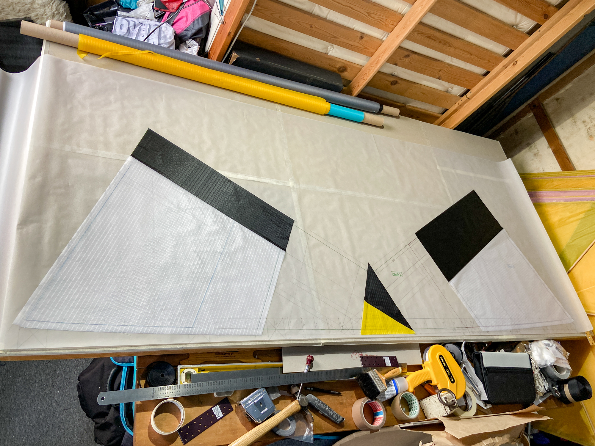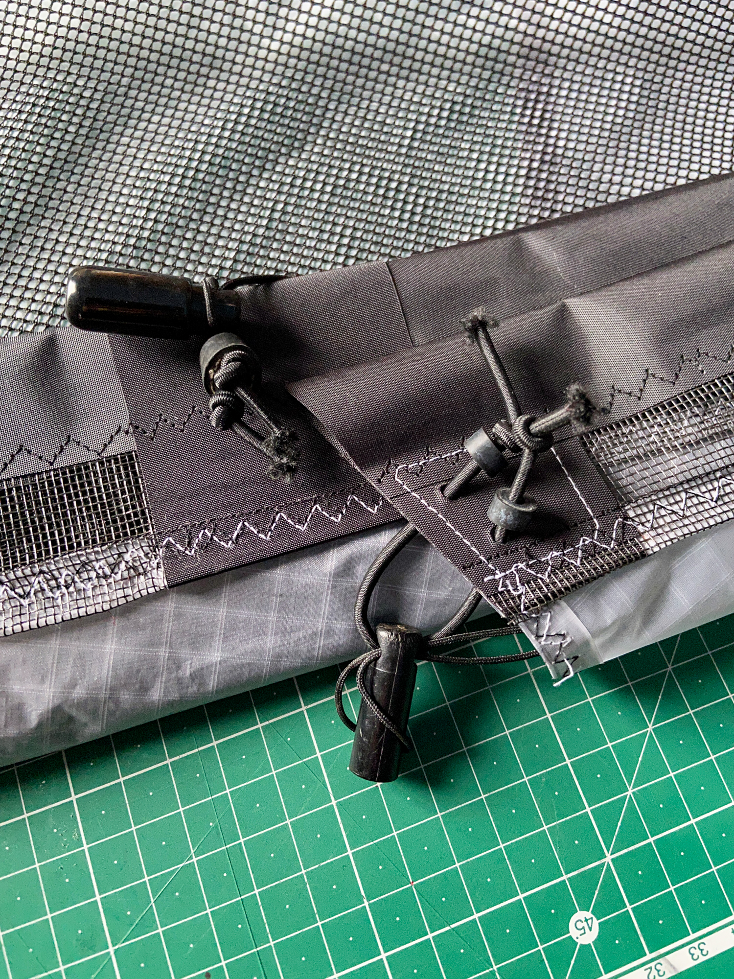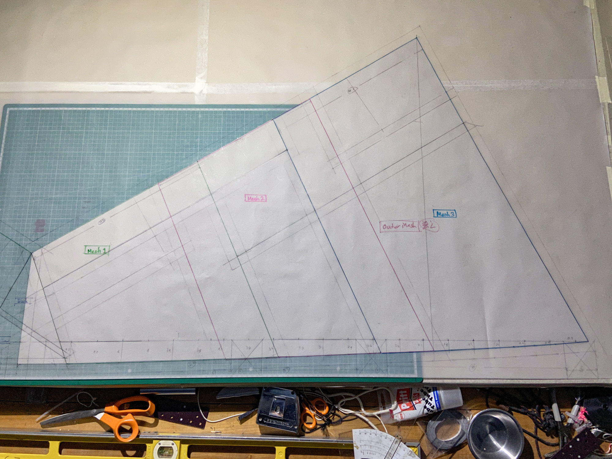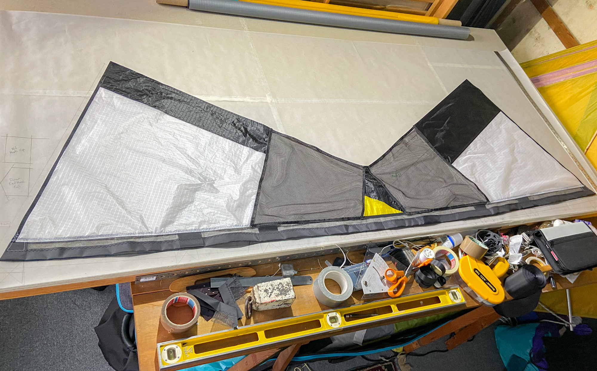 The mesh element was seen as disposable element that would be replaced by a grey sail component in the event that the sail does not work. The elements were cut carefully and hemmed with dacron producing a complete component.