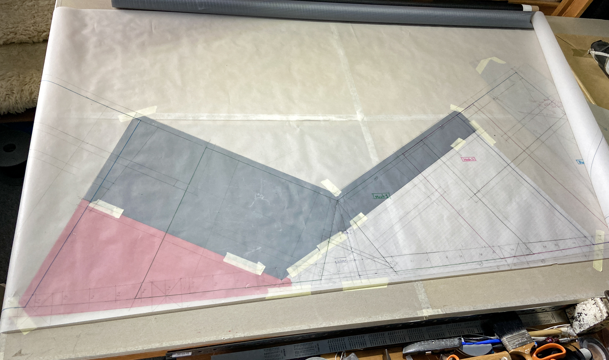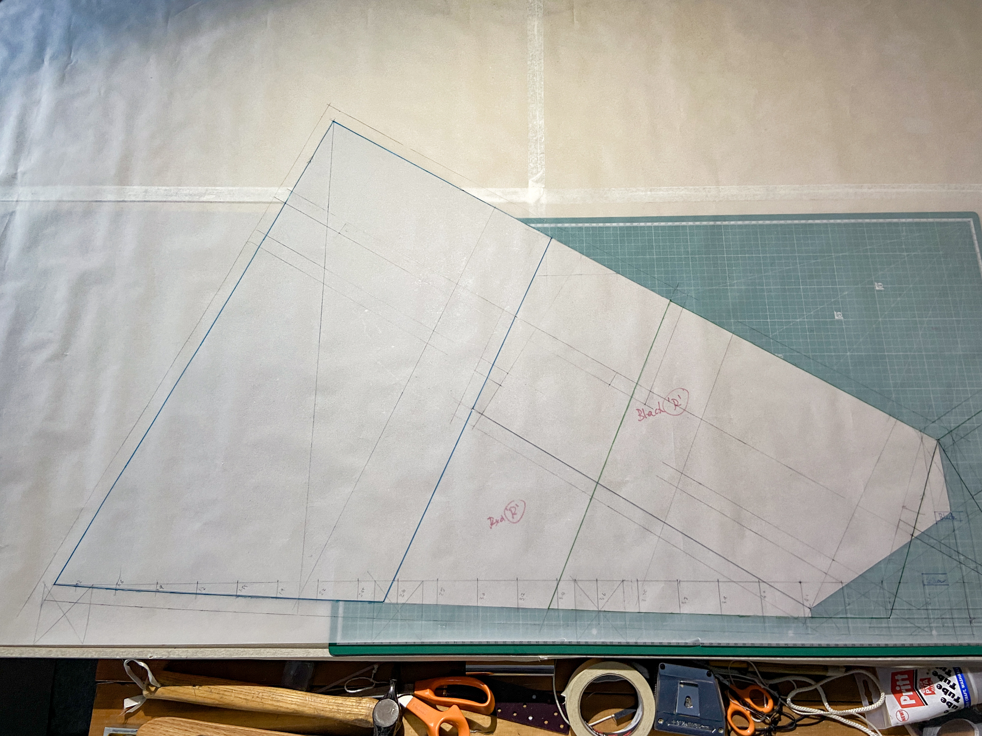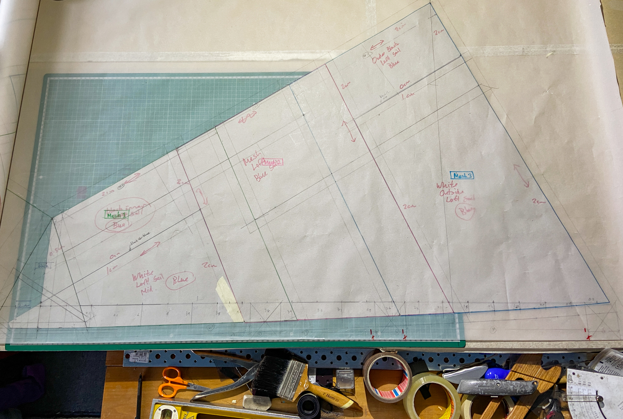 Sail elements were cut using card templates drawn from the initial tracing.