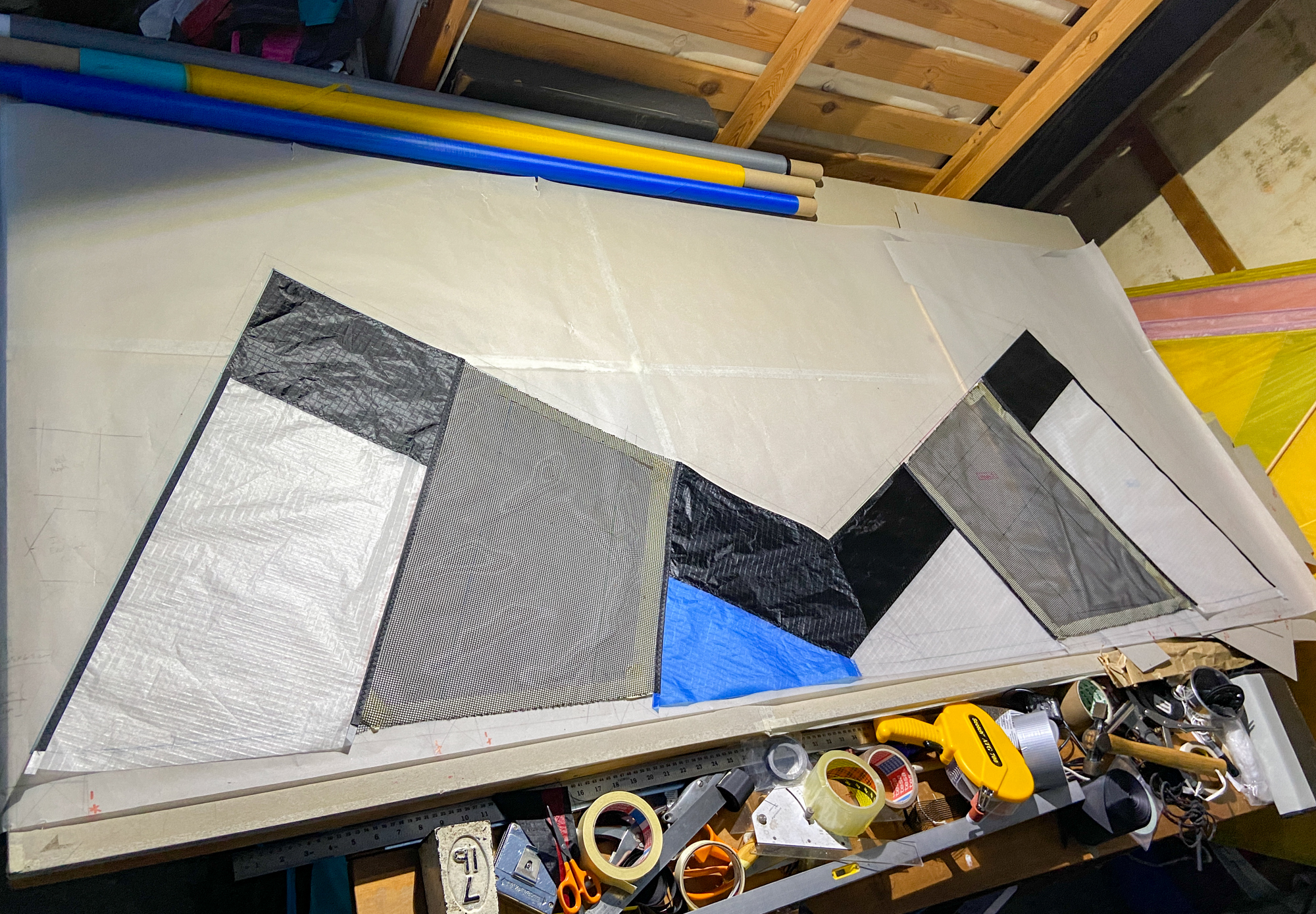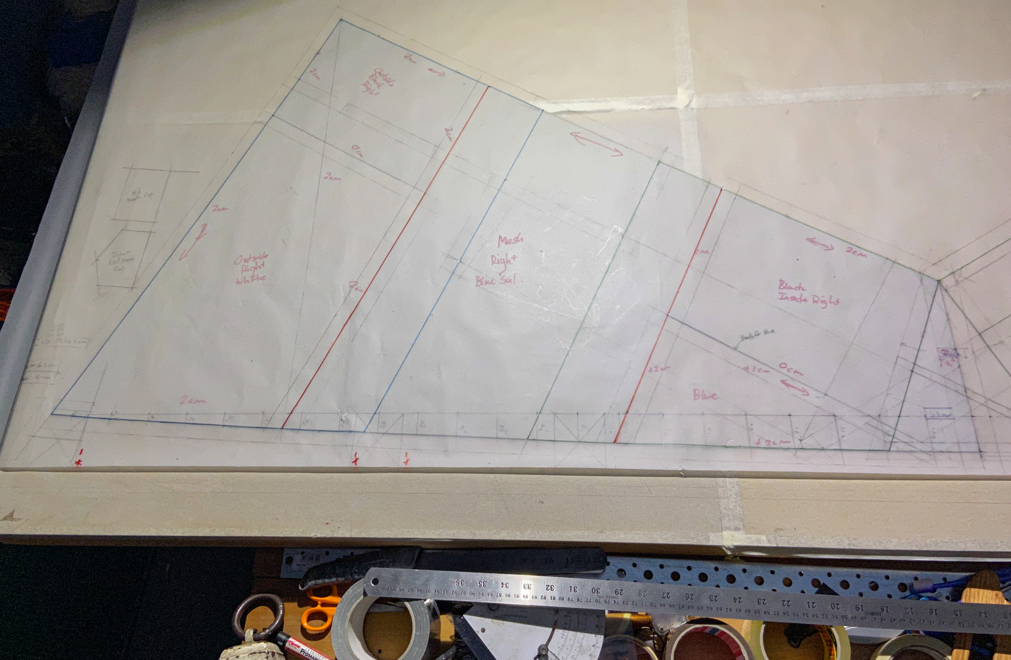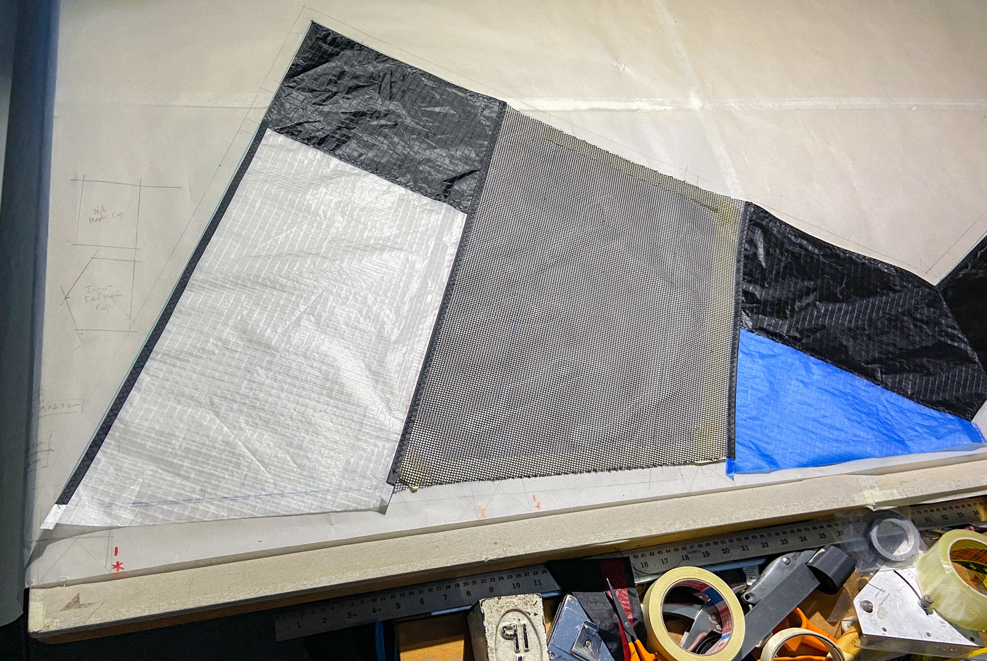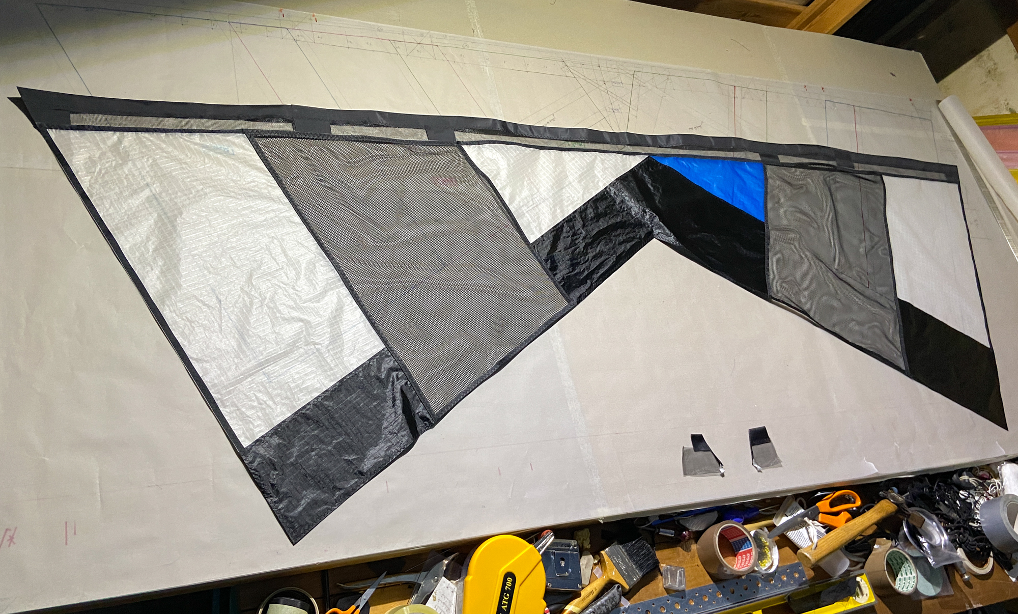 Blue Icarex arrived from Germany, 15th November 2022. All the components are now prepared for fabrication and the initial sewing of the Icarex is done, 16th November 2022.