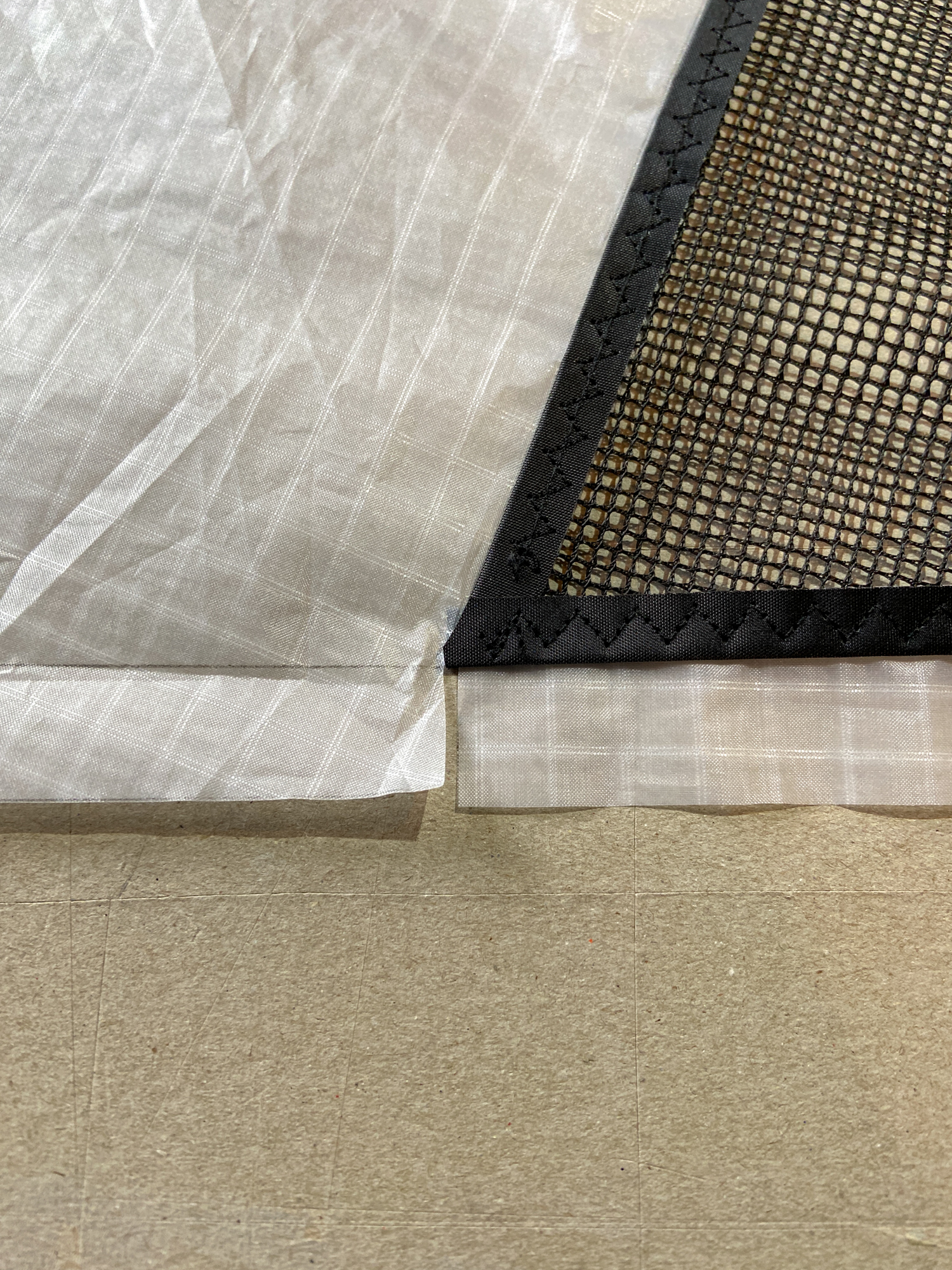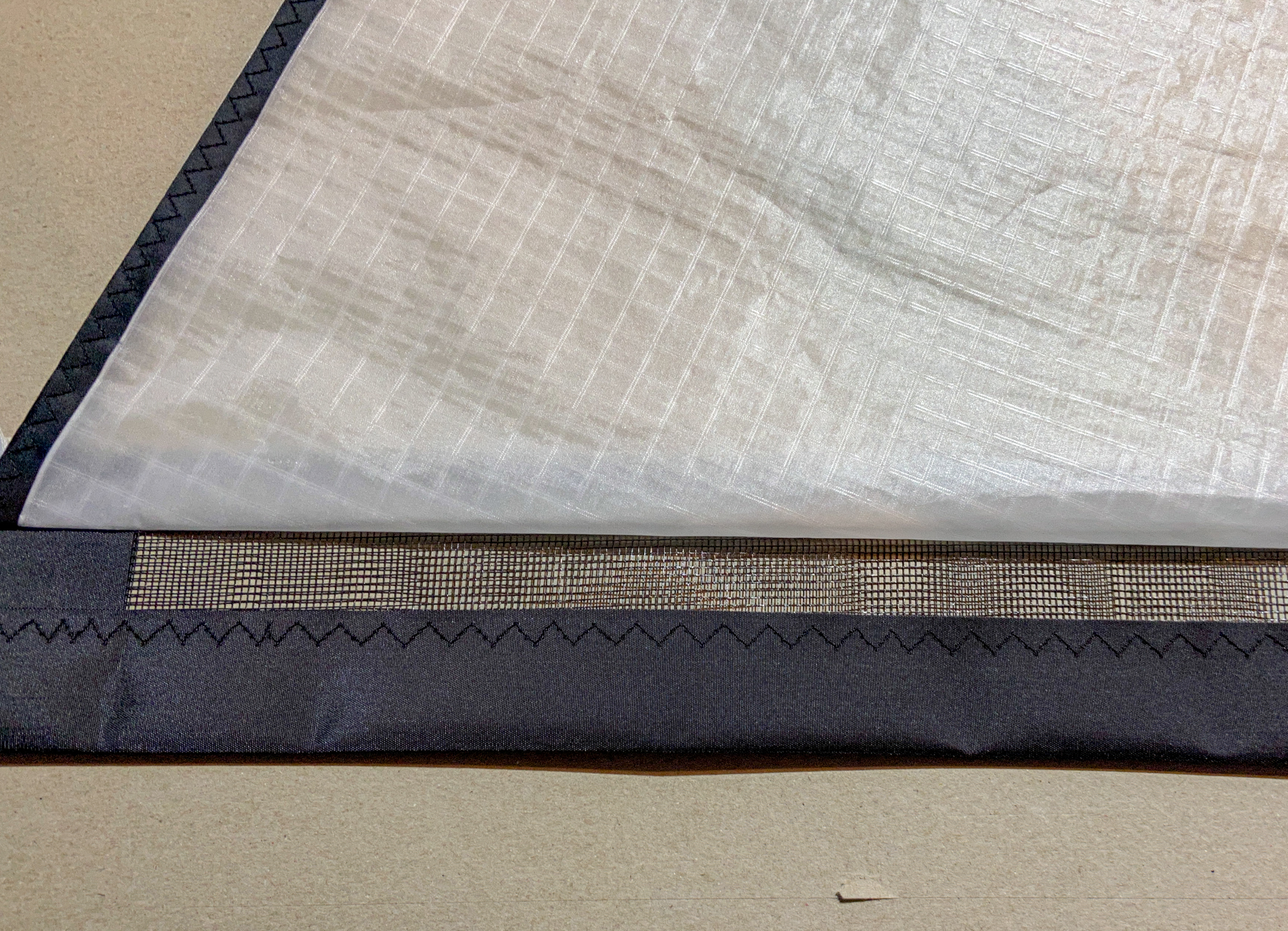 Sewing onto the mesh panels was complicated as the dacron element had to be secured and aligned. Main edges tacked ready for sewing, 18th October 2022.
