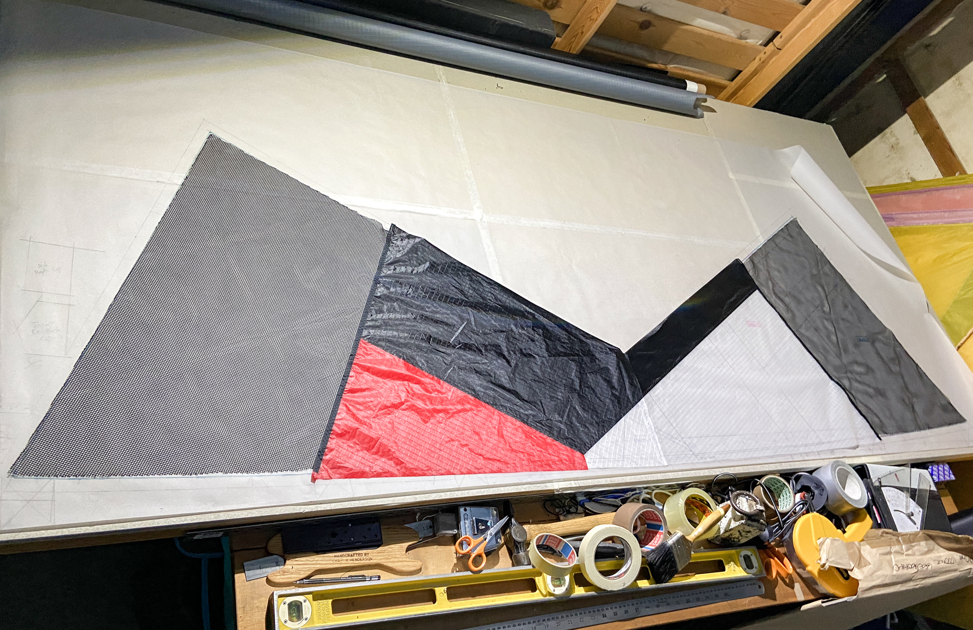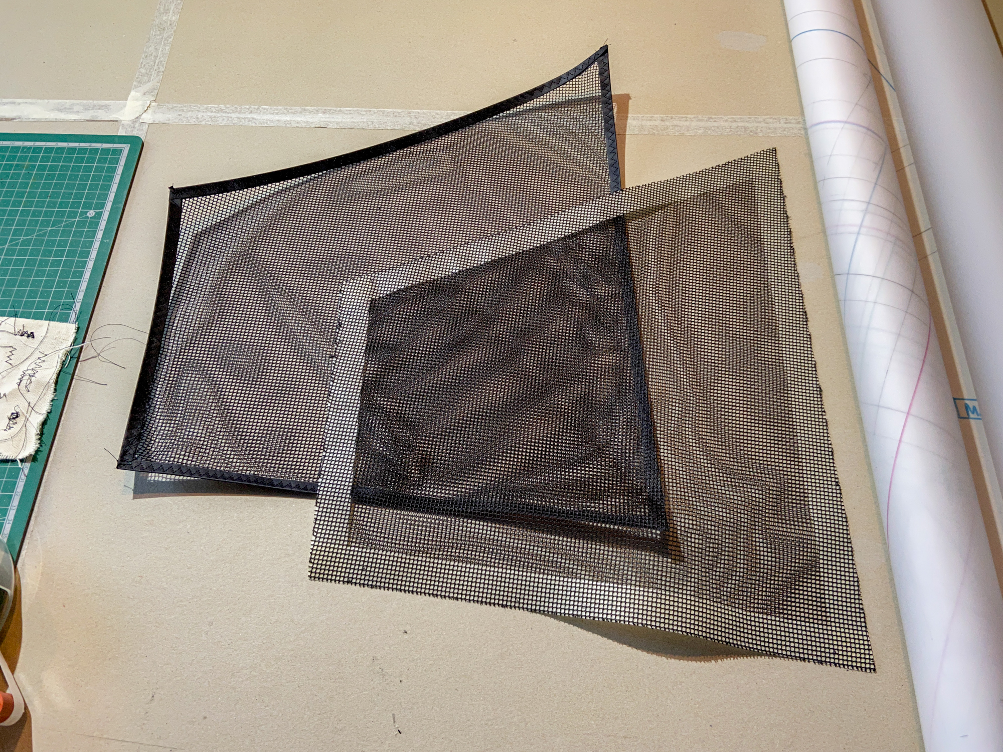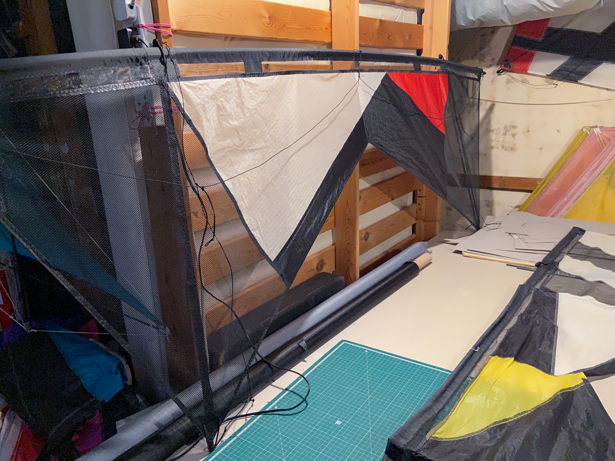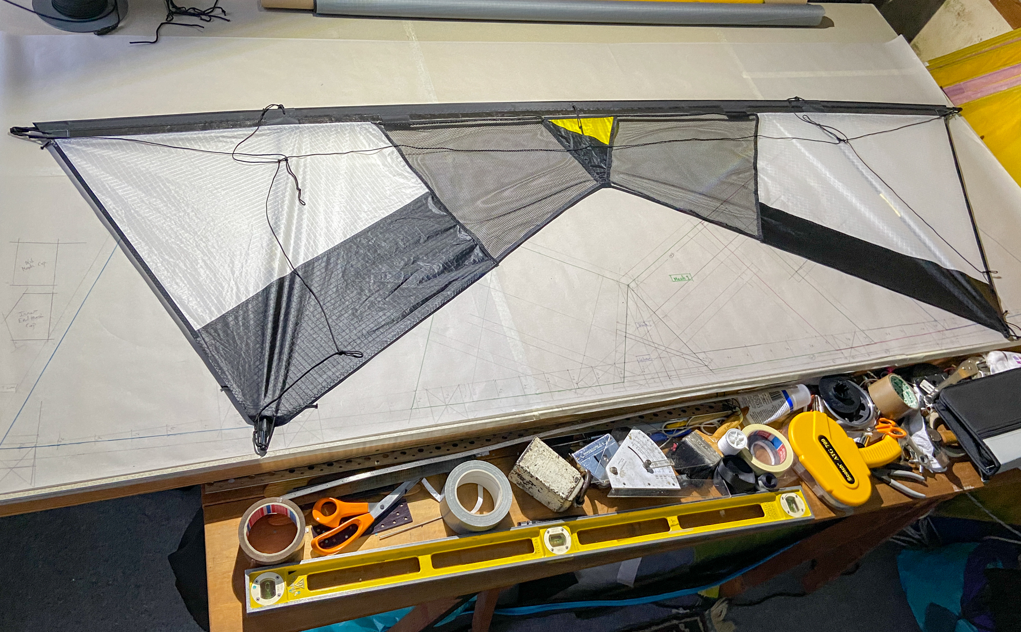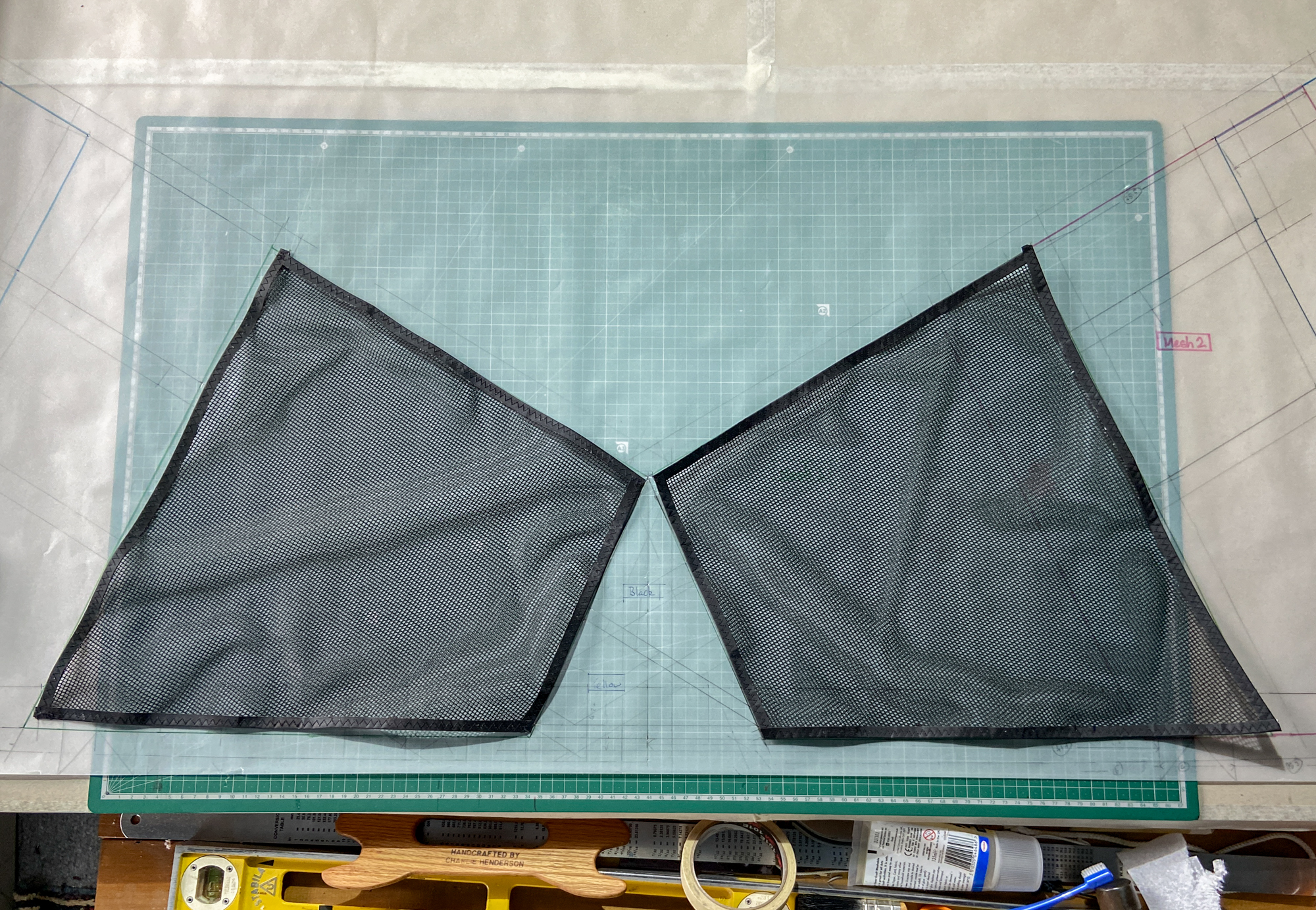In 2022 needing a project involving the preparation of replacement leading edges I decided to re-address the original designs from 2008/2009 and 'invented' a transitional version. The project is being developed using a polyester mesh with a wider grain than the original Revolution leading edge mesh.