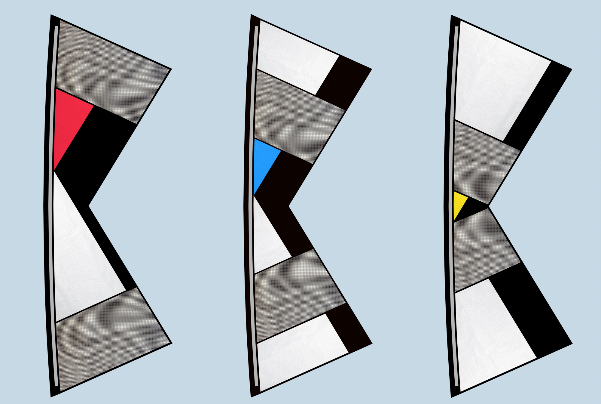 A traced outline of the Revolution 1.5 sail was started 7th September 2022 with elements of all three configurations gradually added with particular reference to the actual curved leading edge. This was used to plot the digital version which was partly filled with textural elements as at 3rd October 2022.