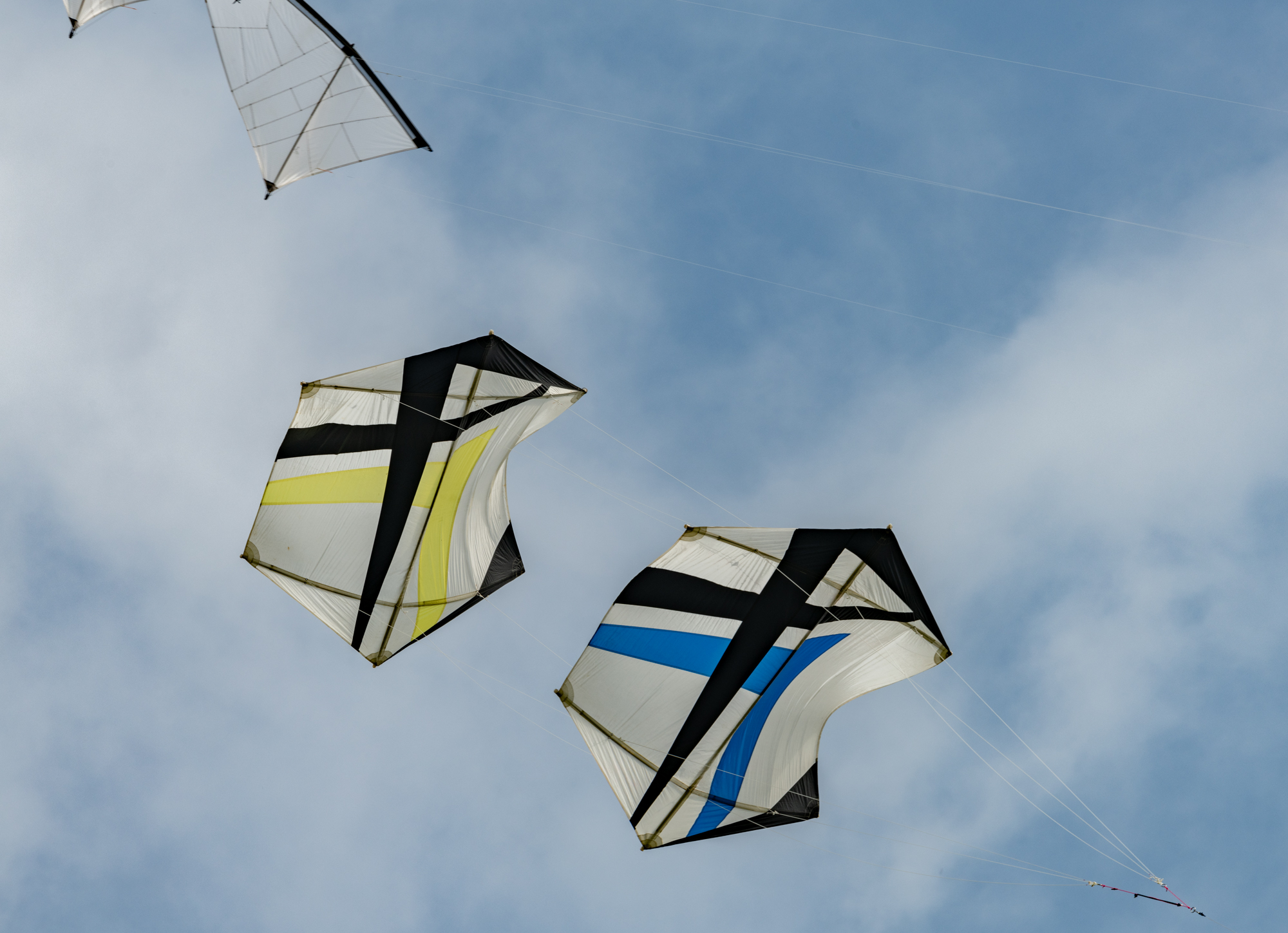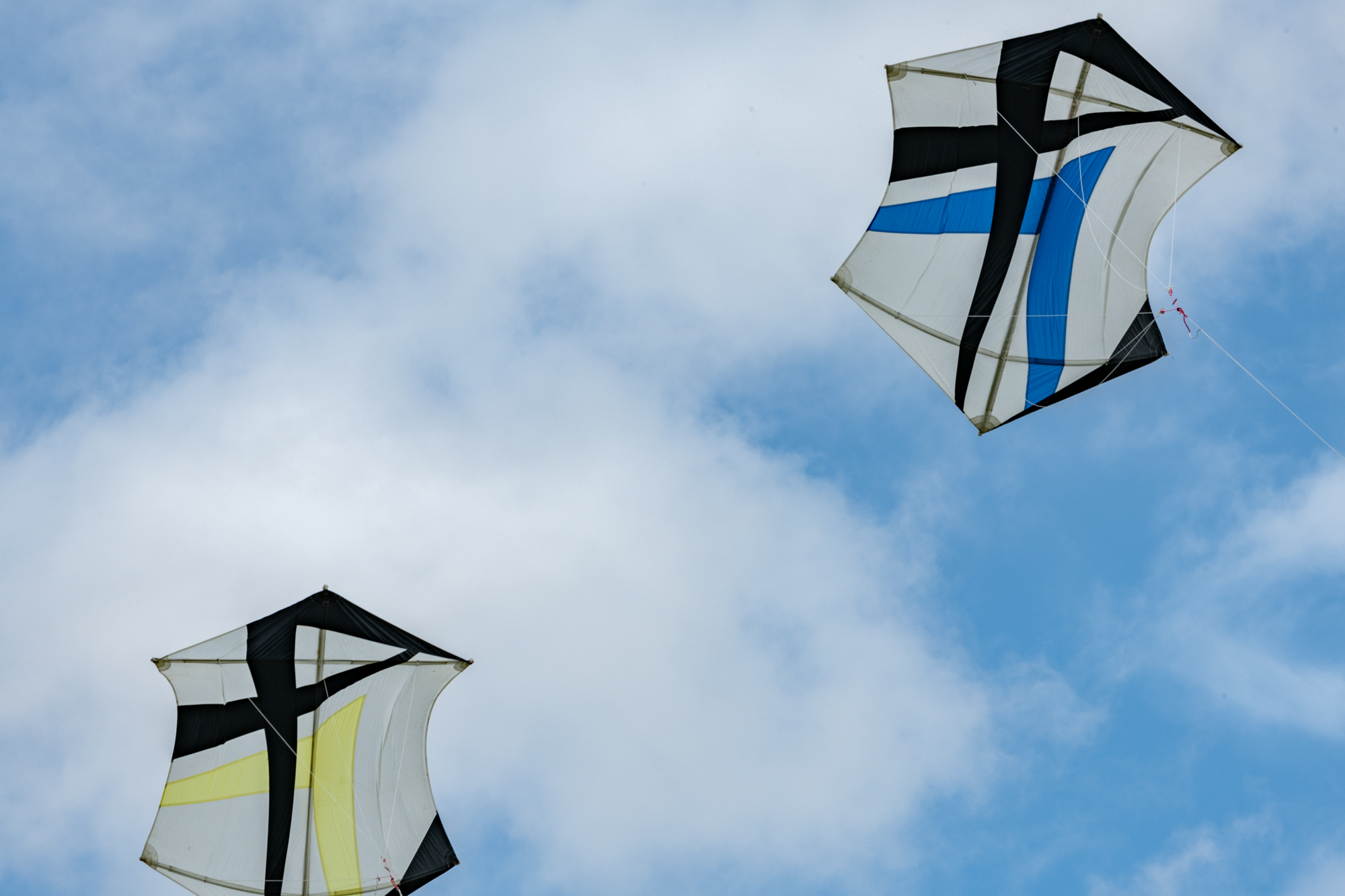 Bridle test flight for the dark blue sail. Both kites have a peg in the top bridle set. Yellow, one clove hitch, blue, one clove hitch plus 1/2 hitch!