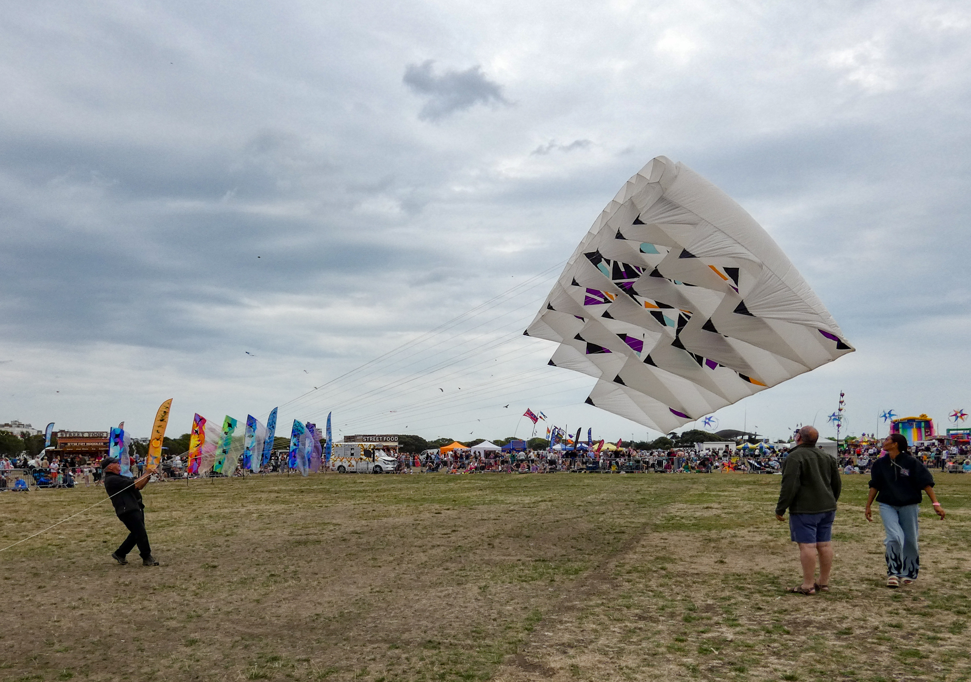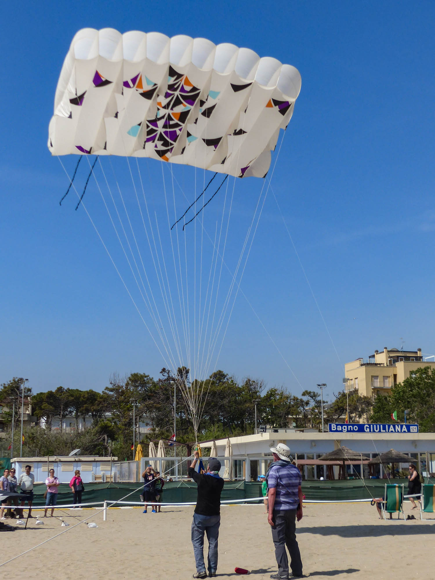 The 1991 Parafoil was initially flown at about the time of one of the Art Kite arena presentations but there was not quite enough wind at that moment. It was flown later with the 1992 Parafoil which is rather more manageable.