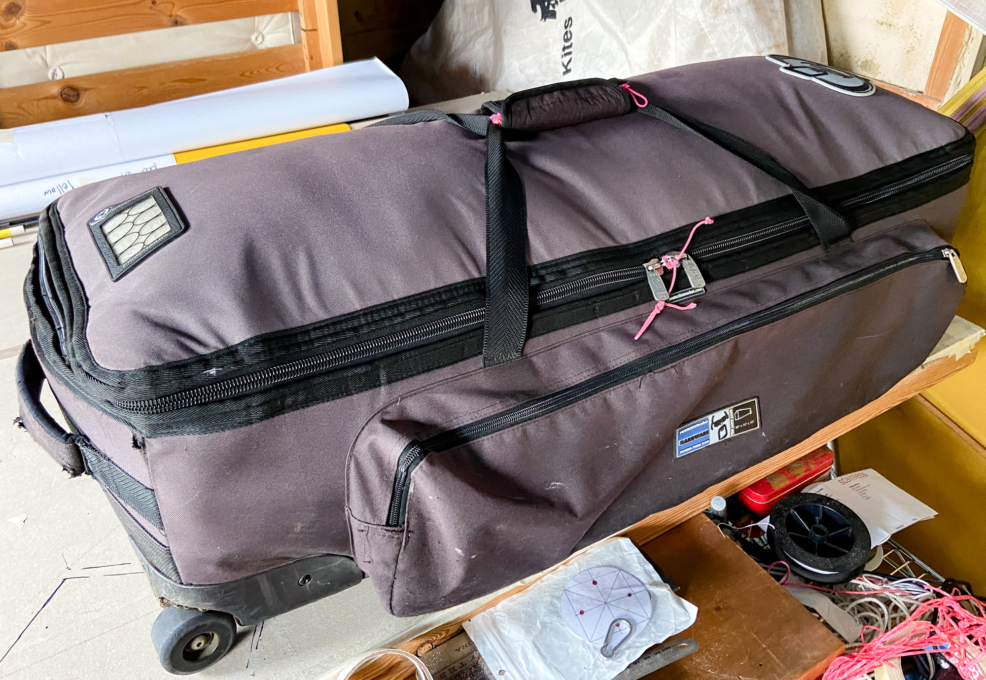 I had forgotten that one of the straps on the Ski Board Bag for JMH kites had worn badly for the second time. A piece of Rev Bag strap was a good match for a semi permanent repair.