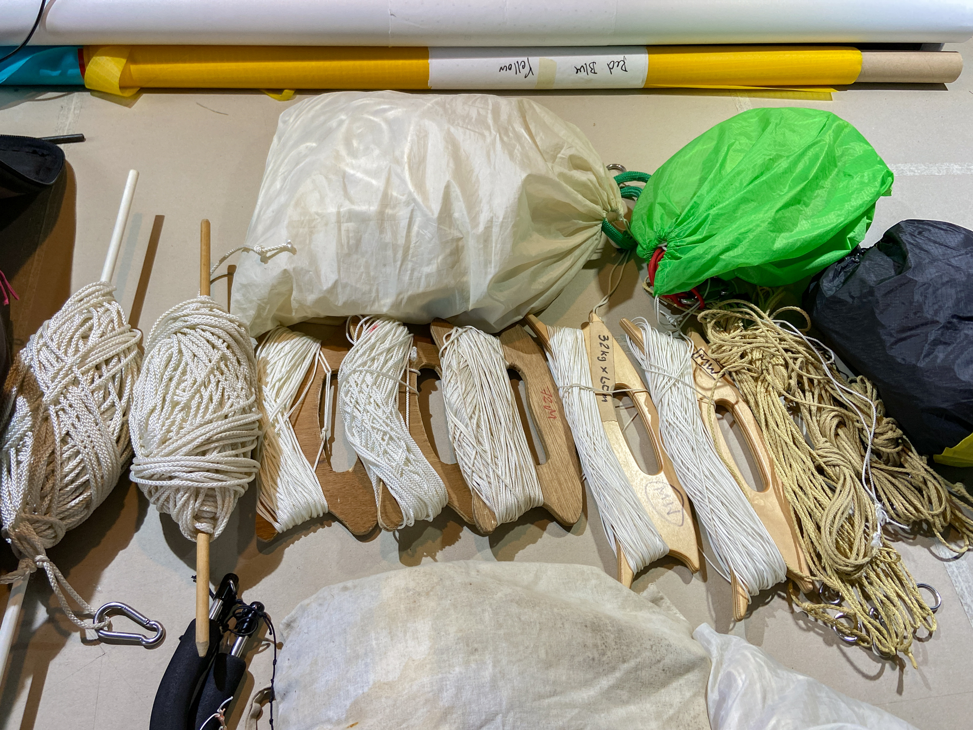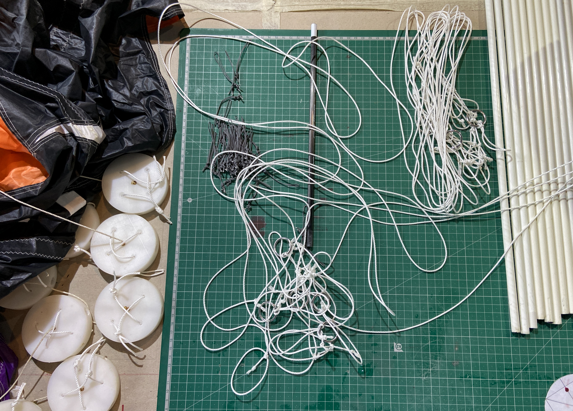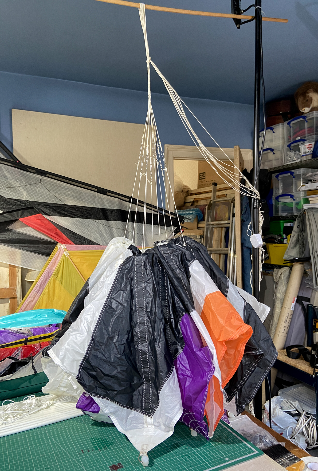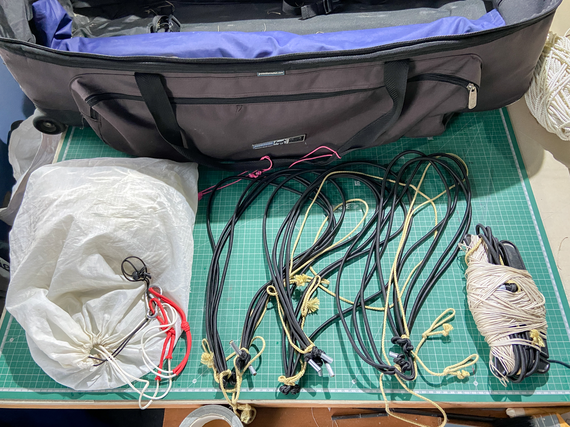 The Double Malay --- pockets resewn and spare bridle lines with prusik loops prepared, attached to bag closure. Three put in parallel with existing lines for testing as at September 2023. --- Confirmed 10/04/2024.--- JMH Kites Bag