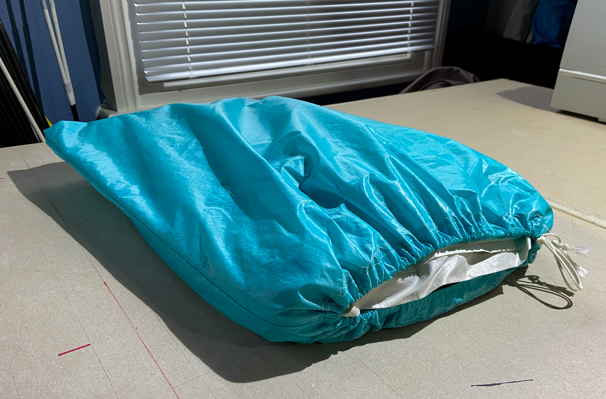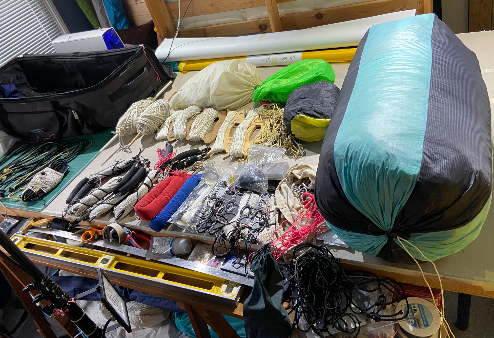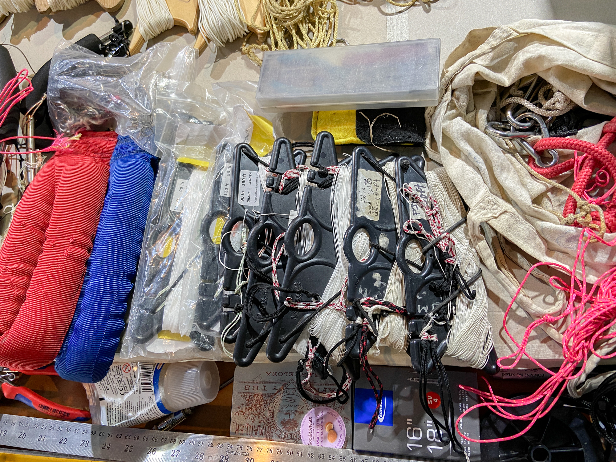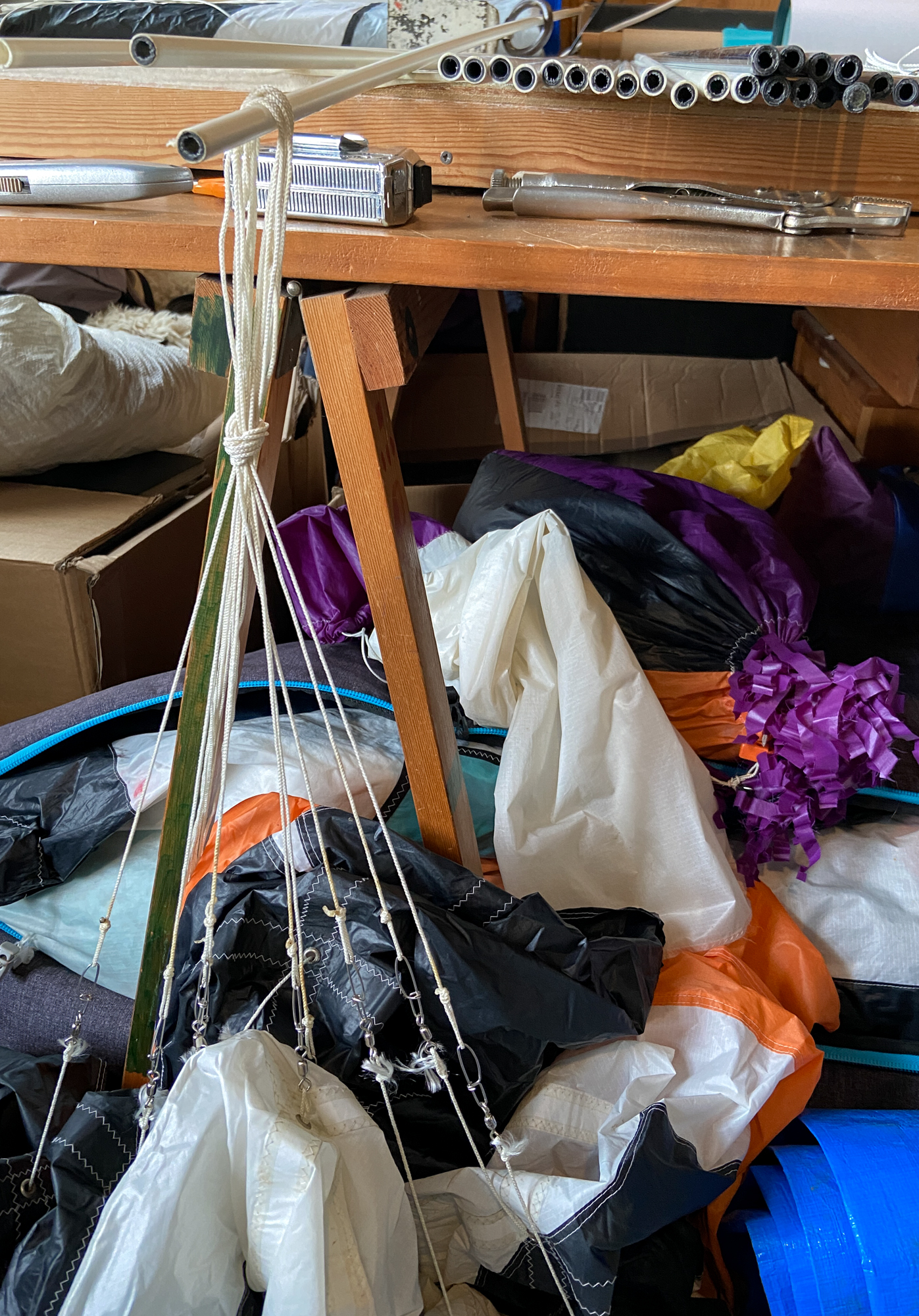The Double Malay --- pockets resewn and spare bridle lines with prusik loops prepared, attached to bag closure. Three put in parallel with existing lines for testing as at September 2023. --- Confirmed 10/04/2024.--- JMH Kites Bag