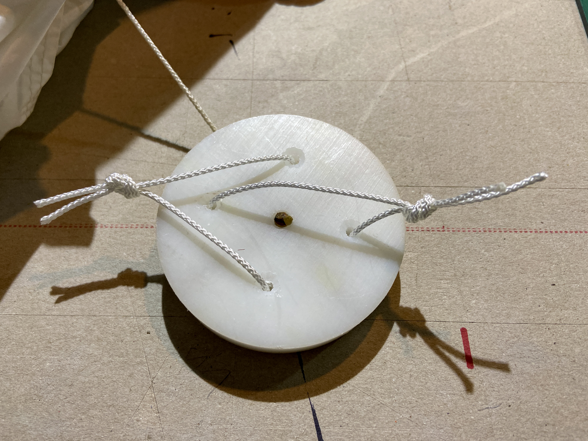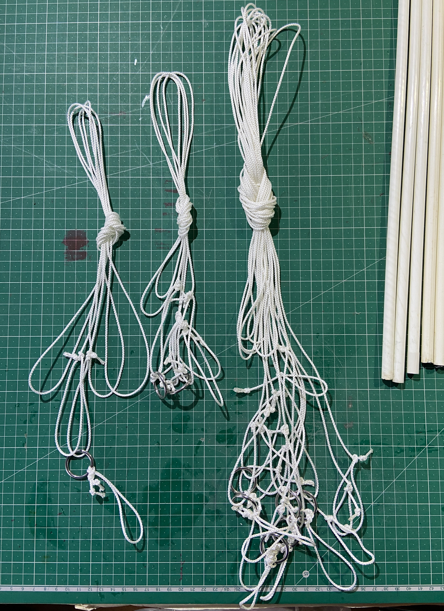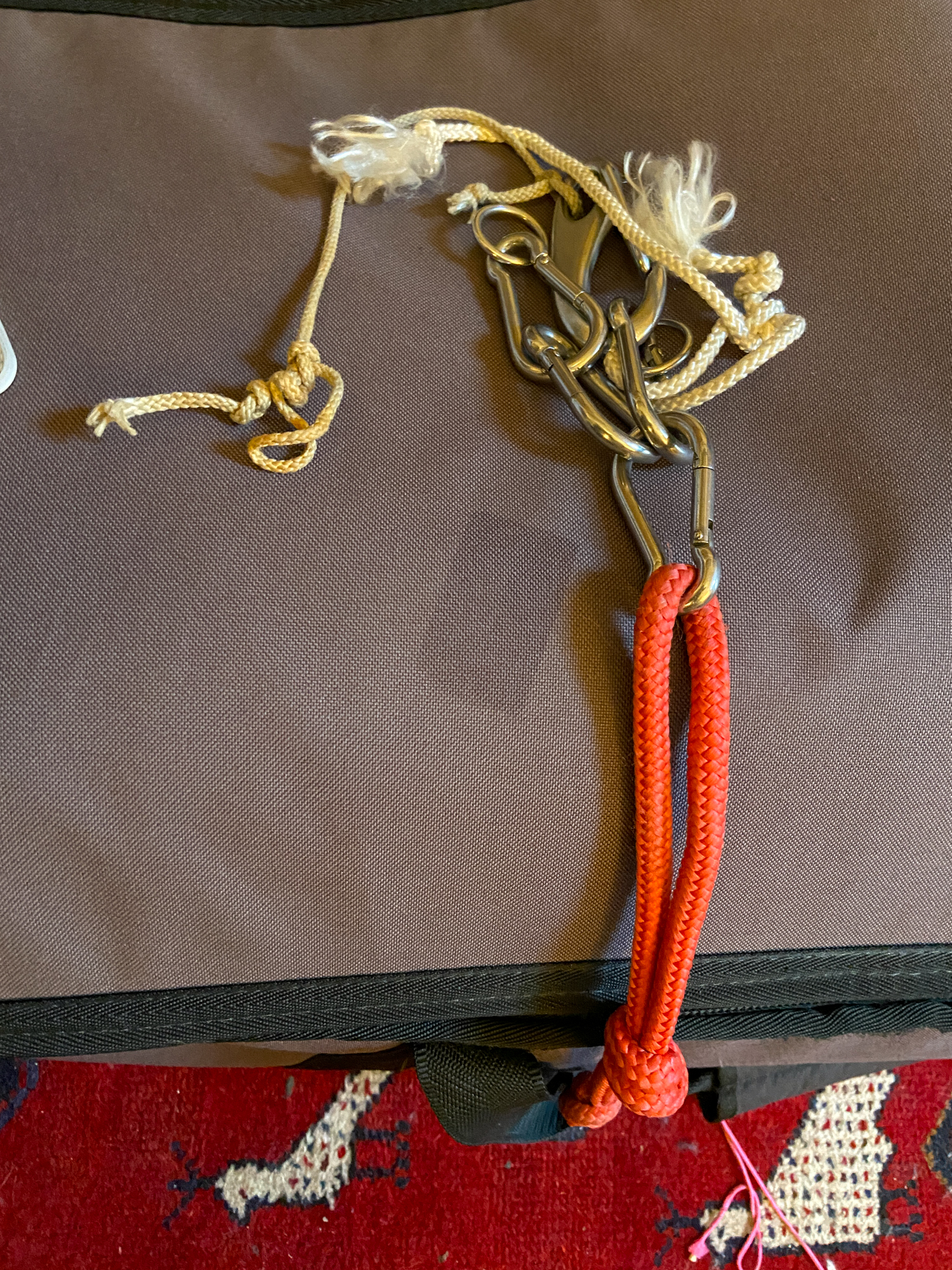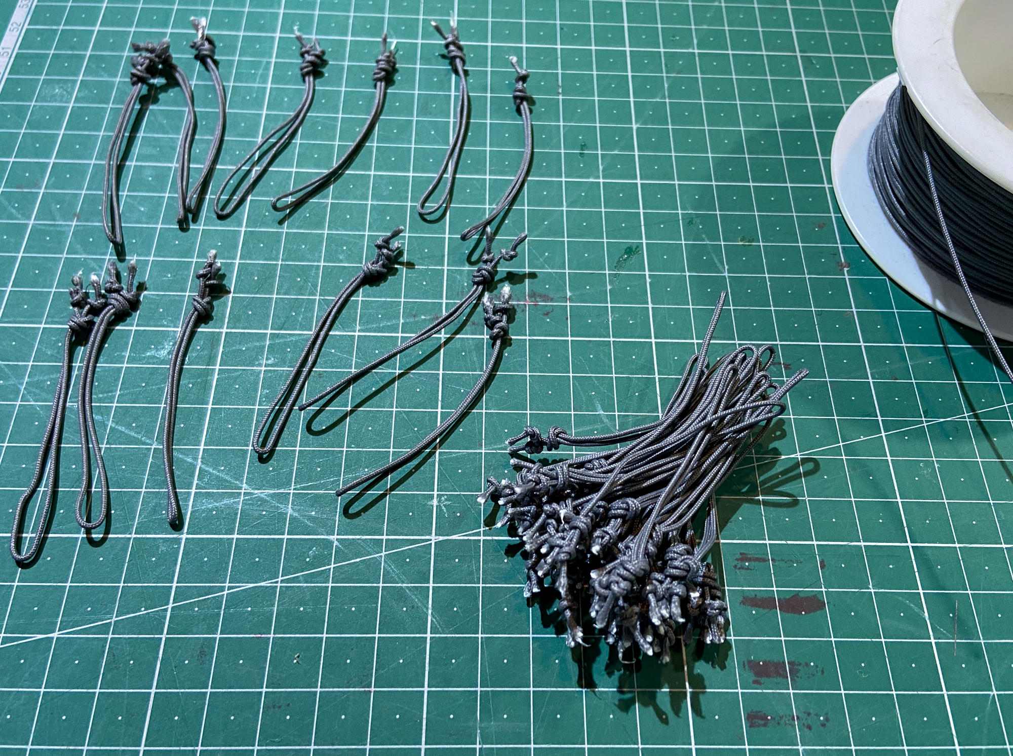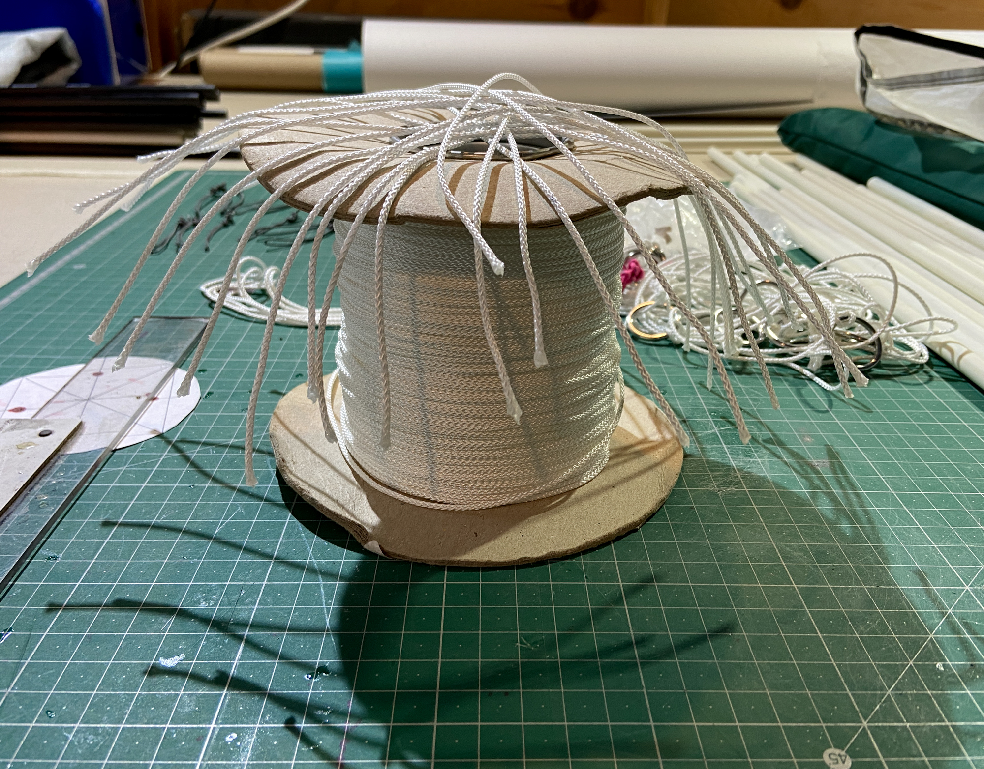 Spares made and plugged. Previously started bow lines reconfigured for larks head connections..