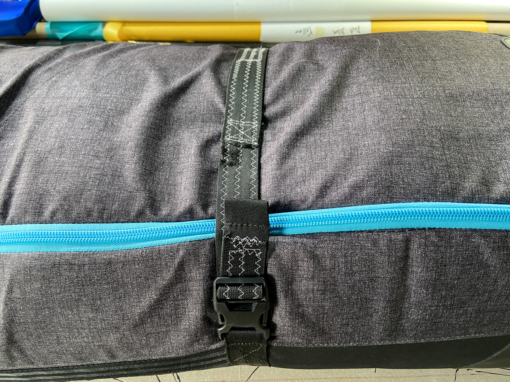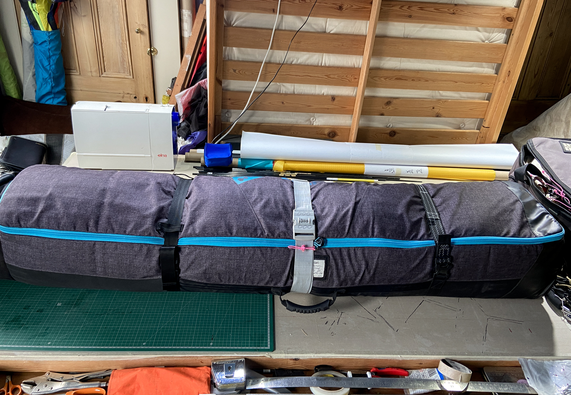 I had forgotten that one of the straps on the Ski Board Bag for JMH kites had worn badly for the second time. A piece of Rev Bag strap was a good match for a semi permanent repair.