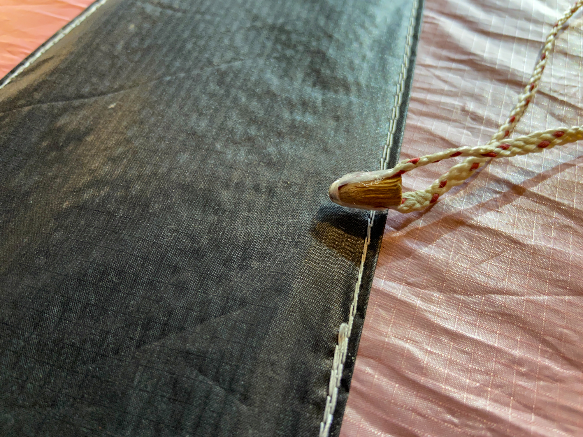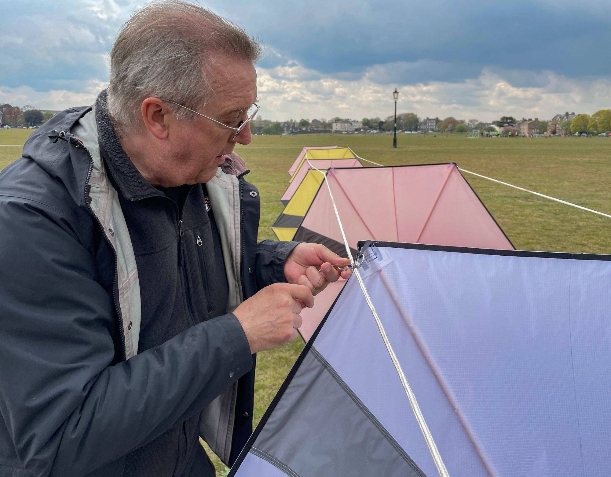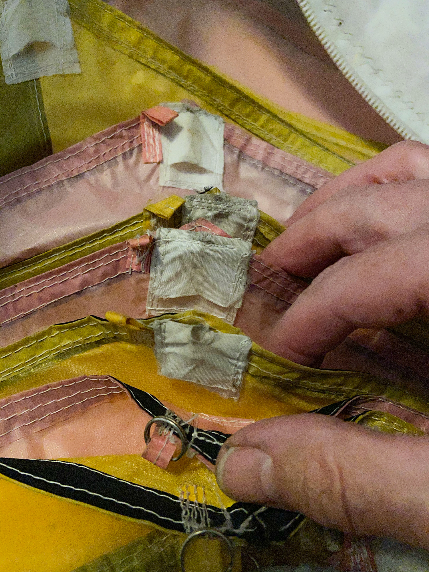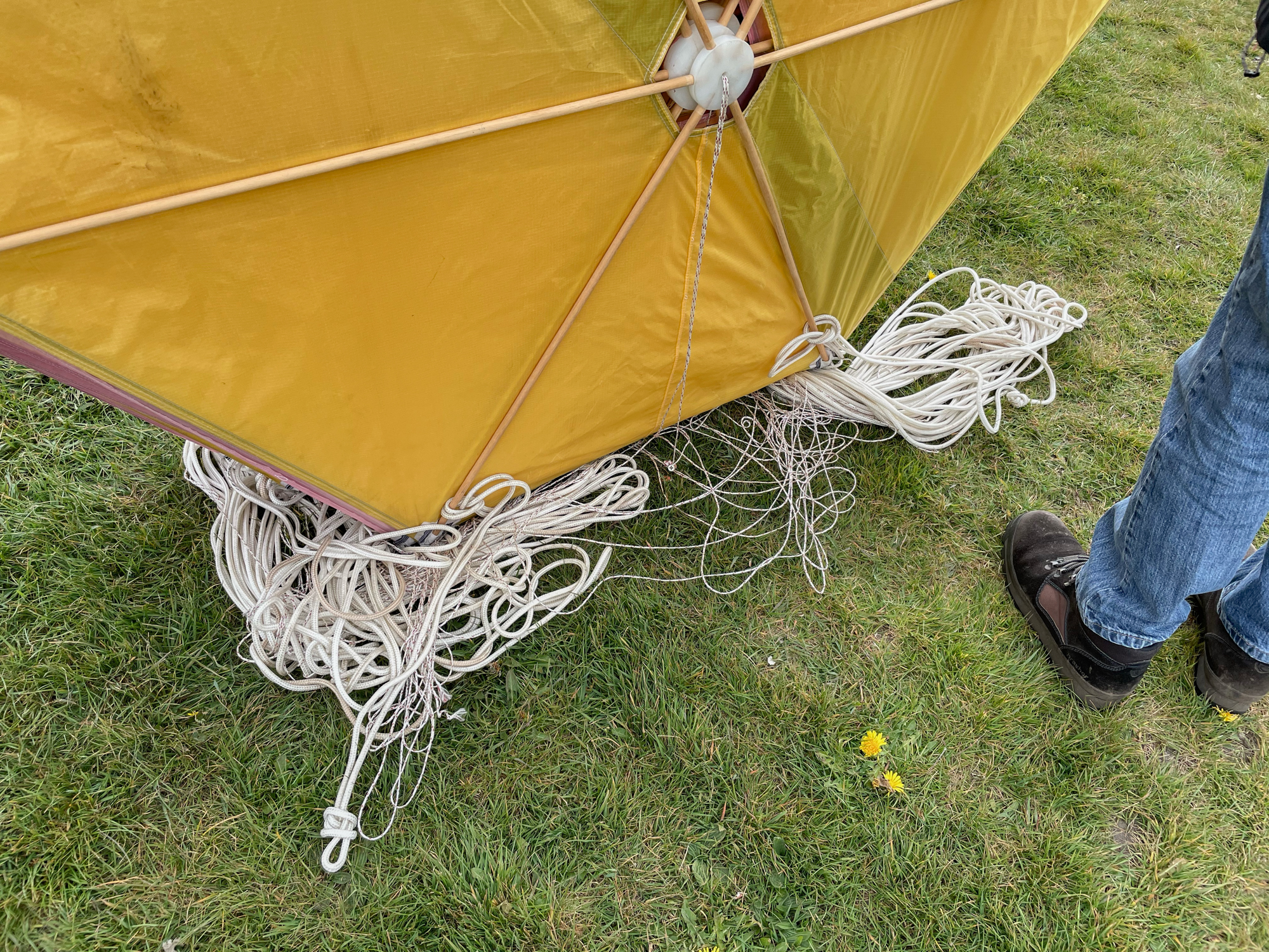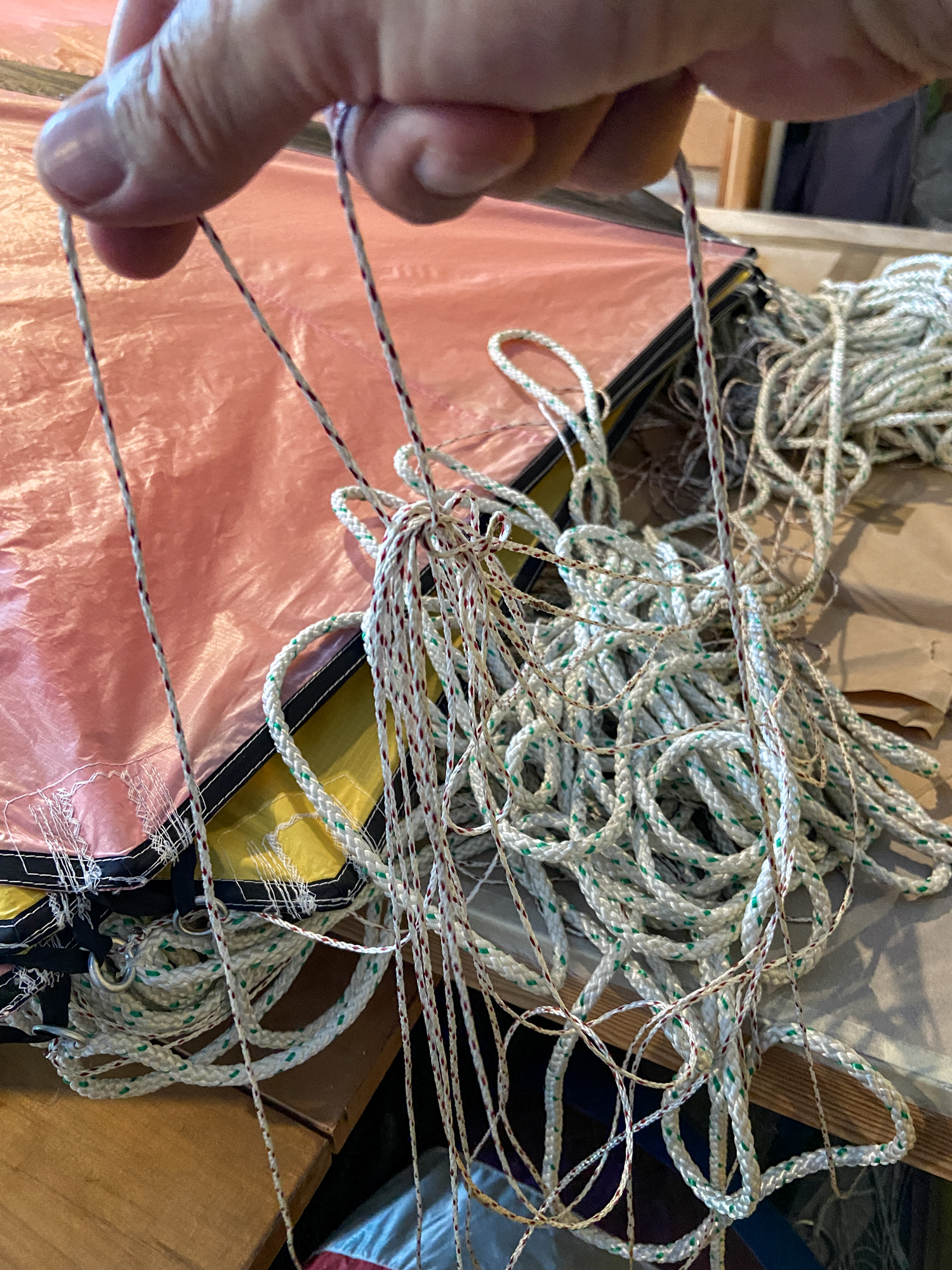 The main lines had been tied on the field and the bridle lines were looped in. In order to find the un-attached bridle loops everything had to be untied, not least, the apparent knots.