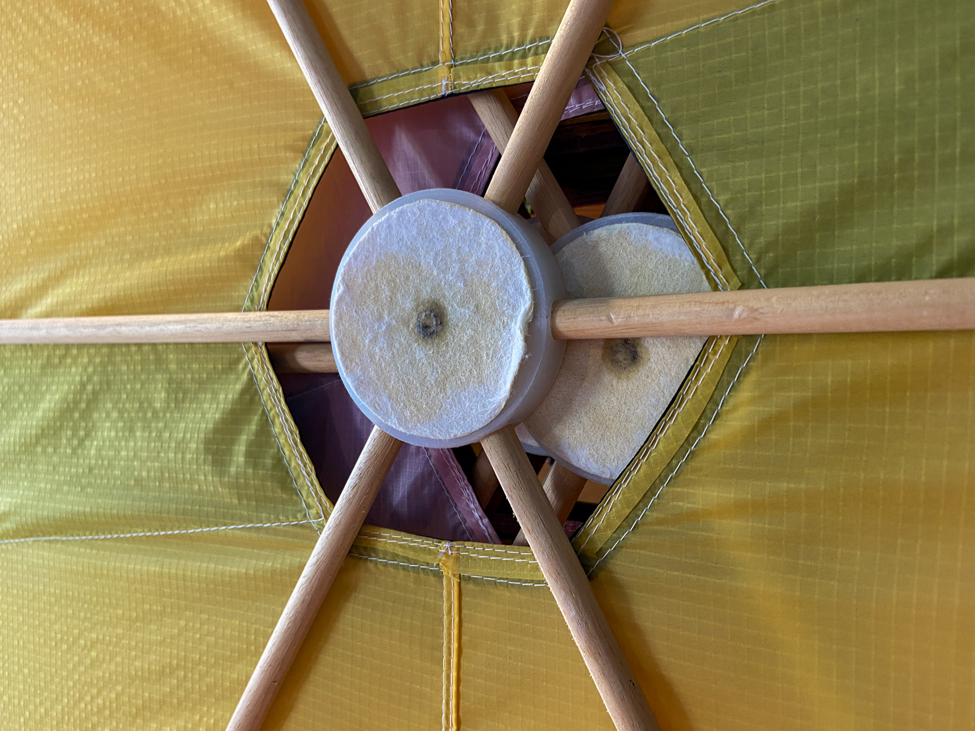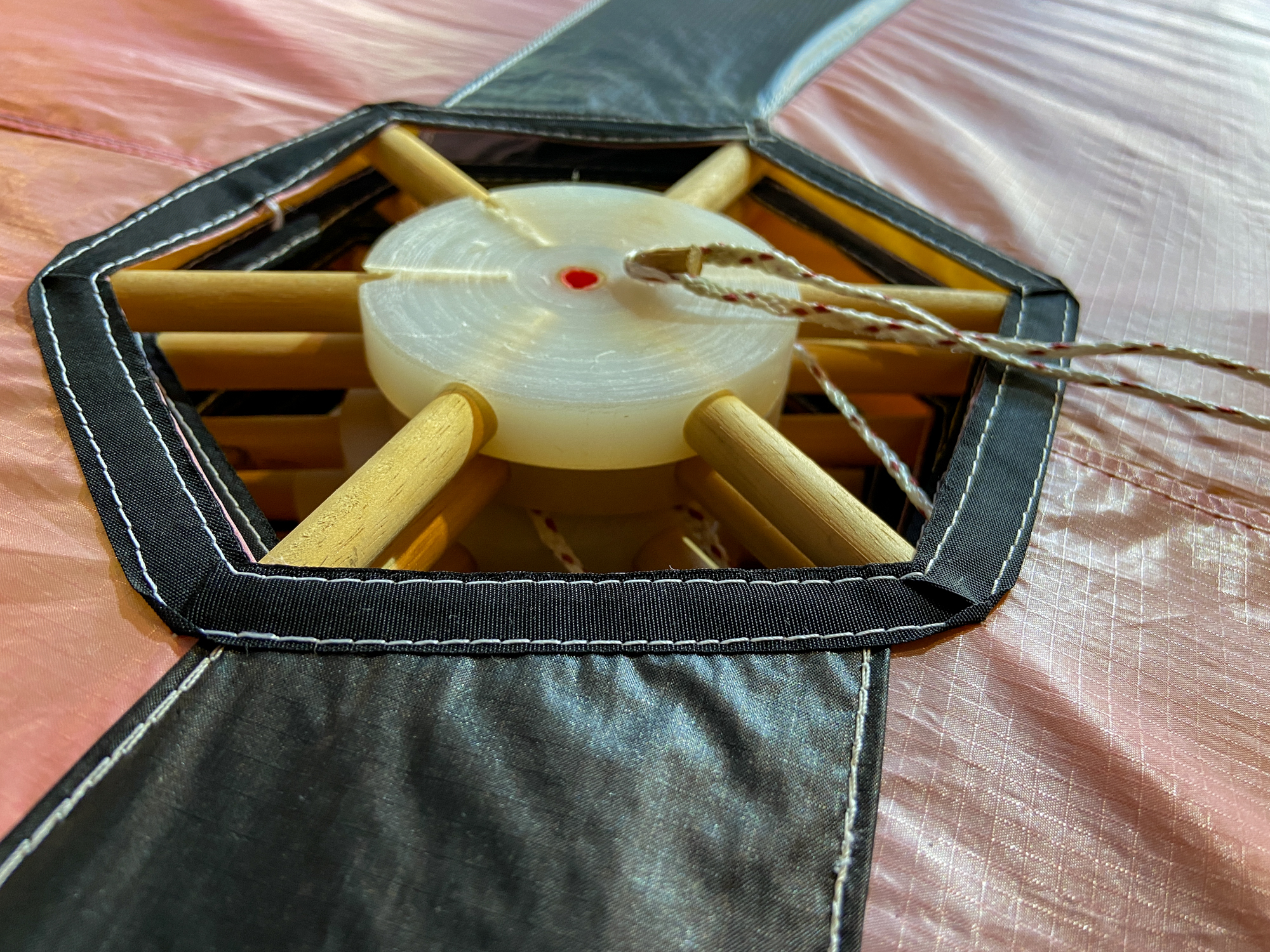 When preparing the lower stack for taking to the field to insert the missing sail I had noticed a twisted flying line and wondered how it would resolve. It did resolve without issue but a couple of the sails had been flipped and needed re-setting. Quite a few of the central fixing points had twists in the lines.
