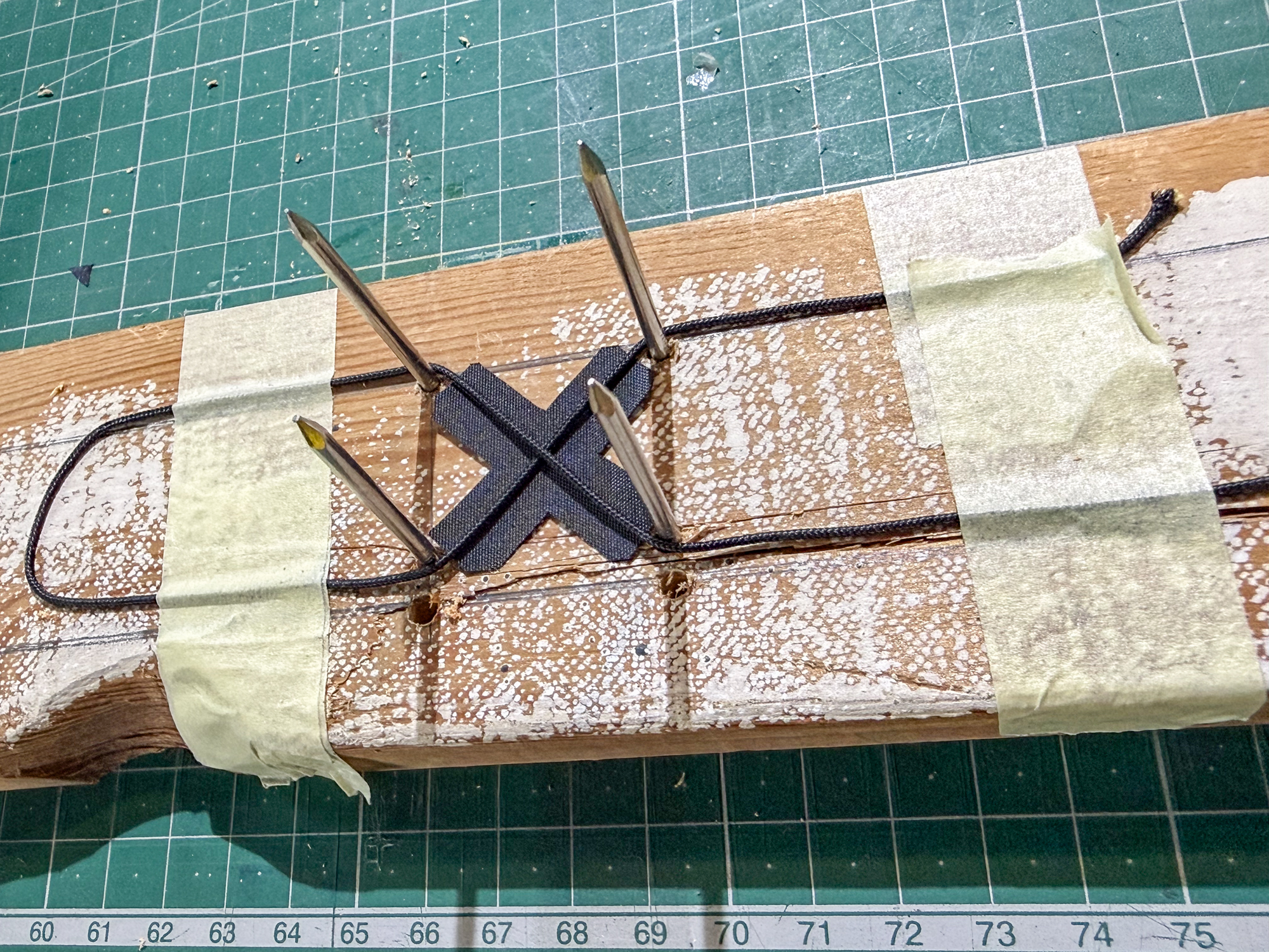 Tension was applied to the laced line and then re-set as sufficient spare line had not been allowed initially. It will have to be re-set again as the X at the vertical spar top has not been omitted.