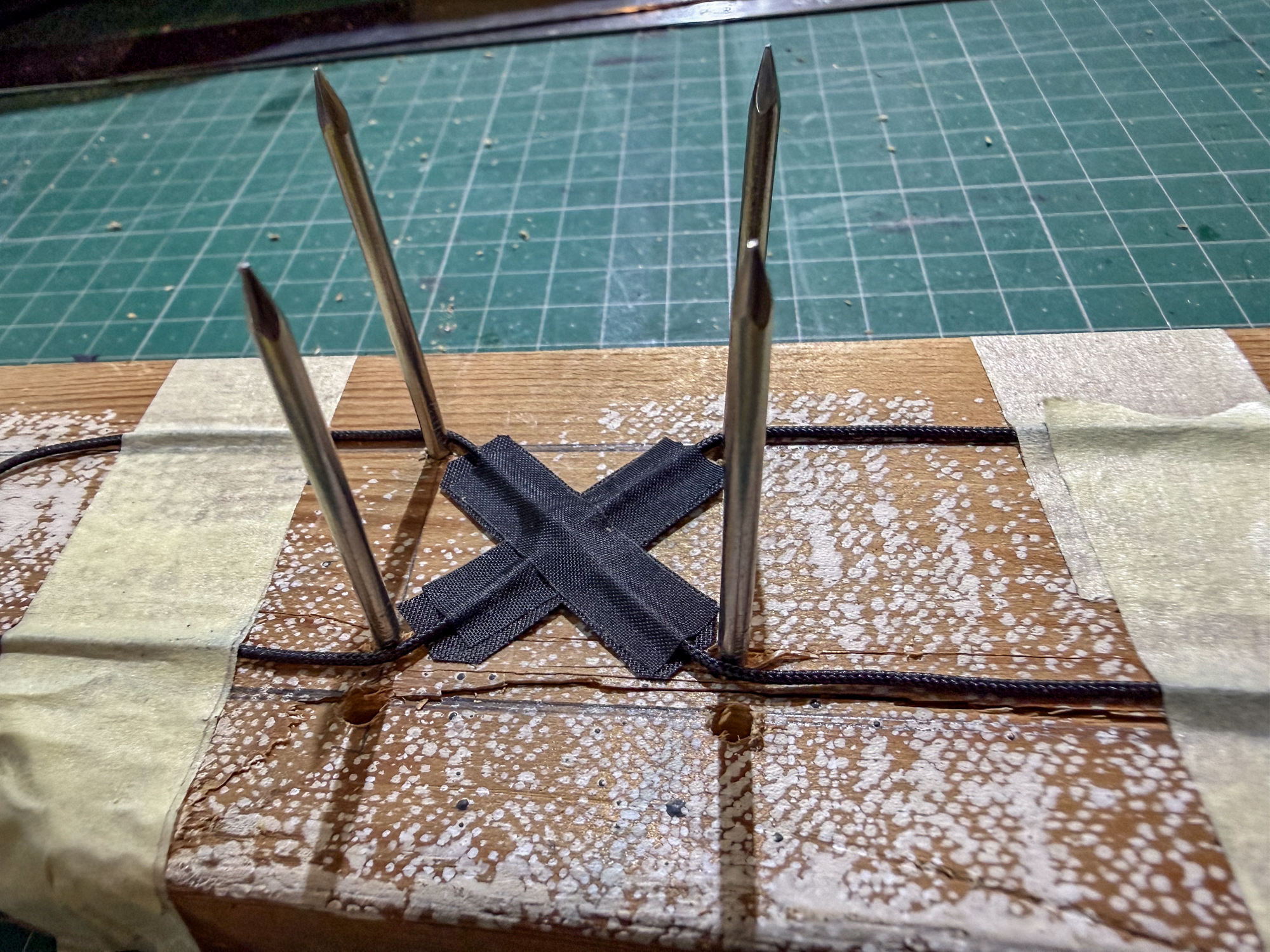 It may be possible to prepare multiple sets on the jig, initially laying in the dacron 'X' elements on the previous taped set.