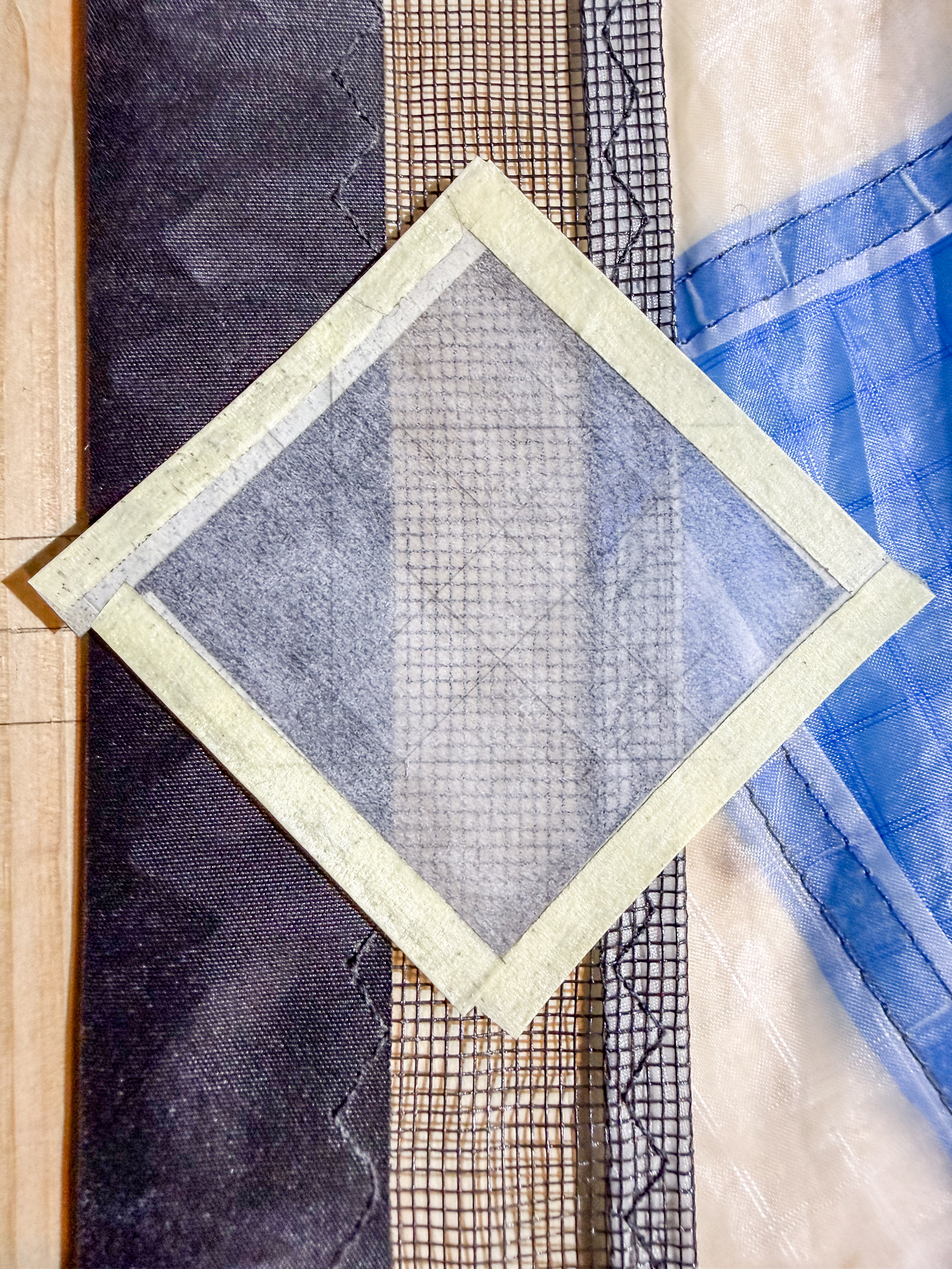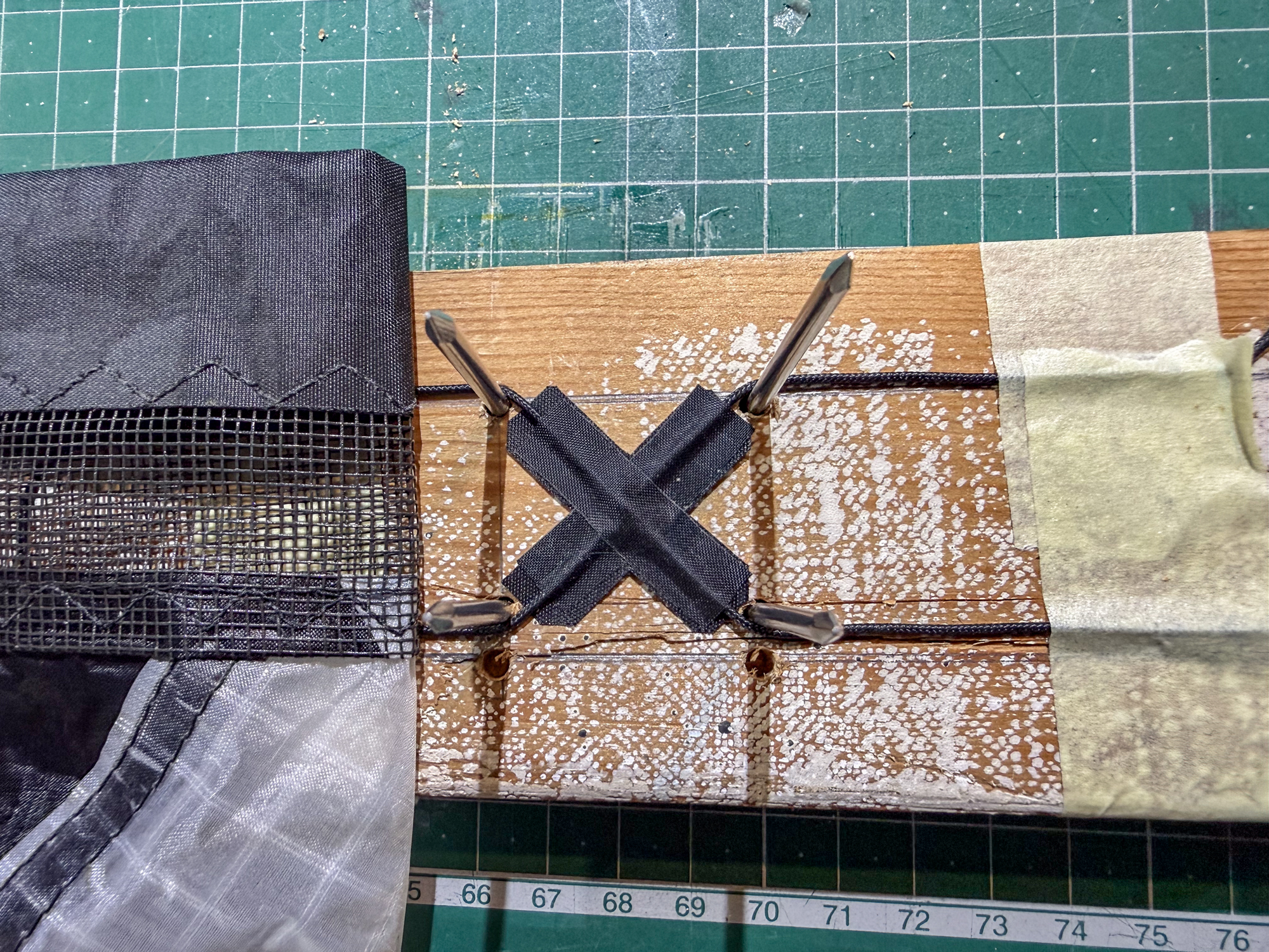 The possibility of retaining the 'X' but adding a dacron element was prototyped and it was recognised that the grain of the dacron should be in line with the legs of the 'X'.