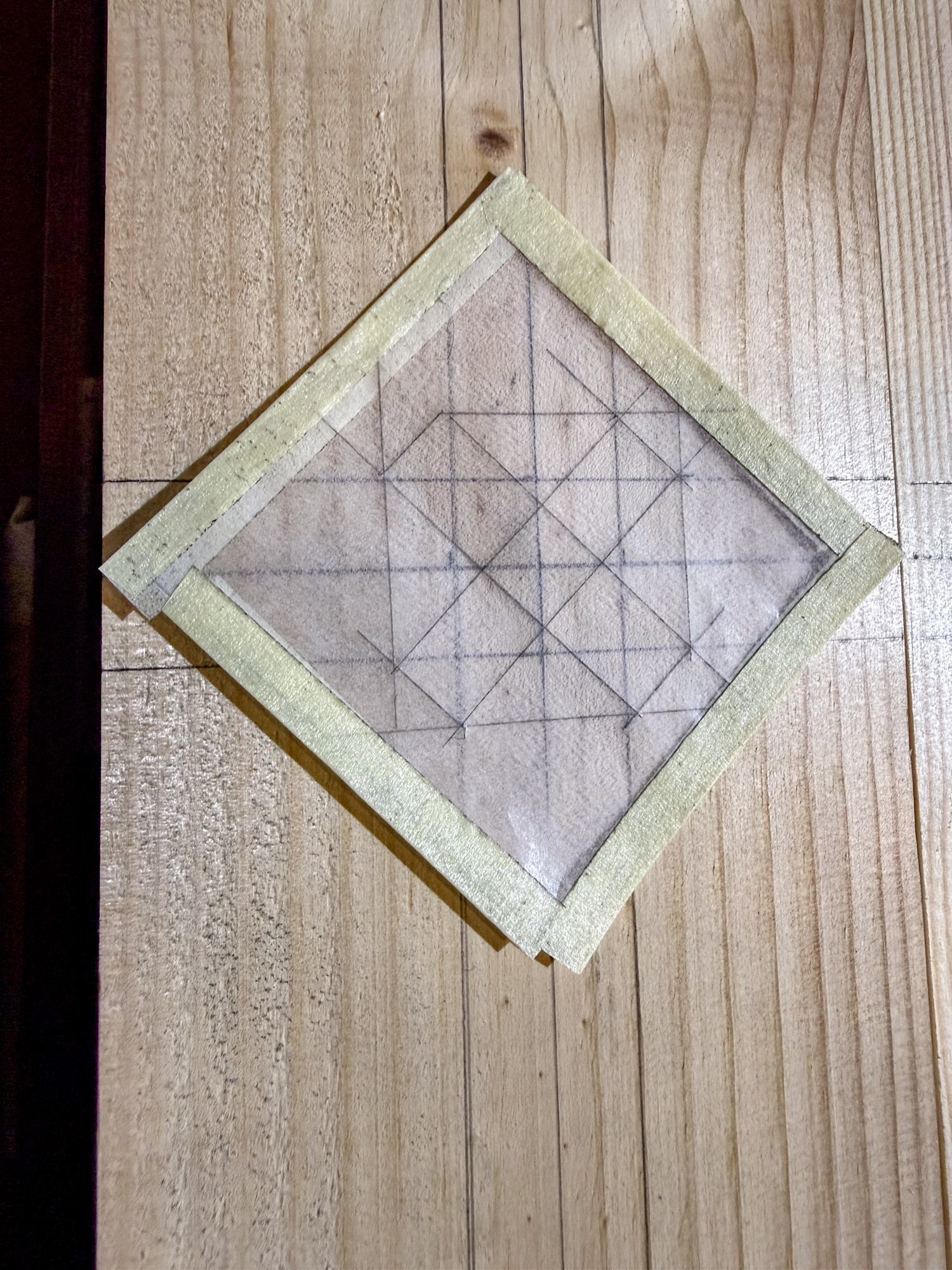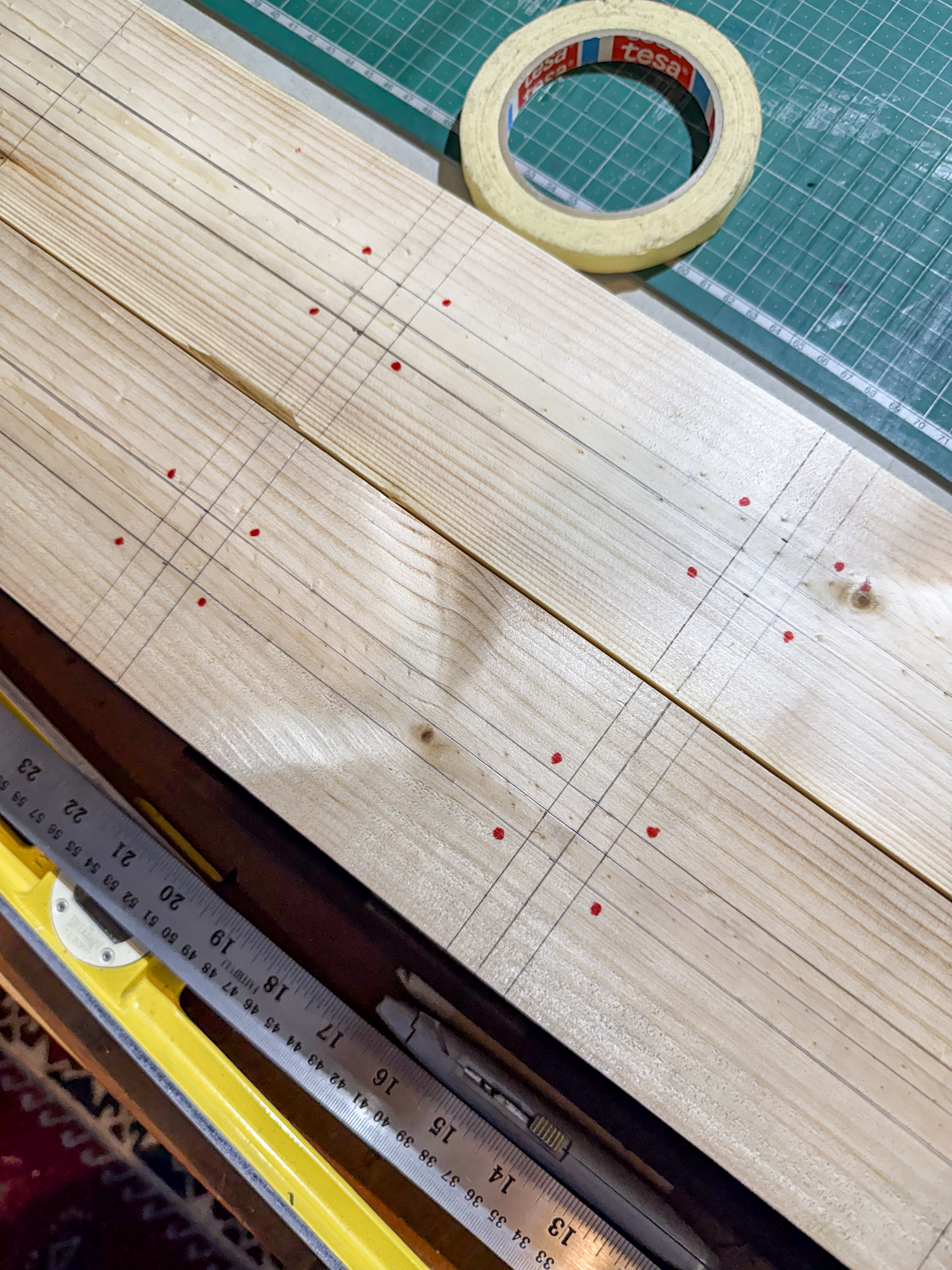 First marking up after adjusting the interval and then further guidelines added prior to marking the pin locations for drilling. A glassene template will be made to align the drilling centre points.