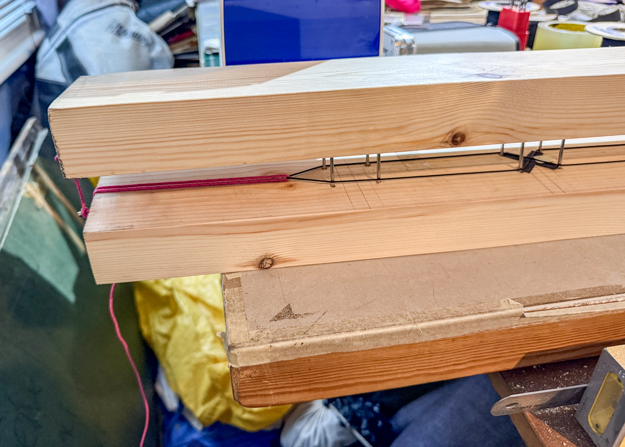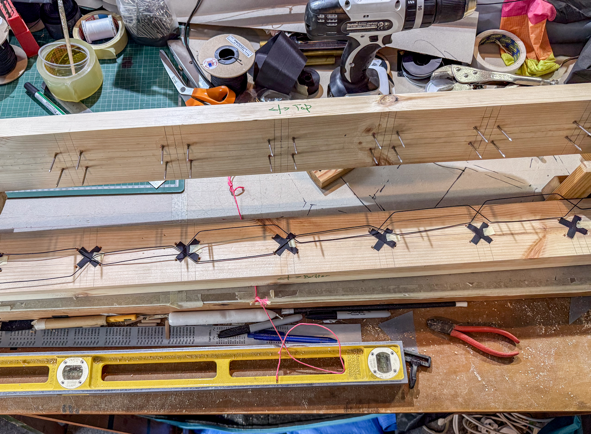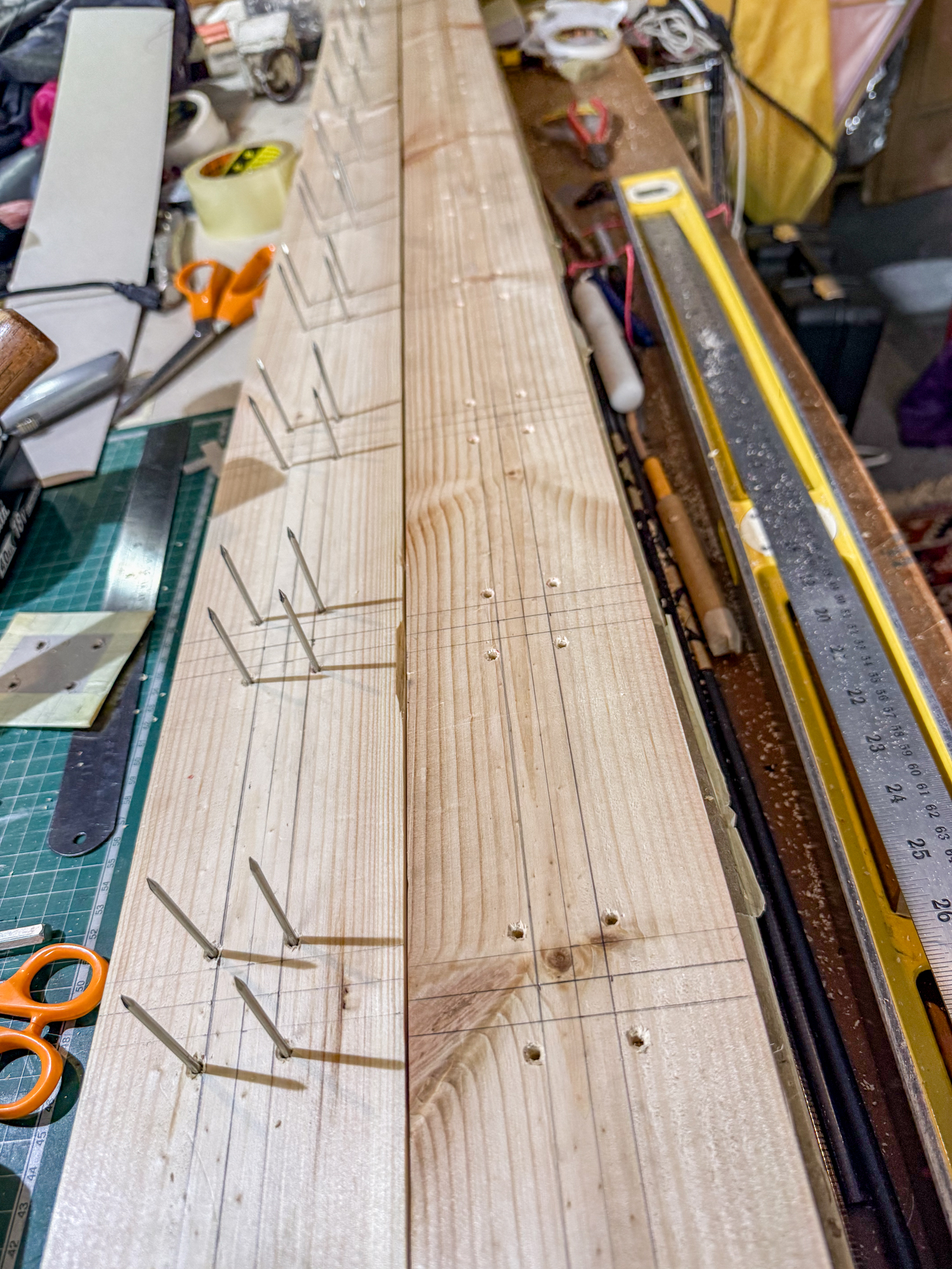The lost head nails have been reverse hammered into what would be the top half of jig. The bottom half will be drilled to accommodate the nail points to keep the whole structure stable.