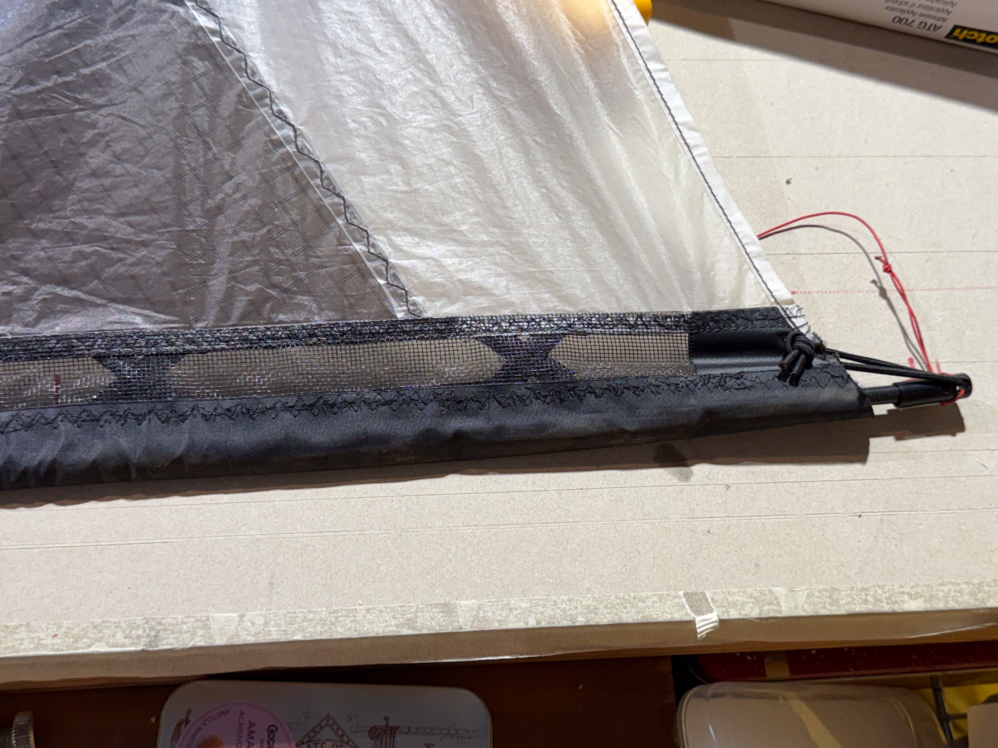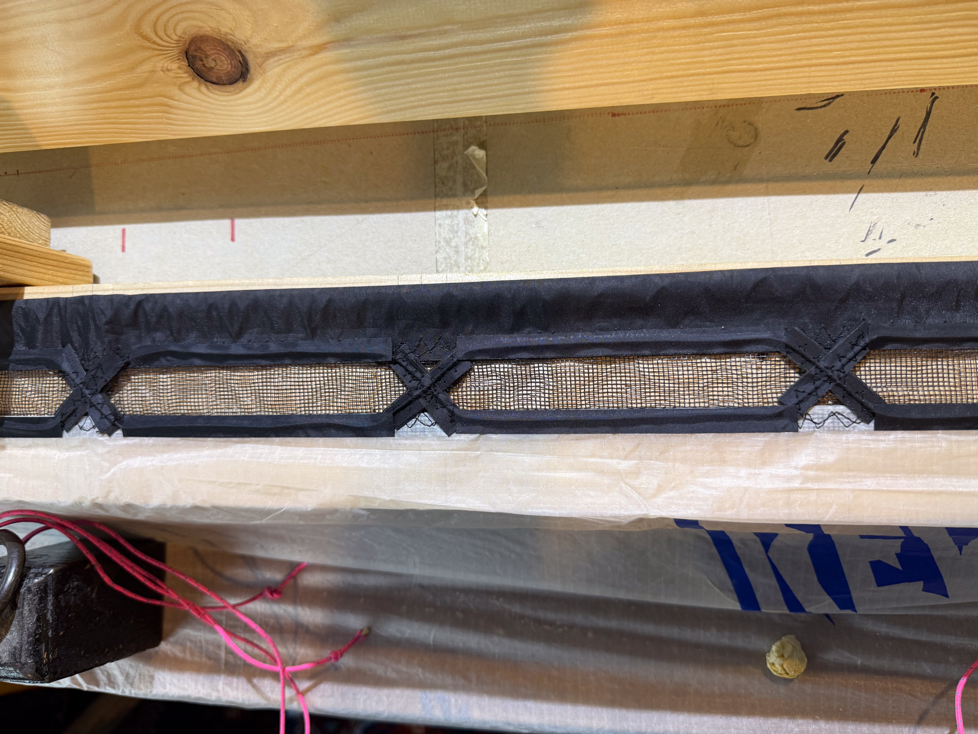 Once the sewing was done and loose ends trimmed the line was re-applied to the jig. The pressure on the lines was much higher than I had expected. The weights were left in place but I do not expect that there will be any stretch in the line, as such.