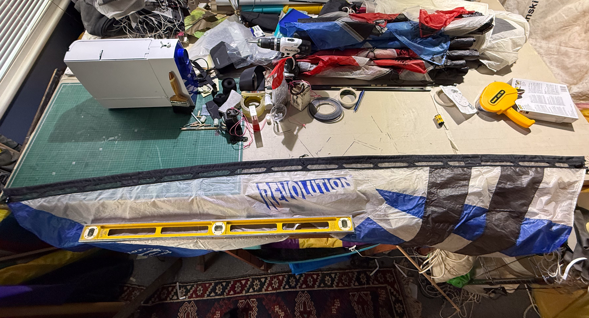 The sail was secured on the jig making sure it was centred and just slightly tensioned to pull out wrinkles. The jig top was put in place and the line assembly dropped onto the sail and secured.