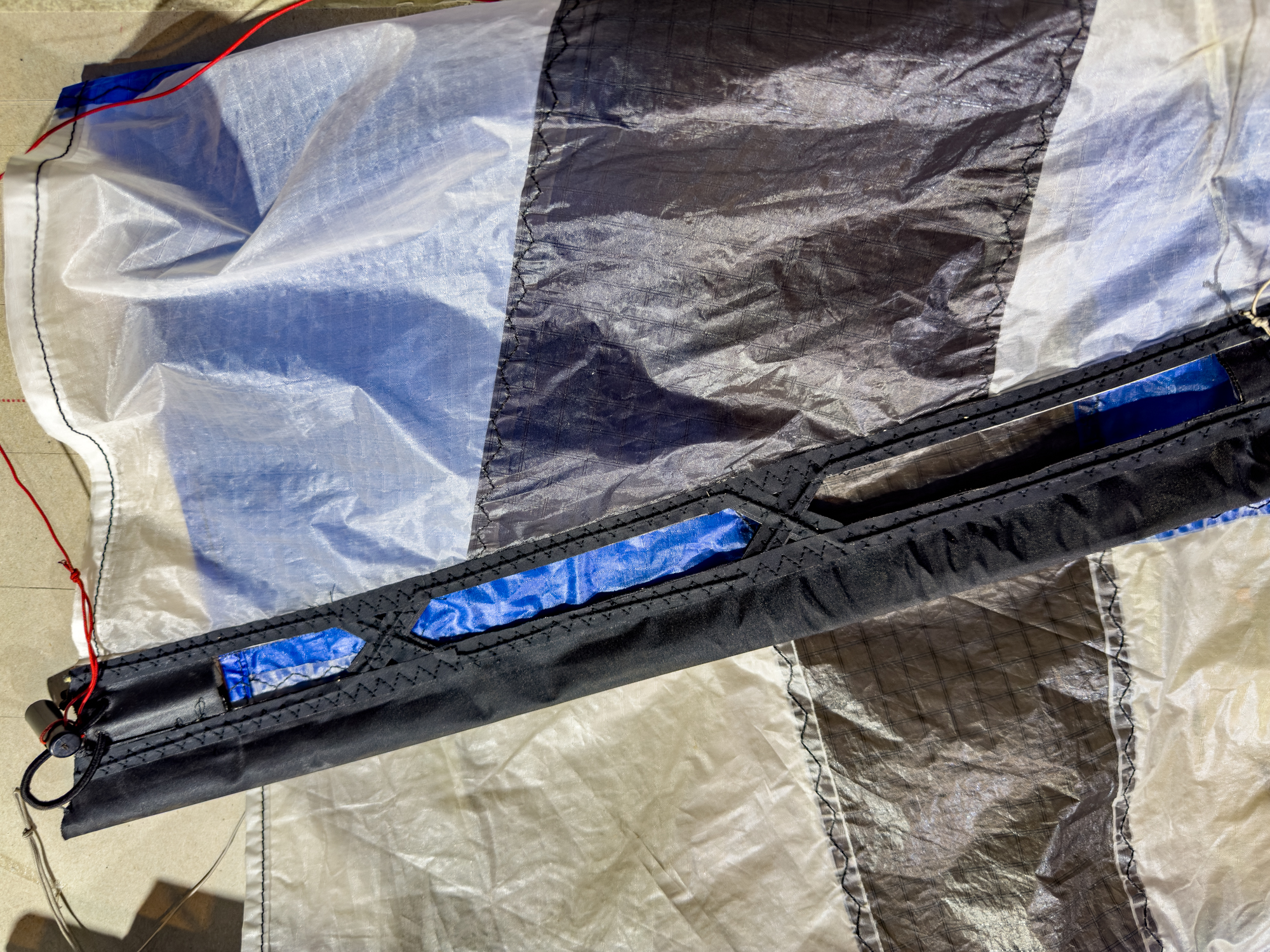 The bridle lines were re-set and it was noticed that the horizontal pressure on this sail was causing compression of the mesh in the last cell either end.