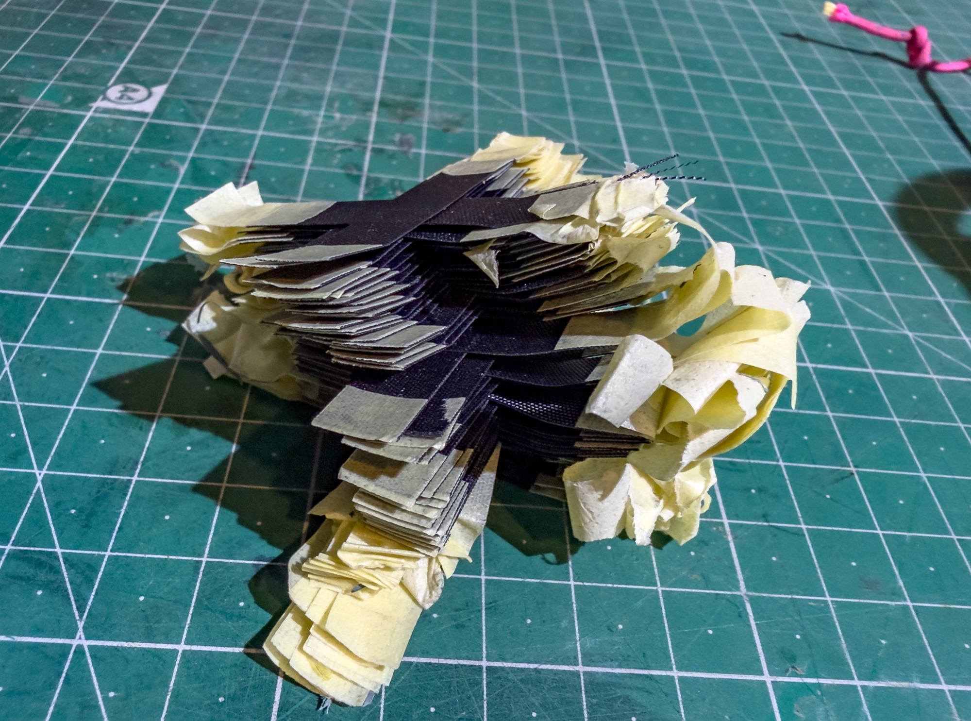 The end result is reasonably neat but the width of the dacron X elements may be increased just slightly so that there is no lightspace within the X shape and that the tips are fully engaged with the main final sewing line.