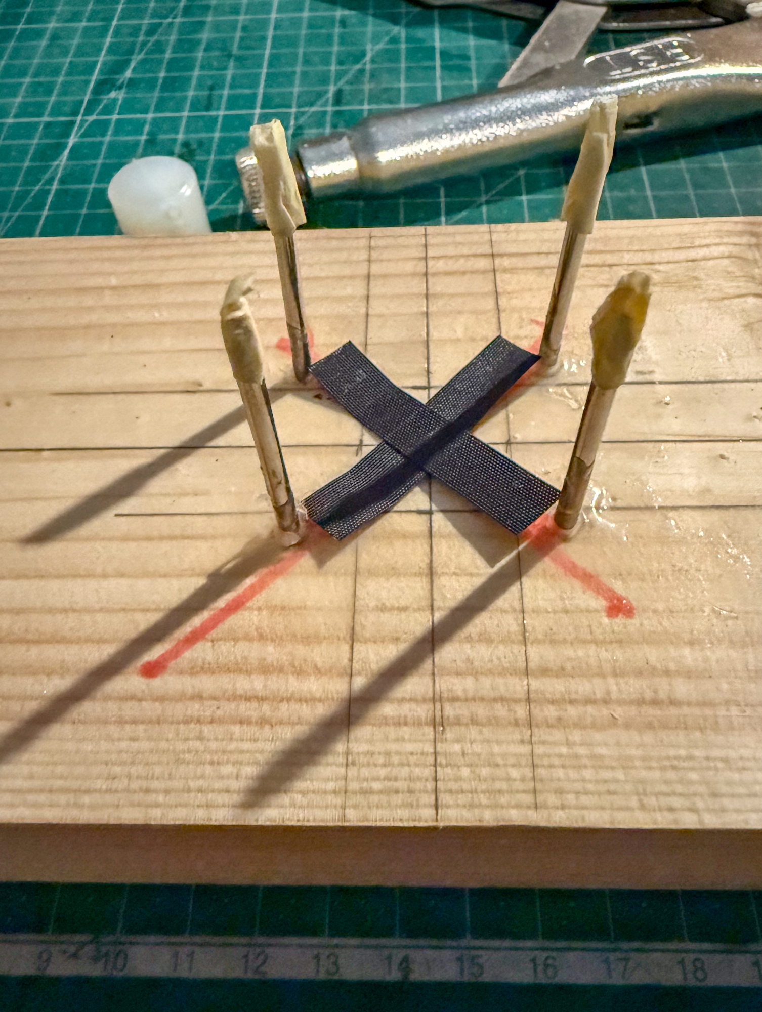 The slimmer elements should give a more clearly articulated 'X'. I will probably use adhesive to place them in the jig before laying the lines.