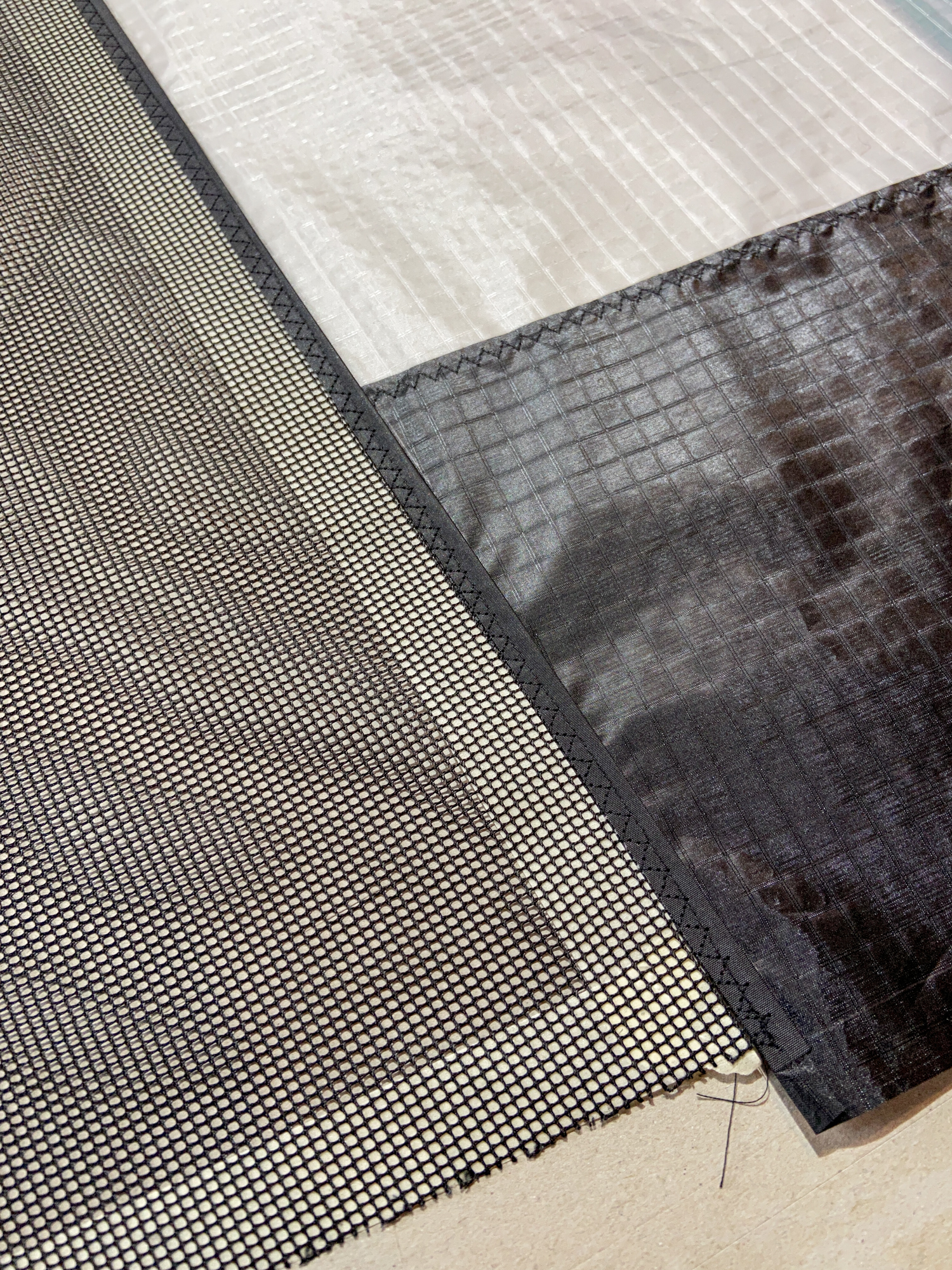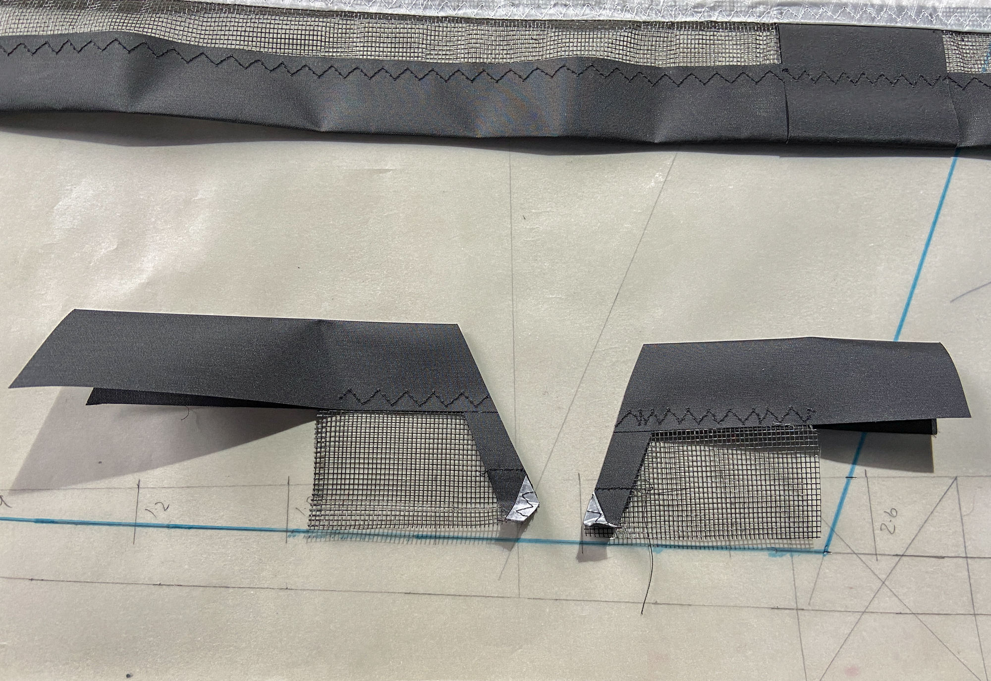 The mesh element was seen as disposable element that would be replaced by a grey sail component in the event that the sail does not work. The elements were cut carefully and hemmed with dacron producing a complete component.