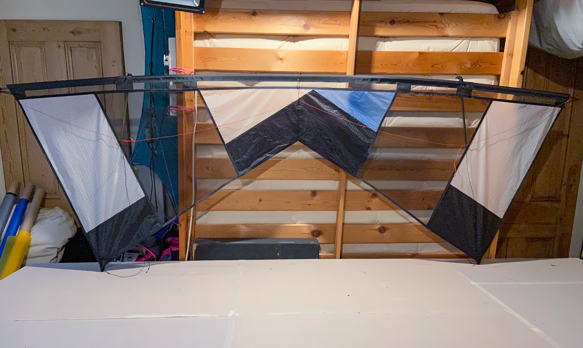 In 2022 needing a project involving the preparation of replacement leading edges I decided to re-address the original designs from 2008/2009 and 'invented' a transitional version. The project is being developed using a polyester mesh with a wider grain than the original Revolution leading edge mesh.