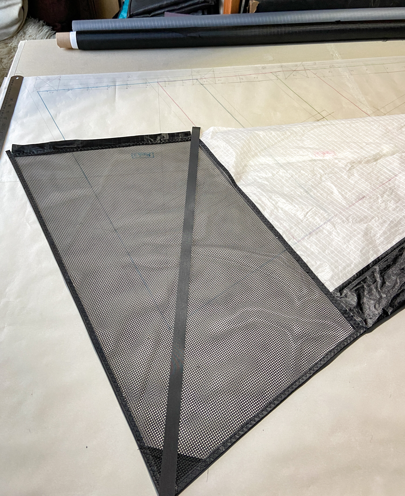 Blue Icarex arrived from Germany, 15th November 2022. All the components are now prepared for fabrication and the initial sewing of the Icarex is done, 16th November 2022.
