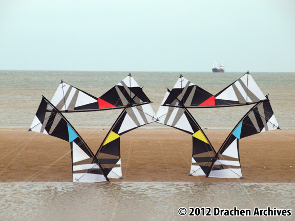 Take a moment to just look at Jørgen’s work; I like the fact that he didn’t try to invent new kite forms, instead, he arranged them in multiples, added simple details, and always made them graphically unique. One of his earliest kites (which is shown in the slideshow) was the collapsible box-train, “Stairway to Heaven,” a kite that most would not attempt and few have made so beautiful. As you can see, he made a number of trains, but his were noteworthy because of the way he manipulated simple, basic kite forms and arranged them into visually appealing and aerodynamically surprising creations.