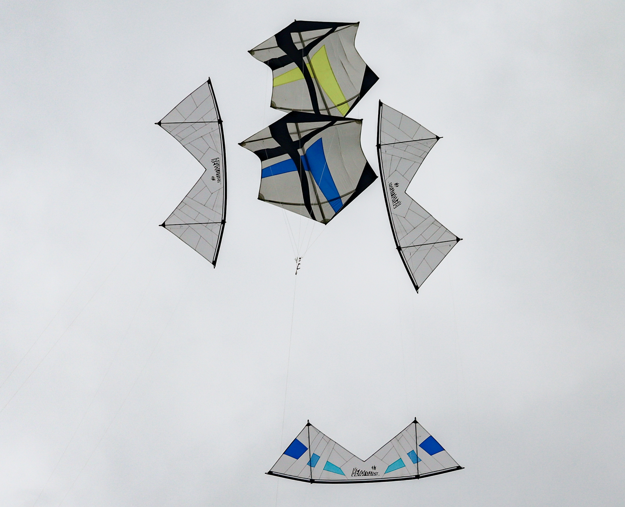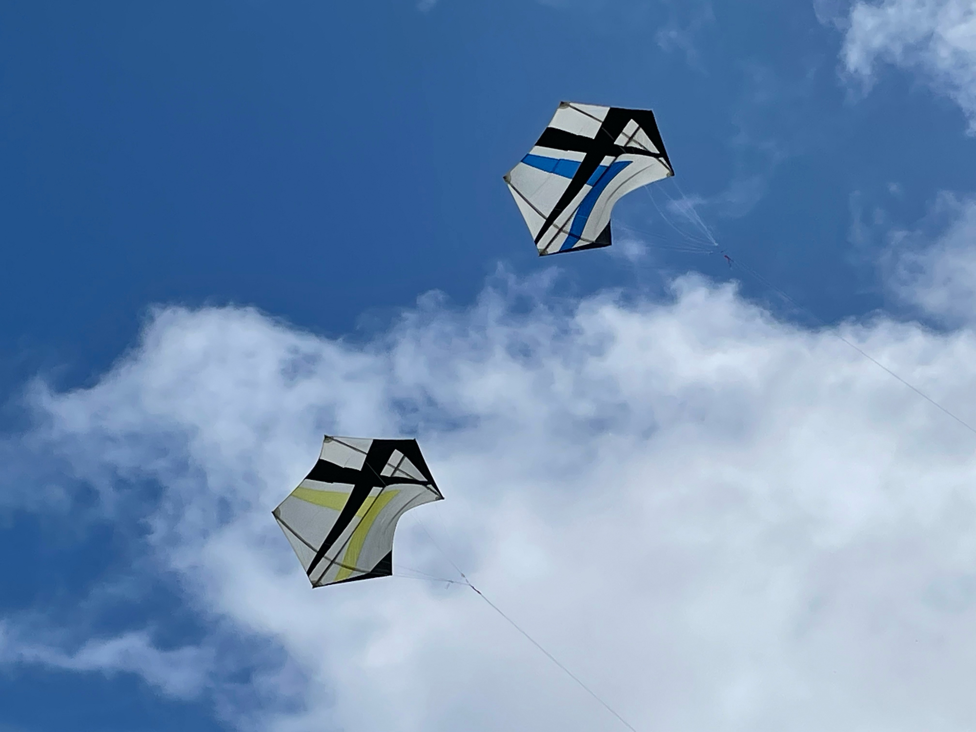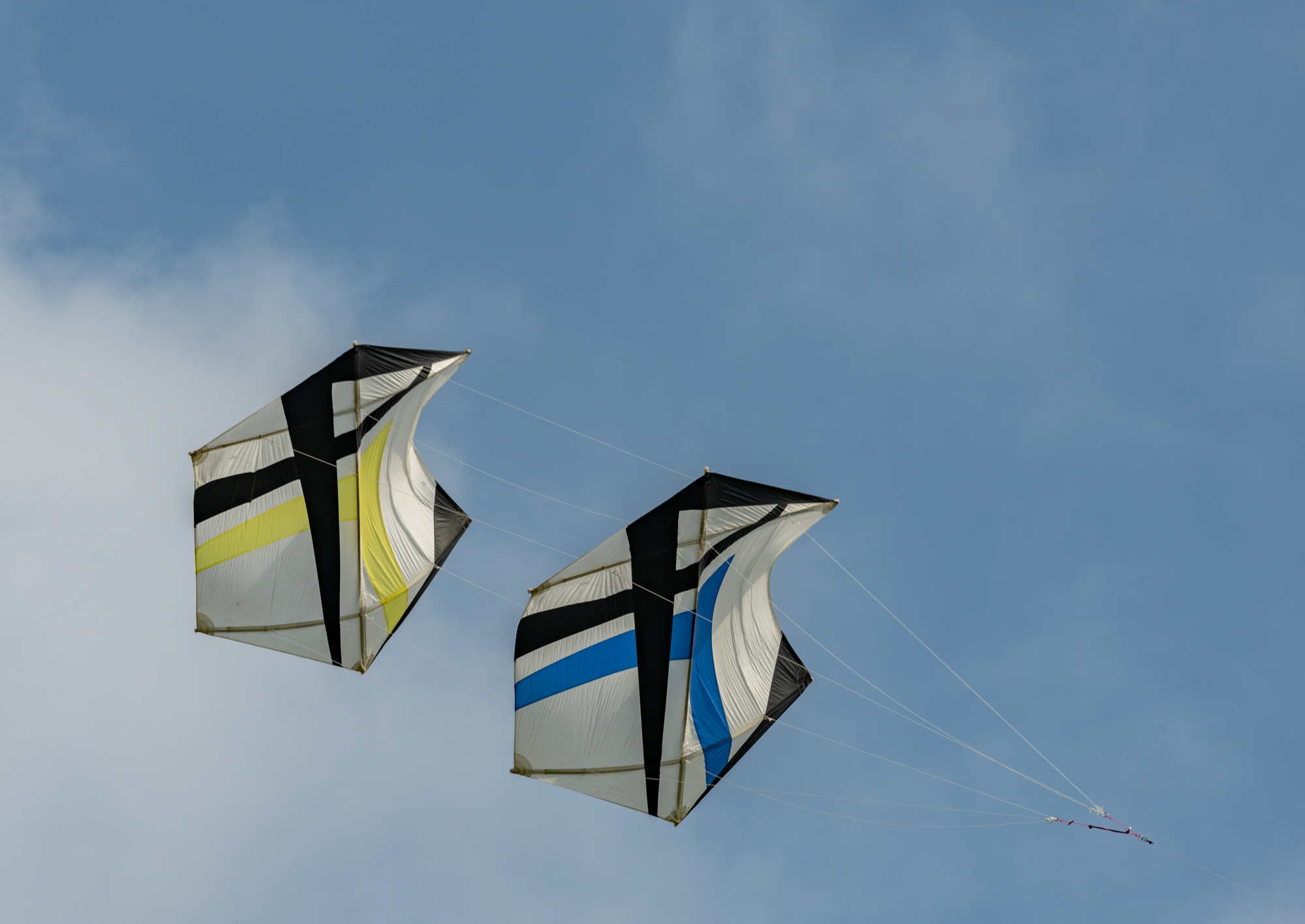 Bridle test flight for the dark blue sail. Both kites have a peg in the top bridle set. Yellow, one clove hitch, blue, one clove hitch plus 1/2 hitch!